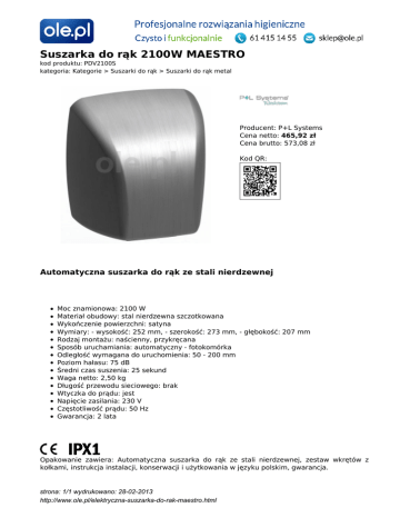 Suszarka do rąk 2100W MAESTRO kod produktu: PDV2100S kategoria: Kategorie > Suszarki do rąk > Suszarki do rąk metal Producent: P+L Systems Cena netto: 465,92 zł Cena brutto: 573,08 zł Kod QR: Automatyczna suszarka do rąk ze stali nierdzewnej Moc znamionowa: 2100 W Materiał obudowy: stal nierdzewna szczotkowana Wykończenie powierzchni: satyna Wymiary: - wysokość: 252 mm, - szerokość: 273 mm, - głębokość: 207 mm Rodzaj montażu: naścienny, przykręcana Sposób uruchamiania: automatyczny - fotokomórka Odległość wymagana do uruchomienia: 50 - 200 mm Poziom hałasu: 75 dB Średni czas suszenia: 25 sekund Waga netto: 2,50 kg Długość przewodu sieciowego: brak Wtyczka do prądu: jest Napięcie zasilania: 230 V Częstotliwość prądu: 50 Hz Gwarancja: 2 lata Opakowanie zawiera: Automatyczna suszarka do rąk ze stali nierdzewnej, zestaw wkrętów z kołkami, instrukcja instalacji, konserwacji i użytkowania w języku polskim, gwarancja. strona: 1/1 wydrukowano: 28-02-2013 http://www.ole.pl/elektryczna-suszarka-do-rak-maestro.html