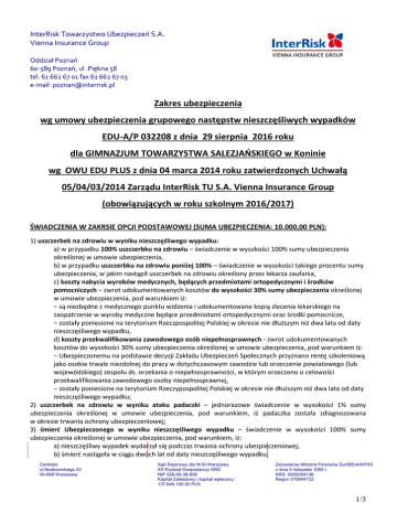InterRisk Towarzystwo Ubezpieczeń S.A. Vienna Insurance Group Oddział Poznań 60-589 Poznań, ul .Piękna 58 tel. 61 662 67 01 fax 61 662 67 03 e-mail: [email protected] Zakres ubezpieczenia wg umowy ubezpieczenia grupowego następstw nieszczęśliwych wypadków EDU-A/P 032208 z dnia 29 sierpnia 2016 roku dla GIMNAZJUM TOWARZYSTWA SALEZJAŃSKIEGO w Koninie wg OWU EDU PLUS z dnia 04 marca 2014 roku zatwierdzonych Uchwałą 05/04/03/2014 Zarządu InterRisk TU S.A. Vienna Insurance Group (obowiązujących w roku szkolnym 2016/2017) ŚWIADCZENIA W ZAKRSIE OPCJI PODSTAWOWEJ (SUMA UBEZPIECZENIA: 10.000,00 PLN): 1) uszczerbek na zdrowiu w wyniku nieszczęśliwego wypadku: a) w przypadku 100% uszczerbku na zdrowiu – świadczenie w wysokości 100% sumy ubezpieczenia określonej w umowie ubezpieczenia, b) w przypadku uszczerbku na zdrowiu poniżej 100% – świadczenie w wysokości takiego procentu sumy ubezpieczenia, w jakim nastąpił uszczerbek na zdrowiu określony przez lekarza zaufania, c) koszty nabycia wyrobów medycznych, będących przedmiotami ortopedycznymi i środków pomocniczych – zwrot udokumentowanych kosztów do wysokości 30% sumy ubezpieczenia określonej w umowie ubezpieczenia, pod warunkiem iż: − są niezbędne z medycznego punktu widzenia i udokumentowane kopią zlecenia lekarskiego na zaopatrzenie w wyroby medyczne będące przedmiotami ortopedycznymi oraz środki pomocnicze, − zostały poniesione na terytorium Rzeczpospolitej Polskiej w okresie nie dłuższym niż dwa lata od daty nieszczęśliwego wypadku, d) koszty przekwalifikowania zawodowego osób niepełnosprawnych - zwrot udokumentowanych kosztów do wysokości 30% sumy ubezpieczenia określonej w umowie ubezpieczenia, pod warunkiem iż: − Ubezpieczonemu na podstawie decyzji Zakładu Ubezpieczeń Społecznych przyznano rentę szkoleniową jako osobie trwale niezdolnej do pracy w dotychczasowym zawodzie lub orzeczenie powiatowego (lub wojewódzkiego) zespołu ds. orzekania o niepełnosprawności, w którym orzeczono o celowości przekwalifikowania zawodowego osoby niepełnosprawnej, − zostały poniesione na terytorium Rzeczypospolitej Polskiej w okresie nie dłuższym niż dwa lata od daty nieszczęśliwego wypadku; 2) uszczerbek na zdrowiu w wyniku ataku padaczki – jednorazowe świadczenie w wysokości 1% sumy ubezpieczenia określonej w umowie ubezpieczenia, pod warunkiem, iż padaczka została zdiagnozowana w okresie trwania ochrony ubezpieczeniowej; 3) śmierć Ubezpieczonego w wyniku nieszczęśliwego wypadku – świadczenie w wysokości 100% sumy ubezpieczenia określonej w umowie ubezpieczenia, pod warunkiem, iż: a) nieszczęśliwy wypadek wydarzył się podczas trwania ochrony ubezpieczeniowej, b) śmierć nastąpiła w ciągu dwóch lat od daty nieszczęśliwego wypadku; Centrala: ul.Noakowskiego 22 00-668 Warszawa Sąd Rejonowy dla M.St.Warszawy XII Wydział Gospodarczy KRS NIP 526-00-38-806 Kapitał Zakładowy i kapitał wpłacony: 137.640.100,00.PLN Zezwolenie Ministra Finansów Du/905/A/KP/93 z dnia 5 listopada 1993 r. KRS 0000054136 Regon 010644132 1/3 4) zdiagnozowanie u Ubezpieczonego sepsy – jednorazowe świadczenie w wysokości 10% sumy ubezpieczenia określonej w umowie ubezpieczenia, pod warunkiem, iż sepsa została zdiagnozowana w okresie trwania ochrony ubezpieczeniowej; 5) śmierć rodzica Ubezpieczonego w następstwie nieszczęśliwego wypadku - jednorazowe świadczenie w wysokości 10% sumy ubezpieczenia określonej w umowie ubezpieczenia, pod warunkiem, iż: a) nieszczęśliwy wypadek wydarzył się podczas trwania ochrony ubezpieczeniowej, b) śmierć nastąpiła w ciągu 12 miesięcy od daty nieszczęśliwego wypadku; 6) pogryzienie przez psa – jednorazowe świadczenie w wysokości 1% sumy ubezpieczenia określonej w umowie ubezpieczenia. ROZSZERZENIE ZAKRESU OPCJI PODSTAWOWEJ O OPCJE DODATKOWE: 1) Opcja Dodatkowa D2 – oparzenia w wyniku nieszczęśliwego wypadku – świadczenie w wysokości stanowiącej procent sumy ubezpieczenia określonej w umowie ubezpieczenia dla Opcji Dodatkowej D2 (s.u. 3.000,00 PLN), uzależnione od stopnia oparzenia określonego wyłącznie w TABELI nr 6 OWU EDU PLUS. 2) Opcja Dodatkowa D4 – pobyt w szpitalu w okresie ubezpieczenia w wyniku nieszczęśliwego wypadku – świadczenie w wysokości 1% sumy ubezpieczenia określonej w umowie ubezpieczenia dla Opcji Dodatkowej D4 (s.u. 4.000,00 PLN – świadczenie dzienne 40,00 PLN), za każdy następny dzień pobytu Ubezpieczonego w szpitalu, począwszy od trzeciego dnia pobytu w szpitalu, będącego następstwem nieszczęśliwego wypadku, który miał miejsce w okresie trwania ochrony ubezpieczeniowej. W przypadku kolejnych, następujących po sobie pobytów w szpitalu w związku z tym samym nieszczęśliwym wypadkiem świadczenie szpitalne przysługuje od pierwszego dnia pobytu w szpitalu. Świadczenie z tytułu pobytu w szpitalu w wyniku nieszczęśliwego wypadku przysługuje maksymalnie za 90 dni pobytu Ubezpieczonego w szpitalu w ciągu okresu ubezpieczenia; 3) Opcja Dodatkowa D5 – pobyt w szpitalu w okresie ubezpieczenia w wyniku choroby – świadczenie w wysokości 1% sumy ubezpieczenia określonej w umowie ubezpieczenia dla Opcji Dodatkowej D5 (s.u. 4.000,00 PLN – świadczenie dzienne 40,00 PLN), za każdy następny dzień pobytu Ubezpieczonego w szpitalu, począwszy od trzeciego dnia pobytu w szpitalu, w związku z chorobą, która została zdiagnozowana w trakcie trwania ochrony ubezpieczeniowej. W przypadku kolejnych, następujących po sobie pobytów w szpitalu w związku z tą samą chorobą świadczenie szpitalne przysługuje od pierwszego dnia pobytu w szpitalu. Świadczenie z tytułu pobytu w szpitalu w wyniku choroby przysługuje maksymalnie za 60 dni pobytu w szpitalu w ciągu okresu ubezpieczenia; 4) Opcja Dodatkowa D6 – poważne zachorowania – świadczenie w wysokości 2.000,00 PLN w przypadku zdiagnozowania jednej z następujących chorób : nowotwór złoś