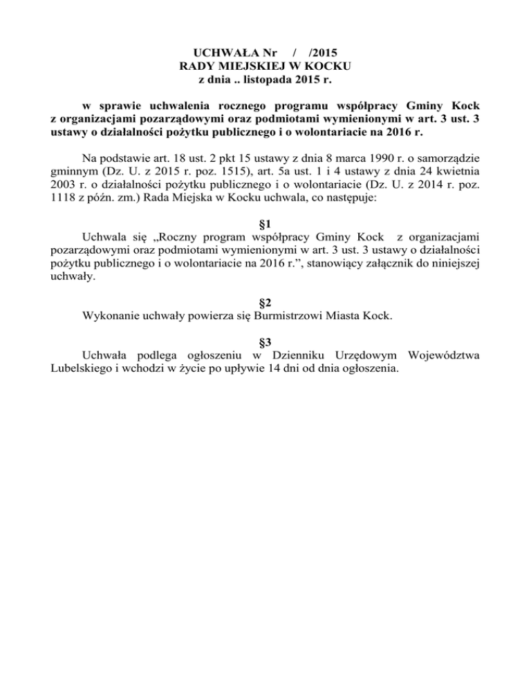 UCHWAŁA Nr / /2015 RADY MIEJSKIEJ W KOCKU z dnia .. listopada 2015 r. w sprawie uchwalenia rocznego programu współpracy Gminy Kock z organizacjami pozarządowymi oraz podmiotami wymienionymi w art. 3 ust. 3 ustawy o działalności pożytku publicznego i o wolontariacie na 2016 r. Na podstawie art. 18 ust. 2 pkt 15 ustawy z dnia 8 marca 1990 r. o samorządzie gminnym (Dz. U. z 2015 r. poz. 1515), art. 5a ust. 1 i 4 ustawy z dnia 24 kwietnia 2003 r. o działalności pożytku publicznego i o wolontariacie (Dz. U. z 2014 r. poz. 1118 z późn. zm.) Rada Miejska w Kocku uchwala, co następuje: §1 Uchwala się „Roczny program współpracy Gminy Kock z organizacjami pozarządowymi oraz podmiotami wymienionymi w art. 3 ust. 3 ustawy o działalności pożytku publicznego i o wolontariacie na 2016 r.”, stanowiący załącznik do niniejszej uchwały. §2 Wykonanie uchwały powierza się Burmistrzowi Miasta Kock. §3 Uchwała podlega ogłoszeniu w Dzienniku Urzędowym Województwa Lubelskiego i wchodzi w życie po upływie 14 dni od dnia ogłoszenia. Załącznik do uchwały Nr / /2015 Rady Miejskiej w Kocku z dnia .. listopada 2015 r. w sprawie uchwalenia rocznego programu współpracy Gminy Kock z organizacjami pozarządowymi oraz podmiotami wymienionymi w art. 3 ust. 3 ustawy o działalności pożytku publicznego i o wolontariacie na 2016 r. Roczny program współpracy Gminy Kock z organizacjami pozarządowymi oraz podmiotami wymienionymi w art. 3 ust. 3 ustawy o działalności pożytku publicznego i o wolontariacie na 2016 r. §1 Ilekroć w Programie jest mowa o: 1) „ustawie" - rozumie się przez to ustawę z dnia 24 kwietnia 2003 r. o działalności pożytku publicznego i o wolontariacie (Dz. U. z 2014 r., poz. 1118 z późn. zm.); 2) „Gminie" - rozumie się przez to Gminę Kock; 5) „konkursie" - rozumie się przez to otwarty konkurs ofert, o którym mowa w art. 11 ust. 2 i w art. 13 ustawy. §2 Celem głównym współpracy samorządu z organizacjami pozarządowymi oraz podmiotami wymienionymi w art. 3 ust. 3 ustawy jest poprawa jakości życia mieszkańców Gminy Kock oraz tworzenie warunków do ich pełniejszego uczestnictwa w życiu publicznym. §3 Celami szczegółowymi programu są: 1) promowanie społeczeństwa obywatelskiego poprzez wspieranie aktywności mieszkańców Gminy; 2) tworzenie warunków do wzmacniania istniejących organizacji pozarządowych, powstawania nowych organizacji i inicjatyw obywatelskich; 3) otwarcie na innowacyjność oraz konkurencyjność poprzez umożliwienie organizacjom pozarządowym oraz podmiotom wymienionym w art. 3 ust. 3 ustawy wystąpienia z ofertą realizacji konkretnych zadań publicznych; 4) zapewnienie efektywnego wykonywania zadań publicznych Gminy przez włączenie do ich realizacji organizacji pozarządowych oraz podmiotów wymienionych w art. 3 ust. 3 ustawy; 5) wspieranie rozwoju sektora ekonomii społecznej. §4 Współpraca Gminy z organizacjami pozarządowymi opiera się na następujących zasadach: 1) zasada pomocniczości – Gmina udziela pomocy organizacjom pozarządowym oraz podmiotom wymienionym w art. 3 ust. 3 ustawy, w realizacji zadań publicznych niezbędnym zakresie, uzasadnionym potrzebami wspólnoty samorządowej, a organizacje zapewniają ich wykonanie w sposób profesjonalny i terminowy; 2) zasada suwerenności stron – Gmina i organizacje pozarządowe oraz podmioty wymienione w art. 3 ust. 3 ustawy nie narzucają sobie nawzajem zadań, szanując swoją autonomię, mogą natomiast zgłaszać wzajemne propozycje i deklaracje, gotowość wysłuchania propozycji drugiej strony; 3) zasada partnerstwa – współpraca pomiędzy Gminą a organizacjami pozarządowymi oraz podmiotami wymienionymi w art. 3 ust. 3 ustawy oparta jest na obopólnych korzyściach, woli i chęci wzajemnych działań, współdziałaniu na rzecz rozwiązywania lokalnych problemów m.in. w: uczestnictwie organizacji w rozeznawaniu i definiowaniu problemów mieszkańców, sugerowaniu zakresu współpracy, proponowaniu standardów usług świadczonych przez organizacje; 4) zasada efektywności – Gmina udziela pomocy organizacjom pozarządowym oraz podmiotom wymienionym w art. 3 ust. 3 ustawy w celu prowadzenia nowatorskich i bardziej skutecznych działań, dążąc do osiągnięcia możliwie najlepszych efektów w realizacji zadań publicznych; 5) zasada uczciwej konkurencji – zarówno Gmina, jak i organizacje pozarządowe oraz podmioty wymienione w art. 3 ust. 3 ustawy działają zgodnie z prawem i dobrymi obyczajami; 6) zasada jawności – procedury postępowania przy realizacji zadań publicznych przez organizacje pozarządowe oraz podmioty wymienione w art. 3 ust. 3 ustawy, sposób udzielania oraz wykonania zadania są jawne; dotyczy to w szczególności udostępniania organizacjom przez Gminę informacji o celach, kosztach i efektach współpracy, a także środkach finansowych zaplanowanych w budżecie Gminy na współpracę z organizacjami pozarządowymi i podmiotami wymienionymi w art. 3 ust. 3 ustawy oraz kryteriach oceny projektów. Zasada ta obliguje również do udostępniania Gminie danych dotyczących struktury organizacyjnej, sposobu funkcjonowania, prowadzenia działalności statutowej oraz sytuacji finansowej. §5 Przedmiotem współpracy Gminy z organizacjami pozarządowymi oraz podmiotami wymienionymi w art. 3 ust. 3 ustawy jest realizacja zadań w zakresie wspierania i upowszechniania kultury fizycznej, działalności na rzecz osób niepełnosprawnych, przeciwdziałania uzależnieniom i patologiom społecznym, działalności na rzecz integracji i reintegracji zawodowej i społecznej osób zagrożonych wykluczeniem społecznym, promocji zatrudnienia i aktywizacji zawodowej, kultury, edukacji, oświaty i wychowania. §6 Współpraca z organizacjami pozarządowymi oraz podmiotami wymienionymi w art. 3 ust. 3 ustawy odbywać się będzie poprzez następujące formy: 1) zlecanie organizacjom pozarządowym oraz podmiotom wymieni