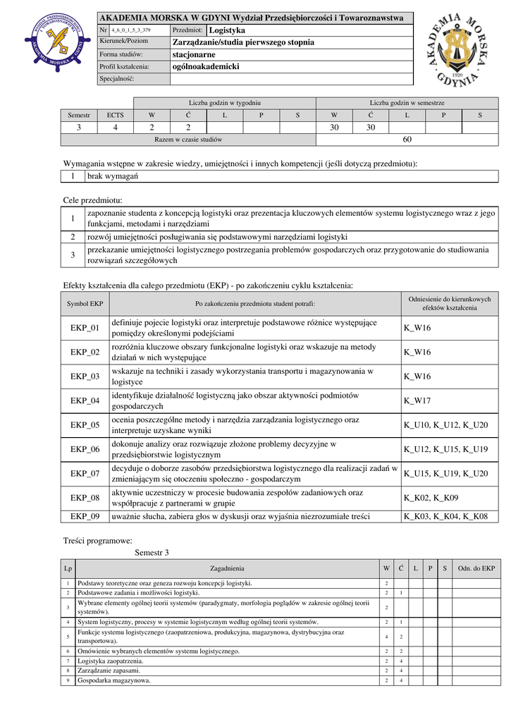 AKADEMIA MORSKA W GDYNI Wydział Przedsiębiorczości i Towaroznawstwa Nr 4_6_0_1_5_3_379 Przedmiot: Logistyka Kierunek/Poziom Zarządzanie/studia pierwszego stopnia Forma studiów: stacjonarne Profil kształcenia: ogólnoakademicki Specjalność: Liczba godzin w tygodniu Semestr ECTS W Ć 3 4 2 2 L P Liczba godzin w semestrze S W Ć 30 30 L P S 60 Razem w czasie studiów Wymagania wstępne w zakresie wiedzy, umiejętności i innych kompetencji (jeśli dotyczą przedmiotu): 1 brak wymagań Cele przedmiotu: 1 zapoznanie studenta z koncepcją logistyki oraz prezentacja kluczowych elementów systemu logistycznego wraz z jego funkcjami, metodami i narzędziami 2 rozwój umiejętności posługiwania się podstawowymi narzędziami logistyki 3 przekazanie umiejętności logistycznego postrzegania problemów gospodarczych oraz przygotowanie do studiowania rozwiązań szczegółowych Efekty kształcenia dla całego przedmiotu (EKP) - po zakończeniu cyklu kształcenia: Symbol EKP Odniesienie do kierunkowych efektów kształcenia Po zakończeniu przedmiotu student potrafi: EKP_01 definiuje pojecie logistyki oraz interpretuje podstawowe różnice występujące pomiędzy określonymi podejściami K_W16 EKP_02 rozróżnia kluczowe obszary funkcjonalne logistyki oraz wskazuje na metody działań w nich występujące K_W16 EKP_03 wskazuje na techniki i zasady wykorzystania transportu i magazynowania w logistyce K_W16 EKP_04 identyfikuje działalność logistyczną jako obszar aktywności podmiotów gospodarczych K_W17 EKP_05 ocenia poszczególne metody i narzędzia zarządzania logistycznego oraz interpretuje uzyskane wyniki K_U10, K_U12, K_U20 EKP_06 dokonuje analizy oraz rozwiązuje złożone problemy decyzyjne w przedsiębiorstwie logistycznym K_U12, K_U15, K_U19 EKP_07 decyduje o doborze zasobów przedsiębiorstwa logistycznego dla realizacji zadań w K_U15, K_U19, K_U20 zmieniającym się otoczeniu społeczno - gospodarczym EKP_08 aktywnie uczestniczy w procesie budowania zespołów zadaniowych oraz współpracuje z partnerami w grupie K_K02, K_K09 EKP_09 uważnie słucha, zabiera głos w dyskusji oraz wyjaśnia niezrozumiałe treści K_K03, K_K04, K_K08 Treści programowe: Semestr 3 Lp 1 2 Zagadnienia Podstawy teoretyczne oraz geneza rozwoju koncepcji logistyki. Podstawowe zadania i możliwości logistyki. W Ć 2 2 1 3 Wybrane elementy ogólnej teorii systemów (paradygmaty, morfologia poglądów w zakresie ogólnej teorii systemów). 2 4 System logistyczny, procesy w systemie logistycznym według ogólnej teorii systemów. 2 1 5 Funkcje systemu logistycznego (zaopatrzeniowa, produkcyjna, magazynowa, dystrybucyjna oraz transportowa). 4 2 2 2 2 4 2 4 2 4 6 7 8 9 Omówienie wybranych elementów systemu logistycznego. Logistyka zaopatrzenia. Zarządzanie zapasami. Gospodarka magazynowa. L P S Odn. do EKP Logistyka produkcji. Zarządzanie transportem w przedsiębiorstwie. Koszty procesów logistycznych. Kadry logistyki w przedsiębiorstwie. 10 11 12 13 4 2 2 4 2 2 2 4 Metody weryfikacji efektów kształcenia (w odniesieniu do poszczególnych efektów): Symbol EKP Test Egzamin ustny Egzamin pisemny Kolokwium EKP_01 X EKP_02 X X EKP_03 X X EKP_04 X EKP_05 X X EKP_06 X X EKP_07 X X Sprawozdanie Projekt Prezentacja X X EKP_08 Zaliczenie praktyczne Inne EKP_09 X Kryteria zaliczenia przedmiotu: Semestr 3 Ocena pozytywna (min. dostateczny) obecność na zajęciach ćwiczeniowych, pozytywne zaliczenie kolokwiów, pozytywne zaliczenie końcowego egzaminu pisemnego Uwaga: student otrzymuje ocenę powyżej dostatecznej, jeżeli uzyskane efekty kształcenia przekraczają wymagane minimum. Nakład pracy studenta: Forma aktywności Godziny kontaktowe Czytanie literatury Przygotowanie do zajęć laboratoryjnych, projektowych Przygotowanie do egzaminu, zaliczenia Opracowanie dokumentacji projektu/sprawozdania Uczestnictwo w zaliczeniach i egzaminach Udział w konsultacjach Łącznie godzin Liczba punktów ECTS Sumaryczna liczba punktów ECTS dla przedmiotu Obciążenie studenta związane z zajęciami praktycznymi Obciążenie studenta na zajęciach wymagających bezpośredn. udziału nauczycieli akadem. Szacunkowa liczba godzin na zrealizowanie aktywności W Ć L P S 30 30 10 4 8 10 8 4 2 4 52 2 58 2 4 18 66 Literatura: Semestr 3 Semestr 3 Literatura podstawowa Abt S., Zarządzanie logistyczne w przedsiębiorstwie, PWE, Warszawa 1998 Gołembska E. i inni, Kompendium wiedzy o logistyce, PWN, Warszawa-Poznań 2001 Kisperska-Moroń D., Krzyżaniak S., Logistyka, ILiM, Poznań 2009 Kubicki J., Kuriata A., Problemy logistyczne w modelowaniu systemów transportowych, WKŁ, Warszawa 2000 Podstawy logistyki, Pr. zb. pod red. Fertsch M., ILiM, Poznań 2006 Literatura uzupełniająca Christopher M., Logistyka i zarządzanie łańcuchem dostaw. Strategie obniżki kosztów i poprawy poziomu usług. Polskie Centrum Doradztwa Logistycznego, Warszawa 2000 Coyle J.J., Bardi E.J., Langley Jr. C.J.: Zarządzanie logistyczne, PWE, Warszawa 2002 Słownik terminologii logistycznej, ILiM, Poznań 2006 Czasopisma: Logistyka, Eurologistyka, Gospodarka Materiałowa i Logistyka Prowadzący przedmiot: Tytuł/stopień, Imię i Nazwisko 1. Osoba odpowiedzialna za przedmiot Jednostka dydaktyczna dr Maciej Matczak KLiST dr hab. Andrzej Kuriata prof. nadzw. AM mgr Sławomir Skiba KLiST KLiST 2. Pozostałe osoby prowadzące zajęcia AKADEMIA MORSKA W GDYNI Wydział Przedsiębiorczości i Towaroznawstwa Nr 4_6_0_1_5_3_417 Przedmiot: Metody organizacji i zarządania Kierunek/Poziom Zarządzanie/studia pierwszego stopnia Forma studiów: stacjonarne Profil kształcenia: ogólnoakademicki Specjalność: Liczba godzin w tygodniu Semestr ECTS W Ć 3 4 1 2 L P Liczba godzin w semestrze S W Ć 15 30 L P S 45 Razem w czasie studiów Wymagania wstępne w zakresie wiedzy, umiejętności i innych kompetencji (jeśli dotyczą przedmiotu): 1 Znajomość treści przedmiotów: Nauki o organizacji, Podstawy zarządzania Cele przedmiotu: 1 Zapoznanie studentów z wyb