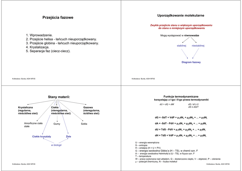 Uporządkowanie molekularne Przejścia fazowe Zwykle przejście stanu o większym uporządkowaniu do stanu o mniejszym uporządkowaniu 1. Wprowadzenie. 2. Przejście helisa - łańcuch nieuporządkowany. 3. Przejście globina - łańcuch nieuporządkowany. 4. Krystalizacja. 5. Separacja faz (ciecz-ciecz). Mogą występować w równowadze stabilnej niestabilnej Diagram fazowy Květoslava Burda, AGH WFiIS Květoslava Burda, AGH WFiIS Stany materii: Funkcje termodynamiczne korzystając z I-go i II-go prawa termodynamiki dU = dQ + dW Krystaliczna (regularna, nieściśliwa sieć) Ciekła (nieregularna, nieściśliwa sieć) Gazowa (nieregularna, ściśliwa sieć) dS / dt ≥ 0 dS ≥ dQ/T dG = -SdT + VdP + µ1dN1 + µ2dN2 + ... + µidNi Amorficzne ciała stałe Gumy Szkła dA = -SdT - PdV + µ1dN1 + µ2dN2 + ... + µidNi dU = TdS - PdV + µ1dN1 + µ2dN2 + ... + µidNi Ciekłe kryształy Żele w biologii Květoslava Burda, AGH WFiIS dH = TdS + VdP + µ1dN1 + µ2dN2 + ... + µidNi U – energia wewnętrzna S – entropia H – entalpia (H = U + PV) G – energia swobodna Gibbs’a (H – TS), w chemii ozn. F A – energia swobodna Helmholtz’a (U - TS), w fizyce ozn. F T – temperatura W – praca wykonana nad układem, Q – dostarczone ciepło, V – objetość, P – ciśnienie µ – potecjał chemiczny, N – liczba molekuł Květoslava Burda, AGH WFiIS Przejście fazowe pierwszego rodzaju (rzędu), gdy nieciągła pierwsza pochodna energii swobodnej (istnienie ciepła ukrytego !). Przejścia: ciało stałe / ciecz / gaz. Przejście fazowe ciągłe (np.drugiego rodzaju) (rzędu), gdy nieciągła druga (3-cia, 4-ta pochodna) pochodna energii swobodnej (klasyfikacja Ehrenfesta, nie ma ciepła ukrytego ! ). Przejścia: ferromagnetyczne i nadciekłe, występowanie punktów krytycznych. Przykłady ciągłych przejść fazowych : A ρ (ciecz) − ρ ( gaz ) = B(TC − T ) β Przejścia fazowe nieskończonego rzędu, np. kwantowe przejścia fazowe w dwuwymiarowym gazie elektronowym. Np. Cv – ciepło właściwe H 1-wszego rzędu Dla układu gaz – ciecz parametr gęstości zmienia się z charakterystyczną temperaturą krytyczną: Fluktuacje gęstości mogą być oszacowane ilościowo względem parametru ściśliwości (κ): ciągłe H κ =− ∆H 1 ⎛ ∂V ⎞ −ν ⎜ ⎟ = E (T − Tc ) V ⎝ ∂P ⎠ dla T > Tc (E-stała) CV ~ (T-Tc)-α – zależy od rzędu przejścia i symetrii Tc Cv T Tc Cv B T Napięcie powierzchniowe (γ) pomiędzy dwoma fazami ciekłymi dąży do zera w punkcie krytycznym temperatury, chociaż szerokość interfejsu oddziaływania rośnie nieskończenie: ⎛ T⎞ γ = γ 0 ⎜⎜1 − ⎟⎟ ⎝ Tc ⎠ α = -0.013±0.003 dla nadciekłego przejścia α ~ +0.110 dla ferromagnetycznego 3D Tc T Tc T Květoslava Burda, AGH WFiIS Funkcja stanu F opisuje równowagę fazową przy niezależnie zmieniających się parametrach. Np. dla idealnego gazu zależy od czterech parametrów : F(V, n, P, T) = 0 Równanie to przyjmuje postać prawa Van der Waalsa (R- stała gazowa): PV −1 = 0 nRT µ γc – średnie napięcie powierzchniowe Květoslava Burda, AGH WFiIS Parametr uporządkowania 0 dla układu nieuporządkowanego Skończona wartość dla układu uporządkowanego Zmiana parametru uporządkowania względem temperatury wskazuje na charakter przejścia. W układach biologicznych, uwzględnia on gęstość próbki, objętość próbki, stopień orientacji molekularnej. Różne źródła ciągłych przejść fazowych: Tylko trzy parametry niezależne są potrzebne do opisu gazu idealnego. Reguła fazowa Gibbs’a (użyteczna dla wieloskładnikowych układów koloidalnych): - skończone rozmiary (małe micele lipidowe i ich koncemtracja krytyczna) - układy nieejdnorodne (zanieczyszczenia poszerzają przejście fazowe) - czasy równowagi są długie w porównaniu z czasem obserwacji (przejścia w polimerach) f+p=c+2 f – liczba niezależnych zmiennych p – liczba współistniejących faz c – liczba składowych Květoslava Burda, AGH WFiIS Květoslava Burda, AGH WFiIS Przejście helisa – łańcuch nieuporządkowany (węglowodany, białka, kwasy nukleinowe) Funkcja partycji (Z) dla przejścia helisa – łańcuch nieuporządkowany: n Z = 1 + ∑ Ω kσs k Zmiany temperatury, roztworu, jego pH, itp. k =1 Liczba permutacji Ωk wynosi: n - k+1 Model Zippera k jednostek s – stała równowagi dla tworzenia się nowej helisy na końcu już istniejącej krok propagacji h – sekwencja helisalna c– sekwencja nieuporządkowana σ – stała równowagi tworzenia się nowej helisy na ruchomym łańcuchu c krok nukleacji s= ...cchhhhcc... ...cchhhccc... σ= ...cchcc... ...ccccc... n jednostek Energia swobodna: F / kT = -lnZ Prawdopodobieństwo znalezienia stanu o energii Ei: Wartości średnie: Květoslava Burda, AGH WFiIS Frakcja helikalna (θ): Ωk – liczba sposobów pojawienia się k - jednostek helisalnych w łańcuchu n - jednostkowym Ei = ∑ ρ ( Ei ) Ei = ∑e Květoslava Burda, AGH WFiIS θ= Model Zipper’a przewiduje: k n − Ei / kT ρ ( Ei ) = e − Ei / kT Z Ei Z Zimm-Bragg (Ising) model – uwzględnia fluktuacje długich łąńcuchów białkowych θ= 1 ∂ ln Z n ∂ ln s Dodatnia zmiana energii swobodnej (∆f) - preferowane fragmenty helisy (uporządkowanie) Zgodność modelu Zipper’a dla krótkich łąńcuchów polipeptydowych. s ≡ exp(− ∆f / T ) σ ≡ exp(−2∆f s / T ) Uwaga: Problem dla długich łańcuchów, kiedy ważne są fluktuacje. ∆f – zmiana energii swobodnej przy zmianie kolejnej jednostki łańcucha na helisę ∆fs – zmiana energii swobodnej przy zmianie nowej jednostki łańcucha na helisę W biopolimerach naturalnie występujących σ jest rzędu 10-3 – 10-4. σ=1 - brak kooperatywności σ << 1 – silna kooperatywność Květoslava Burda, AGH WFiIS Zimm and Bragg(1959) J.Chem.Phys.31,526 Květoslava Burda, AGH WFiIS Model Zimma-Bragga uwzględnia wiązania wodorowe konieczne do tworzenia struktur helikalnych i dobrze oddaje