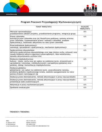 Program Pracowni Przyszłego(ej) Wychowawcy(czyni) TEMAT WARSZTATU DŁUGOŚĆ WARSZTATU Warsztat wprowadzający: przedstawienie założeń projektu, przedstawienie programu, integracja grupy 8h Prawa człowieka: koncepcja praw człowieka oraz jej filozoficzne podstawy, systemy ochrony praw człowieka, fundamentalne prawa i wolności człowieka, problem dyskryminacji, możliwości aktywizmu na rzecz praw człowieka 6h Przeciwdziałanie dyskryminacji: stereotyp, uprzedzenie i dyskryminacja, mechanizm dyskryminacji 6h Społeczeństwo obywatelskie: definicje społeczeństwa obywatelskiego oraz jego istotne cechy, celowość oraz zasady działania sektora organizacji pozarządowych, idea wolontariatu, sposoby aktywizowania uczniów/nnic 6h Edukacja międzykulturowa: kultura – istota, cechy oraz jej wpływ na codzienne życie, etnocentryzm a uprzedzenia i stereotyp, wielokulturowość z perspektywy globalnej oraz polskiej, dialog i komunikacja międzykulturowa 6h Edukacja globalna: globalizacja i jej wpływ na codzienne życie, uwarunkowania rozwoju, problemy globalne współczesnego świata, osobiste zaangażowanie na rzecz pomocy krajom rozwijającym się 6h Edukacja przez doświadczenie, metody aktywizujące w pracy nauczyciela(ki) 6h Edukacja przez doświadczenie, metody aktywizujące w pracy nauczyciela(ki) – prezentacje osób uczestniczących 6h Motywacja w pracy wychowawcy(czyni) 6h Spotkanie ewaluacyjne 6h TRENERZY/TRENERKI: Martyna Markiewicz - absolwentka europeistyki na UAM w Poznaniu, związana z wieloma organizacjami pozarządowymi. Trenerka z dużym doświadczeniem w prowadzeniu warsztatów z zakresu praw człowieka, przeciwdziałania dyskryminacji, odpowiedzialnej konsumpcji oraz edukacji globalnej (w tym w ramach projektów finansowanych przez MSZ). Absolwentka IX edycji Szkoły Trenerów Organizacji Pozarządowych STOP. Koordynatorka projektów edukacyjnych skierowanych do młodzieży, nauczycieli/ek, osób związanych z organizacjami pozarządowymi dotyczących m.in. kwestii ubóstwa, uwzględnia perspektywy praw człowieka we współpracy rozwojowej, przeciwdziałania dyskryminacji. Współorganizatorka obchodów Światowego Dnia Sprawiedliwego Handlu w Poznaniu. Członkini zarządu Instytutu Badania i Rozwoju Aktywności Społecznej oraz Stowarzyszenia Dni Równości i Tolerancji w Poznaniu. Jacek Sańko - od wielu lat związany z organizacjami pozarządowymi. Współtwórca Instytutu Odpowiedzialnego Biznesu na Podlasiu współpracującego z org. pozarządowymi oraz firmami odpowiedzialnymi społecznie. Współpracował ze Stowarzyszeniem „Przyjazna Szkoła” przy projekcie z 300 szkołami w całej Polsce. Obecnie pracuje w organizacji zrzeszającej inne organizacje w Wielkopolsce – Wielkopolskiej Radzie Koordynacyjnej Związku Organizacji Pozarządowych. Współtworzy Fundację Instytut Badania i Rozwoju Aktywności Społecznej pracując na rzecz uwspółcześnienia systemu edukacji w Polce tak, aby rozwijał ludzi (edukacja obywatelska w szkołach, aktywne metody nauczania i organizacji szkoły, innowacje edukacyjne) Anna Klingsporn – absolwentka Wydziału Nauk Społecznych UAM na kierunkach: socjologia i filozofia – życie publiczne. Działaczka organizacji pozarządowych. Zainteresowania tematyką równościową i antydyskryminacyjną. Prowadziła m.in. warsztaty w ramach Dni Równości i Tolerancji, szkolenia dla przyszłych trenerów/rek Amnesty International oraz liczne szkolenia dla młodzieży dotyczące społeczeństwa obywatelskiego i przeciwdziałania dyskryminacji. Sylwia Dybiec - pedagożka, socjoterapeutka, psychoterapeutka. Doświadczona w pracy z młodzieżą oraz osobami dorosłymi . Pracuje jako terapeuta funkcji poznawczych, gdzie wykorzystuje autorskie programy, oparte na aktywizujących metodach nauczania. Brała udział w wielu szkoleniach dotyczących efektywnego uczenia się, nauki przez zabawę itp. Działaczka organizacji pozarządowych. Prowadziła szkolenia dla wolontariuszy, które miały na celu podniesienie ich kwalifikacji w udzielaniu korepetycji dzieciom i młodzieży z rodzin dysfunkcyjnych. Pracuje w przedszkolu jako terapeutka, gdzie udziela konsultacji wychowawcom i rodzicom, jak skutecznie i pozytywnie wpływać na rozwój dzieci. Posiada duże doświadczenie w prowadzeniu grup socjoterapeutycznych dla dzieci i młodzieży z trudnościami wychowawczymi. Prowadzi prywatny gabinet psychoterapii. Ewa Alicja Bajbak -absolwentka filologii orientalnej o specjalności arabistyka na poznańskim UAM, po rocznym pobycie w Kuwejcie; trenerka aktywistka, edukatorka praw człowieka i przeciwdziałania dyskryminacji wyszkolona m. in. w ramach ogólnopolskiego programu Prawa człowieka - edukacja - działanie prowadzonego przez Stowarzyszenie Amnesty International Polska, przez blisko 3 lata koordynowała pracą Regionalnego Zespołu ds. Edukacji AI w Wielkopolsce, asystentka projektu współpracująca ze Stowarzyszeniem Inicjatyw Niezależnych Mikuszewo w ramach projektu Galeria Tolerancji Akademia Dialogu Międzykulturowego;