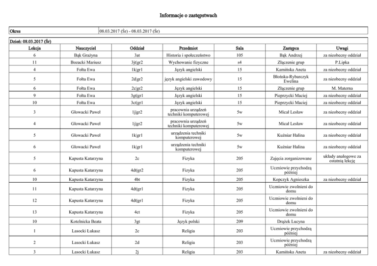 Informacje o zastępstwach Okres 08.03.2017 (Śr) - 08.03.2017 (Śr) Dzień: 08.03.2017 (Śr) Lekcja Nauczyciel Oddział Przedmiot Sala Zastępca Uwagi 6 Bąk Grażyna 3at Historia i społeczeństwo 105 Bąk Andrzej za nieobecny oddział 11 Bozacki Mariusz 3jt|gr2 Wychowanie fizyczne s4 Złączenie grup P.Lipka 4 Fołta Ewa 1k|gr1 Język angielski 15 Kamińska Aneta za nieobecny oddział 5 Fołta Ewa 2d|gr2 język angielski zawodowy 15 Błońska-Rybarczyk Ewelina za nieobecny oddział 6 Fołta Ewa 2c|gr2 Język angielski 15 Złączenie grup M. Materna 9 Fołta Ewa 3gt|gr1 Język angielski 15 Pieprzycki Maciej za nieobecny oddział 10 Fołta Ewa 3ct|gr1 Język angielski 15 Pieprzycki Maciej za nieobecny oddział 3 Głowacki Paweł 1j|gr2 pracownia urządzeń techniki komputerowej 5w Micał Lesław za nieobecny oddział 4 Głowacki Paweł 1j|gr2 pracownia urządzeń techniki komputerowej 5w Micał Lesław za nieobecny oddział 5 Głowacki Paweł 1k|gr1 urządzenia techniki komputerowej 5w Kuźniar Halina za nieobecny oddział 6 Głowacki Paweł 1k|gr1 urządzenia techniki komputerowej 5w Kuźniar Halina za nieobecny oddział 5 Kapusta Katarzyna 2c Fizyka 205 Zajęcia zorganizowane układy analogowe za ostatnią lekcję 6 Kapusta Katarzyna 4dt|gr2 Fizyka 205 Uczniowie przychodzą później 10 Kapusta Katarzyna 4bt Fizyka 205 Kopczyk Agnieszka 11 Kapusta Katarzyna 4dt|gr1 Fizyka 205 Uczniowie zwolnieni do domu 12 Kapusta Katarzyna 4dt|gr1 Fizyka 205 Uczniowie zwolnieni do domu 13 Kapusta Katarzyna 4ct Fizyka 205 Uczniowie zwolnieni do domu 10 Kotelnicka Beata 3gt Język polski 209 Drążek Lucyna 1 Lasocki Łukasz 2c Religia 203 Uczniowie przychodzą później 2 Lasocki Łukasz 2d Religia 203 Uczniowie przychodzą później 3 Lasocki Łukasz 2j Religia 203 Kamińska Aneta za nieobecny oddział za nieobecny oddział 4 Lasocki Łukasz 1i|rel_u Religia 203 Kubiak Agata za nieobecny oddział 7 Rokita Agnieszka 2d Matematyka 0.5 Kaniuch Izabela za nieobecny oddział 8 Rokita Agnieszka 2d Matematyka 0.5 Kaniuch Izabela za nieobecny oddział 9 Rokita Agnieszka 3it Matematyka 210 Bojarski Grzegorz za nieobecny oddział 12 Rokita Agnieszka 4ht Matematyka 2 Pieprzycki Maciej za nieobecny oddział 13 Rokita Agnieszka 4ht Matematyka 2 Zajęcia w bibliotece 2 Różak Monika 3at|3/4 pracownia układów analogowych i cyfrowych 111 Złączenie grup 3 Różak Monika 3at|3/4 pracownia układów analogowych i cyfrowych 111 Złączenie grup 4 Różak Monika 3at|3/4 pracownia układów analogowych i cyfrowych 111 Złączenie grup 5 Różak Monika 3at|3/4 pracownia układów analogowych i cyfrowych 111 Złączenie grup 6 Różak Monika 3bt|2/4 pracownia układów analogowych i cyfrowych 111 Uczniowie przychodzą później 7 Różak Monika 3bt|2/4 pracownia układów analogowych i cyfrowych 111 Uczniowie przychodzą później 8 Różak Monika 3bt|2/4 pracownia układów analogowych i cyfrowych 111 Uczniowie przychodzą później 9 Różak Monika 3bt|2/4 pracownia układów analogowych i cyfrowych 111 Uczniowie przychodzą później 5 Turek Urszula 2a układy cyfrowe 3 Kopczyk Agnieszka za nieobecny oddział