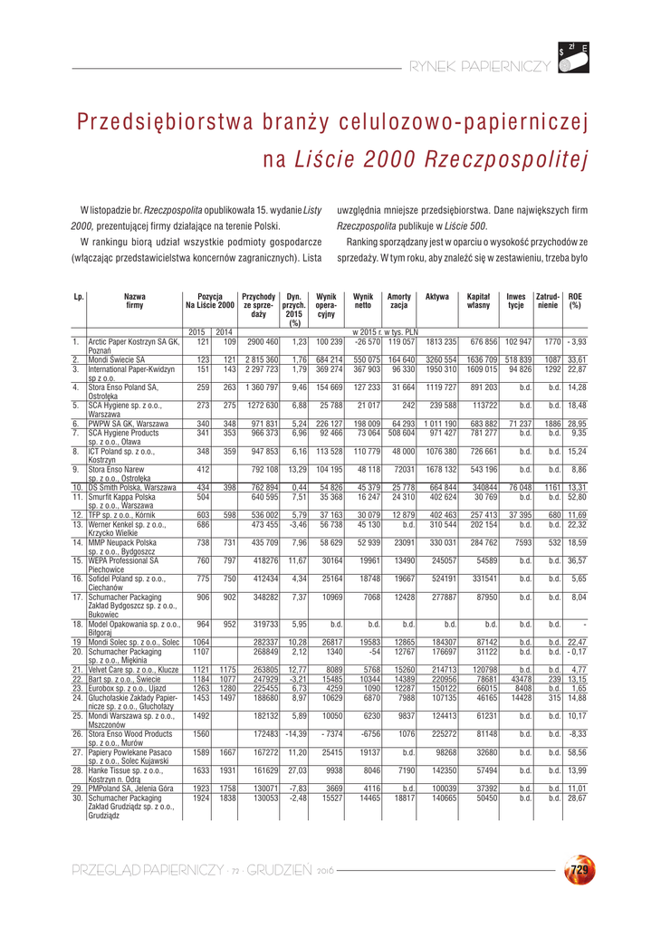 RYNEK PAPIERNICZY Pr z ed si ę b i or st w a b ran ży c e lu lozow o- pap ie r nic zej n a Li śc i e 2 0 0 0 R z e c z p o s p o l i tej W listopadzie br. Rzeczpospolita opublikowała 15. wydanie Listy uwzględnia mniejsze przedsiębiorstwa. Dane największych firm Rzeczpospolita publikuje w Liście 500. 2000, prezentującej firmy działające na terenie Polski. W rankingu biorą udział wszystkie podmioty gospodarcze Ranking sporządzany jest w oparciu o wysokość przychodów ze (włączając przedstawicielstwa koncernów zagranicznych). Lista sprzedaży. W tym roku, aby znaleźć się w zestawieniu, trzeba było Lp. 1. 2. 3. 4. 5. 6. 7. 8. 9. 10. 11. 12. 13. 14. 15. 16. 17. 18. 19 20. 21. 22. 23. 24. 25. 26. 27. 28. 29. 30. Nazwa firmy Pozycja Przychody Dyn. Na Liście 2000 ze sprze- przych. daży 2015 (%) 2015 2014 Arctic Paper Kostrzyn SA GK, 121 109 2900 460 1,23 Poznań Mondi Świecie SA 123 121 2 815 360 1,76 International Paper-Kwidzyn 151 143 2 297 723 1,79 sp z o.o. 9,46 259 263 1 360 797 Stora Enso Poland SA, Ostrołęka SCA Hygiene sp. z o.o., 273 275 1272 630 6,88 Warszawa PWPW SA GK, Warszawa 340 348 971 831 5,24 SCA Hygiene Products 341 353 966 373 6,96 sp. z o.o., Oława ICT Poland sp. z o.o., 348 359 947 853 6,16 Kostrzyn Stora Enso Narew 412 792 108 13,29 sp. z o.o., Ostrołęka DS Smith Polska, Warszawa 434 398 762 894 0,44 Smurfit Kappa Polska 504 640 595 7,51 sp. z o.o., Warszawa TFP sp. z o.o., Kórnik 603 598 536 002 5,79 Werner Kenkel sp. z o.o., 686 473 455 -3,46 Krzycko Wielkie MMP Neupack Polska 738 731 435 709 7,96 sp. z o.o., Bydgoszcz WEPA Professional SA 760 797 418276 11,67 Piechowice Sofidel Poland sp. z o.o., 775 750 412434 4,34 Ciechanów Schumacher Packaging 906 902 348282 7,37 Zakład Bydgoszcz sp. z o.o., Bukowiec Model Opakowania sp. z o.o., 964 952 319733 5,95 Biłgoraj Mondi Solec sp. z o.o., Solec 1064 282337 10,28 Schumacher Packaging 1107 268849 2,12 sp. z o.o., Miękinia Velvet Care sp. z o.o., Klucze 1121 1175 263805 12,77 Bart sp. z o.o., Świecie 1184 1077 247929 -3,21 Eurobox sp. z o.o., Ujazd 1263 1280 225455 6,73 Głuchołaskie Zakłady Papier1453 1497 188680 8,97 nicze sp. z o.o., Głuchołazy Mondi Warszawa sp. z o.o., 1492 182132 5,89 Mszczonów Stora Enso Wood Products 1560 172483 -14,39 sp. z o.o., Murów Papiery Powlekane Pasaco 1589 1667 167272 11,20 sp. z o.o., Solec Kujawski Hanke Tissue sp. z o.o., 1633 1931 161629 27,03 Kostrzyn n. Odrą PMPoland SA, Jelenia Góra 1923 1758 130071 -7,83 Schumacher Packaging 1924 1838 130053 -2,48 Zakład Grudziądz sp. z o.o., Grudziądz Wynik operacyjny Wynik netto Amorty zacja Aktywa Kapitał własny Inwes tycje Zatrudnienie ROE (%) 100 239 w 2015 r. w tys. PLN -26 570 119 057 1813 235 676 856 102 947 1770 - 3,93 684 214 369 274 550 075 367 903 164 640 96 330 3260 554 1950 310 1636 709 1609 015 518 839 94 826 1087 33,61 1292 22,87 154 669 127 233 31 664 1119 727 891 203 b.d. b.d. 14,28 25 788 21 017 242 239 588 113722 b.d. b.d. 18,48 226 127 92 466 198 009 73 064 64 293 508 604 1 011 190 971 427 683 882 781 277 71 237 b.d. 1886 28,95 b.d. 9,35 113 528 110 779 48 000 1076 380 726 661 b.d. b.d. 15,24 104 195 48 118 72031 1678 132 543 196 b.d. b.d. 54 826 35 368 45 379 16 247 25 778 24 310 664 844 402 624 340844 30 769 76 048 b.d. 1161 13,31 b.d. 52,80 37 163 56 738 30 079 45 130 12 879 b.d. 402 463 310 544 257 413 202 154 37 395 b.d. 680 11,69 b.d. 22,32 58 629 52 939 23091 330 031 284 762 7593 532 18,59 30164 19961 13490 245057 54589 b.d. b.d. 36,57 25164 18748 19667 524191 331541 b.d. b.d. 5,65 10969 7068 12428 277887 87950 b.d. b.d. 8,04 b.d. b.d. b.d. b.d. b.d. b.d. b.d. - 26817 1340 19583 -54 12865 12767 184307 176697 87142 31122 b.d. b.d. b.d. 22,47 b.d. - 0,17 8089 15485 4259 10629 5768 10344 1090 6870 15260 14389 12287 7988 214713 220956 150122 107135 120798 78681 66015 46165 b.d. 43478 8408 14428 b.d. 4,77 239 13,15 b.d. 1,65 315 14,88 10050 6230 9837 124413 61231 b.d. b.d. 10,17 - 7374 -6756 1076 225272 81148 b.d. b.d. 25415 19137 b.d. 98268 32680 b.d. b.d. 58,56 9938 8046 7190 142350 57494 b.d. b.d. 13,99 3669 15527 4116 14465 b.d. 18817 100039 140665 37392 50450 b.d. b.d. b.d. 11,01 b.d. 28,67 PRZEGLĄD PAPIERNICZY · 72 · GRUDZIEŃ 2016 8,86 -8,33 729