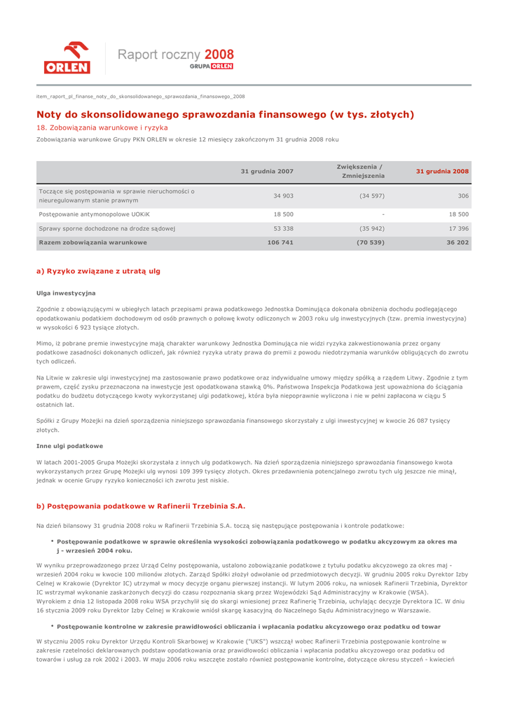 Zobowiązania warunkowe Grupy PKN ORLEN w okresie 12 miesięcy zakończonym 31 grudnia 2008 roku