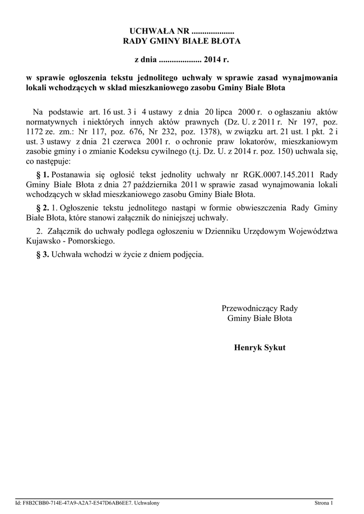 UCHWAŁA NR .................... RADY GMINY BIAŁE BŁOTA z dnia .................... 2014 r. w sprawie ogłoszenia tekstu jednolitego uchwały w sprawie zasad wynajmowania lokali wchodzących w skład mieszkaniowego zasobu Gminy Białe Błota Na podstawie art. 16 ust. 3 i 4 ustawy z dnia 20 lipca 2000 r. o ogłaszaniu aktów normatywnych i niektórych innych aktów prawnych (Dz. U. z 2011 r. Nr 197, poz. 1172 ze. zm.: Nr 117, poz. 676, Nr 232, poz. 1378), w związku art. 21 ust. 1 pkt. 2 i ust. 3 ustawy z dnia 21 czerwca 2001 r. o ochronie praw lokatorów, mieszkaniowym zasobie gminy i o zmianie Kodeksu cywilnego (t.j. Dz. U. z 2014 r. poz. 150) uchwala się, co następuje: § 1. Postanawia się ogłosić tekst jednolity uchwały nr RGK.0007.145.2011 Rady Gminy Białe Błota z dnia 27 października 2011 w sprawie zasad wynajmowania lokali wchodzących w skład mieszkaniowego zasobu Gminy Białe Błota. § 2. 1. Ogłoszenie tekstu jednolitego nastąpi w formie obwieszczenia Rady Gminy Białe Błota, które stanowi załącznik do niniejszej uchwały. 2. Załącznik do uchwały podlega ogłoszeniu w Dzienniku Urzędowym Województwa Kujawsko - Pomorskiego. § 3. Uchwała wchodzi w życie z dniem podjęcia. Przewodniczący Rady Gminy Białe Błota Henryk Sykut Id: F8B2CBB0-714E-47A9-A2A7-E547D6AB6EE7. Uchwalony Strona 1 Załącznik do Uchwały Nr RGK.0007......2014 Rady Gminy Białe Błota z dnia .......... 2014 r. Obwieszczenie nr... /2014 Rady Gminy Białe Błota z dnia....... 2014 r. w sprawie ogłoszenia tekstu jednolitego uchwały w sprawie w sprawie zasad wynajmowania lokali wchodzących w skład mieszkaniowego zasobu Gminy Białe Błota 1. Na podstawie art. 16 ust. 3 i 4 ustawy z dnia 20 lipca 2000 r. o ogłaszaniu aktów normatywnych i niektórych innych aktów prawnych ( Dz. U. z 2011 r. Nr 197, poz. 1172 ze. zm.: Nr 117, poz. 676, Nr 232, poz. 1378 ) ogłasza się w załączniku do niniejszego obwieszczenia tekst jednolity uchwały nr RGK.0007.145.2011 Rady Gminy Białe Błota z dnia 27 października 2011 r. w sprawie zasad wynajmowania lokali wchodzących w skład mieszkaniowego zasobu Gminy Białe Błota (Dz. Urz. Województwa Kujawsko - Pomorskiego z 2011 r. Nr 251, poz. 2393) z uwzględnieniem zmian wprowadzonych: 1) uchwałą Nr RGK.0007.114.2012 Rady Gminy Białe Błota z dnia 27 września 2012 r. zmieniającą uchwałę w sprawie w sprawie zasad wynajmowania lokali wchodzących w skład mieszkaniowego zasobu Gminy Białe Błota (Dz. Urz. Województwa Kujawsko - Pomorskiego z 2012 r. poz. 2120); 2) uchwałą Nr RGK.0007.7.2014 Rady Gminy Białe Błota z dnia 30 stycznia 2014 r. zmieniającą uchwałę w sprawie w sprawie zasad wynajmowania lokali wchodzących w skład mieszkaniowego zasobu Gminy Białe Błota (Dz. Urz. Województwa Kujawsko - Pomorskiego z 2014 r. poz. 435). 2. Podany w załączniku do niniejszego obwieszczenia tekst jednolity uchwały nie obejmuje § 17 uchwały nr RGK.0007.145.2011 Rady Gminy Białe Błota z dnia 27 października 2011 r. w sprawie zasad wynajmowania lokali wchodzących w skład mieszkaniowego zasobu Gminy Białe Błota (Dz. Urz. Województwa Kujawsko Pomorskiego z 2011 r. Nr 251, poz. 2393), który stanowi: "§ 17. Uchwała wchodzi w życie w terminie 14 dni od dnia jej ogłoszenia w Dzienniku Urzędowym Województwa Kujawsko-Pomorskiego.". Id: F8B2CBB0-714E-47A9-A2A7-E547D6AB6EE7. Uchwalony Strona 1 3. Obwieszczenie wchodzi w życie z dniem ogłoszenia. Przewodniczący Rady Gminy Białe Błota Henryk Sykut Id: F8B2CBB0-714E-47A9-A2A7-E547D6AB6EE7. Uchwalony Strona 2 Załącznik do obwieszczenia nr .../2014 Rady Gminy Białe Błota z dnia ...... 2014 r. Uchwała Nr RGK.0007.145.2011 Rady Gminy Białe Błota z dnia 27 października 20 11 r. w sprawie zasad wynajmowania lokali wchodzących w skład mieszkaniowego zasobu Gminy Białe Błota Na podstawie art. 21 ust. 1 pkt. 2 i ust. 3 ustawy z dnia 21 czerwca 2001 r. o ochronie praw lokatorów, mieszkaniowym zasobie gminy i o zmianie Kodeksu cywilnego (Dz. U. z 2005 r. Nr 31, poz. 266, ze zm: z 2006 roku Nr 86, poz. 602, Nr 94, poz. 657, Nr 167, poz. 1193, Nr 249, poz. 1833, z 2007 r. Nr 128, poz. 902, Nr 173, poz. 1218, z 2010 r. Nr 3, poz. 13) uchwala się, co następuje: Rozdział 1. Postanowienia ogólne § 1. Uchwała ma zastosowanie do mieszkaniowego zasobu Gminy Białe Błota. Rozdział 2. Wysokość dochodu gospodarstwa domowego uzasadniająca oddanie w najem lub w podnajem lokalu na czas nieoznaczony i lokalu socjalnego, oraz wysokość dochodu gospodarstwa domowego uzasadniająca zastosowanie obniżek czynszu § 21). 1. W przypadku oddania w najem lub w podnajem lokalu wchodzącego w skład mieszkaniowego zasobu Gminy Białe Błota średni miesięczny dochód brutto wszystkich członków gospodarstwa domowego w przeliczeniu na jednego członka rodziny osiągnięty w okresie 3 miesięcy poprzedzających kwalifikację wniosków nie może przekroczyć 125% najniższej emerytury w gospodarstwie wieloosobowym i 150% najniższej emerytury w gospodarstwie jednoosobowym. 2. W przypadku oddania w najem lub w podnajem lokalu socjalnego średni miesięczny dochód brutto wszystkich członków gospodarstwa domowego w przeliczeniu na jednego członka rodziny osiągnięty w okresie 3 miesięcy poprzedzających kwalifikację wniosków nie może przekroczyć 100% najniższej emerytury w gospodarstwie wieloosobowym i 125% najniższej emerytury w gospodarstwie jednoosobowym. § 3. Przez najniższą emeryturę rozumie się wysokość kwoty ogłoszonej corocznie w Monitorze Polskim przez Prezesa Zakładu Ubezpieczeń Społecznych w sprawie 1) W brzmieniu nadanym uchwałą Nr RGK.0007.7.2014 Rady Gminy Białe Błota z dnia 30 stycznia 2014 r. zmieniającą uchwałę w sprawie w sprawie zasad wynajmowania lokali wchodzących w skład mieszkaniowego zasobu Gminy Białe Błota (Dz. Urz. Województwa Kujawsko - Pomorskiego z 2014 r. poz. 435). Id: F8B2CBB0-714E-47A9-A2A7-E547D6AB6EE7. Uchwalony Strona 1 kwot