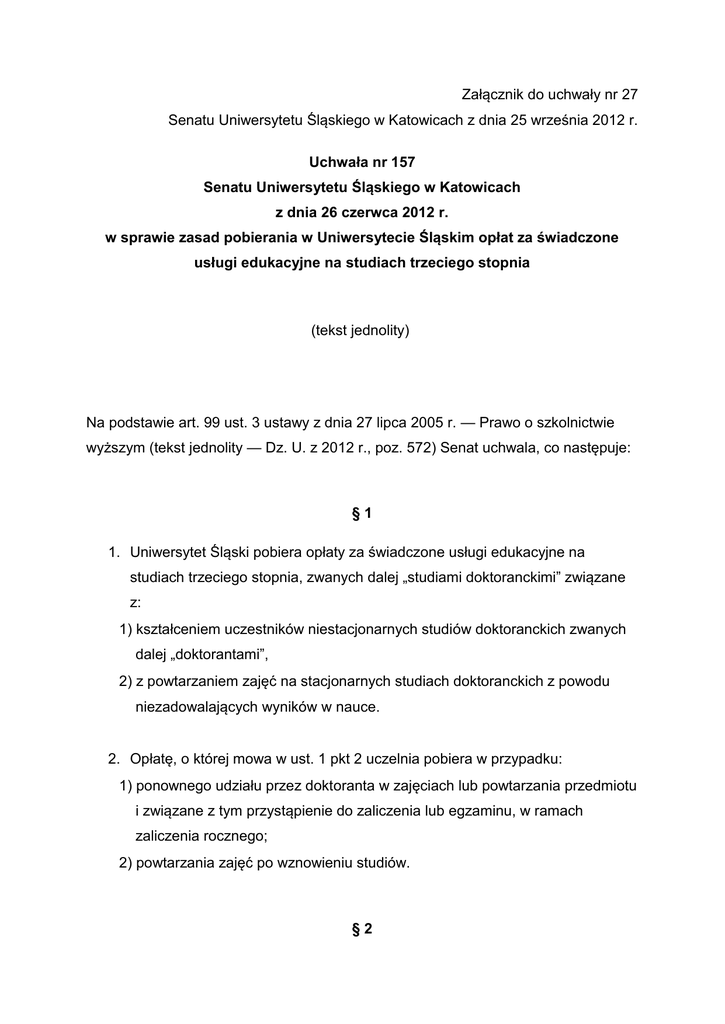 Załącznik do uchwały nr 27 Senatu Uniwersytetu Śląskiego w Katowicach z dnia 25 września 2012 r. Uchwała nr 157 Senatu Uniwersytetu Śląskiego w Katowicach z dnia 26 czerwca 2012 r. w sprawie zasad pobierania w Uniwersytecie Śląskim opłat za świadczone usługi edukacyjne na studiach trzeciego stopnia (tekst jednolity) Na podstawie art. 99 ust. 3 ustawy z dnia 27 lipca 2005 r. — Prawo o szkolnictwie wyższym (tekst jednolity — Dz. U. z 2012 r., poz. 572) Senat uchwala, co następuje: §1 1. Uniwersytet Śląski pobiera opłaty za świadczone usługi edukacyjne na studiach trzeciego stopnia, zwanych dalej „studiami doktoranckimi” związane z: 1) kształceniem uczestników niestacjonarnych studiów doktoranckich zwanych dalej „doktorantami”, 2) z powtarzaniem zajęć na stacjonarnych studiach doktoranckich z powodu niezadowalających wyników w nauce. 2. Opłatę, o której mowa w ust. 1 pkt 2 uczelnia pobiera w przypadku: 1) ponownego udziału przez doktoranta w zajęciach lub powtarzania przedmiotu i związane z tym przystąpienie do zaliczenia lub egzaminu, w ramach zaliczenia rocznego; 2) powtarzania zajęć po wznowieniu studiów. §2 1. Wysokość opłat za świadczone usługi edukacyjne na studiach doktoranckich w cyklu rocznym ustala rektor w drodze zarządzenia. Wysokość opłaty jest zróżnicowana w zależności od dziedziny i dyscypliny naukowej, w jakiej prowadzone są studia doktoranckie. 2. Podstawę ustalenia odpłatności stanowi, zatwierdzony przez rektora, planowany koszt zajęć dydaktycznych w zakresie niezbędnym do ich uruchomienia i prowadzenia, uwzględniający koszty przewodu doktorskiego, koszty przygotowania i wdrożenia strategii rozwoju uczelni, w szczególności rozwoju kadr naukowych infrastruktury dydaktyczno-naukowej, w tym amortyzacji i remontów. 3. Kalkulację kosztów sporządza jednostka prowadząca studia doktoranckie. Kalkulację akceptuje kwestor pod względem finansowym, a następnie zatwierdza rektor. 4. Jednostka prowadząca studia doktoranckie propozycję wysokości opłat za świadczone usługi edukacyjne przekazuje do Działu Kształcenia do dnia 31 maja każdego roku. §3 1. Zasadą jest, że opłatę za usługę edukacyjną, o której mowa w § 1 ust. 1 pkt. 1 doktorant wnosi semestralnie w trzech częściach, z zastrzeżeniem ust. 2 i ust. 5. Dokonanie wpłaty w wysokości odpowiednio 33, 33 i 34 % kwoty należności uznaje się za jej dokonanie w częściach równych. 2. Doktorant może wnieść opłatę w całości w terminach, o których mowa w ust. 3 pkt 1. Opłata wnoszona w całości jest niższa o 5% od opłaty wnoszonej w częściach. W przypadku, jeśli opłata nie zostanie wniesiona w wyznaczonym terminie w całości uznaje się, że doktorant wnosił będzie opłatę w częściach, zaś jeśli dokona wpłaty po wyznaczonym terminie, w sposób jednorazowy, zobowiązany będzie do uiszczenia opłaty w pełnej wysokości stanowiącej sumę opłat wnoszonych w częściach. Przepisów ust. 7 i 8 nie stosuje się. 3. Doktorant zobowiązany jest wnieść opłatę za usługi edukacyjne w następujących terminach: 1) opłatę w całości: a) do 5 października za semestr zimowy, b) do 1 marca za semestr letni; 2) opłatę w trzech częściach: a) za semestr zimowy: — do 15 października pierwsza część, — do 15 listopada druga część, — do 15 grudnia trzecia część, b) za semestr letni: — do 15 marca pierwsza część, — do 15 kwietnia druga część, — do 15 maja trzecia część. 4. W przypadku przyjęcia doktoranta na studia po upływie terminu płatności, doktorant obowiązany jest wnieść opłatę, o której mowa w § 1 ust. 1 pkt 1 odpowiednio na zasadach określonych w ust. 3, z tym, że termin wniesienia opłaty w całości lub pierwszej części opłaty ustala się na 7 dni od dnia dokonania wpisu na studia doktoranckie. 5. Opłaty, o których mowa w§ 1 ust. 1 pkt 2 spowodowane niezadowalającymi wynikami w nauce, doktorant obowiązany jest wnieść w całości, w terminach określonych w ust. 3 pkt 1; przepisu ust. 2 nie stosuje się. 6. W przypadku wydania decyzji, o powtarzaniu zajęć z powodu niezadowalających wyników w nauce, po upływie terminów określonych w ust. 3 pkt 1, kierownik studiów doktoranckich wyznacza inny termin wniesienia opłaty. 7. Doktorantowi, który nie wniesie opłaty w terminach określonych w ust. 3 pkt 2 lit a i b, sekretariat studiów doktoranckich doręcza wezwanie do niezwłocznej zapłaty. Niewniesienie opłaty na rachunek Uniwersytetu Śląskiego jest podstawą do dochodzenia przez Uczelnię zapłaty ustawowych odsetek za zwłokę. 8. Po wniesieniu opłaty — doktorantowi, o którym mowa w ust. 7, zostaną naliczone odsetki za zwłokę za okres od obowiązującego terminu wpłaty do daty wniesienia opłaty. 9. Zaleganie przez doktoranta z opłatami związanymi z odbywaniem studiów może stanowić podstawę do skreślenia go z listy doktorantów. §4 1. W uzasadnionych przypadkach (wybitne wyniki w pracy naukowej potwierdzone np.: publikacjami, wystąpieniami na konferencjach lub udokumentowana trudna sytuacja materialna, trudna sytuacja losowa) dziekan, po zasięgnięciu opinii kierownika studiów doktoranckich, może zwolnić doktoranta z części opłaty. Zwolnienie może wynosić nie więcej niż 25% opłaty semestralnej. 2. Osoby ubiegające się o zwolnienie z opłaty składają wniosek u kierownika studiów doktoranckich w terminach: do 12 września i 27 stycznia danego roku. Zaopiniowany przez kierownika studiów doktoranckich wniosek powinien być niezwłocznie przekazany dziekanowi do decyzji. 3. Skutki zwolnień z opłat doktorantów ponoszą Wydziały prowadzące studia doktoranckie. 4. Kwota zwolnienia z opłaty stanowi przychód doktoranta. Sekretariat studiów doktoranckich sporządza informację PIT 8C i przekazuje go do właściwego Urzędu Skarbowego doktoranta, a także doręcza doktorantowi w terminach określonych w ustawi