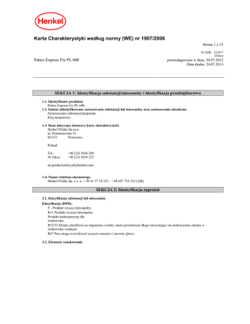 Karta Charakterystyki według normy (WE) nr 1907/2006 Strona 1 z 13 Nr SDB : 222977 V004.0 Pattex Express Fix PL 600 przeredagowano w dniu: 30.07.2012 Data druku: 24.07.2013 SEKCJA 1: Identyfikacja substancji/mieszaniny i identyfikacja przedsiębiorstwa 1.1. Identyfikator produktu Pattex Express Fix PL 600 1.2. Istotne zidentyfikowane zastosowania substancji lub mieszaniny oraz zastosowania odradzane Zastosowanie substancji/preparatu: Klej montażowy 1.3. Dane dotyczące dostawcy karty charakterystyki Henkel Polska Sp.zo.o ul. Domaniewska 41 02-672 Warszawa Poland Tel.: Nr faksu: +48 (22) 5656 200 +48 (22) 5656 222 [email protected] 1.4. Numer telefonu alarmowego Henkel Polska Sp. z o. o. + 48 41 37 10 187, + 48 697 716 333 (24h) SEKCJA 2: Identyfikacja zagrożeń 2.1. Klasyfikacja substancji lub mieszaniny Klasyfikacja (DPD): F - Produkt wysoce łatwopalny R11 Produkt wysoce łatwopalny. Produkt niebezpieczny dla środowiska. R52/53 Działa szkodliwie na organizmy wodne; może powodować długo utrzymujące się niekorzystne zmiany w środowisku wodnym. R67 Pary mogą wywoływać uczucie senności i zawroty głowy. 2.2. Elementy oznakowania SDB- ( Bank Danych Bezpieczeństwa)- numer: 222977 V004.0 Pattex Express Fix PL 600 Strona 2 z 13 Elementy oznakowania (DPD): F - Produkt wysoce łatwopalny Wskazówki R: R11 Produkt wysoce łatwopalny. R52/53 Działa szkodliwie na organizmy wodne; może powodować długo utrzymujące się niekorzystne zmiany w środowisku wodnym. R67 Pary mogą wywoływać uczucie senności i zawroty głowy. Wskazówki S: S2 Chronić przed dziećmi. S16 Nie przechowywać w pobliżu źródeł zapłonu - nie palić tytoniu. S29 Nie wprowadzać do kanalizacji. S46 W razie połknięcia niezwłocznie zasięgnij porady lekarza - pokaż opakowanie lub etykietę. S51 Stosować wyłącznie w dobrze wentylowanych pomieszczeniach. 2.3. Inne zagrożenia Zawarte w produkcie rozpuszczalniki ulatniają się w czasie przerobu, a ich opary mogą tworzyć wybuchowe/łatwopalne mieszaniny z powietrzem. Kobiety w ciąży absolutnie nie powinny wdychać, powinny unikać kontaktu ze skórą SEKCJA 3: Skład/informacja o składnikach Ogólna charakterystyka chemiczna: jedno komonentowy - klej montażowy Podstawowe składniki preparatu: rozpuszczalnik organiczny nieorganiczne wypełniacze Kopolimer butadienowo-styrenowy SDB- ( Bank Danych Bezpieczeństwa)- numer: 222977 V004.0 Pattex Express Fix PL 600 Strona 3 z 13 Informacje o składnikach według Rozporządzenia WE Nr 1272/2008: Niebezpieczne składniki Nr CAS Numer WE Nr rejestracyjny REACH 265-151-9 Zawartość: Klasyfikacja < 15 % Octan etylu 141-78-6 205-500-4 01-2119475103-46 < 15 % n-Heksan 110-54-3 203-777-6 < 0,5 % Niebezpieczeństwo zassania 1 H304 Działanie drażniące na skórę 2 H315 Toksyczność w stosunku do konkretnych organów -jednokrotnym kontakcie 3 H336 Ciecze palne 2 H225 Chroniczne zagrożenie dla środowiska wodnego 2 H411 Ciecze palne 2 H225 Toksyczność w stosunku do konkretnych organów -jednokrotnym kontakcie 3 H336 Działanie drażniące na oczy 2 H319 Ciecze palne 2 H225 Substancja toksyczna dla funkcji rozrodczych 2 H361f Niebezpieczeństwo zassania 1 H304 Toksyczność w stosunku do konkretnych organów -wielokrotnym kontakcie 2 H373 Działanie drażniące na skórę 2 H315 Toksyczność w stosunku do konkretnych organów -jednokrotnym kontakcie 3 H336 Chroniczne zagrożenie dla środowiska wodnego 2 H411 Benzyna lekka obrabiana wodorem (ropa naftowa) 64742-49-0 Pełne brzmienie zwrotów H wymienione jest w punkcie 16 ' Inne informacje". Substancje nie sklasyfikowane, dla których określono najwyższe dopuszczalne stężenia w środowisku pracy. Informacje o składnikach według Rozporządzenia WE Nr 1999/45: Niebezpieczne składniki Nr CAS Numer WE Nr rejestracyjny REACH 265-151-9 Zawartość: Klasyfikacja < 15 % Octan etylu 141-78-6 205-500-4 01-2119475103-46 < 15 % n-Heksan 110-54-3 203-777-6 < 0,5 % F - Produkt wysoce łatwopalny; R11 Xi - Produkt drażniący; R38 Xn - Produkt szkodliwy; R65 R67 N - Produkt niebezpieczny dla środowiska.; R51/53 F - Produkt wysoce łatwopalny; R11 R66 Xi - Produkt drażniący; R36 R67 F - Produkt wysoce łatwopalny; R11 Kategoria 3 Substancja toksyczna ze względu na zaburzenia rozrodczości.; R62 Xi - Produkt drażniący; R38 R67 Xn - Produkt szkodliwy; R65, R48/20 N - Produkt niebezpieczny dla środowiska.; R51/53 Benzyna lekka obrabiana wodorem (ropa naftowa) 64742-49-0 Pełne brzmienie zwrotów R podane jest w punkcie 16. Substancje nie sklasyfikowane, dla których określono najwyższe dopuszczalne stężenia w środowisku pracy. SDB- ( Bank Danych Bezpieczeństwa)- numer: 222977 V004.0 Pattex Express Fix PL 600 Strona 4 z 13 SEKCJA 4: Środki pierwszej pomocy 4.1. Opis środków pierwszej pomocy Wskazówki ogólne: W przypadku dolegliwości zdrowotnych skonsultowac się z lekarzem. Przedostanie się do dróg oddechowych: Zapewnic poszkodowanemu oddychanie świeżym powietrzem, w przypadku utrzymywania się dolegliwości skonsultowac się z lekarzem. Kontakt ze skórą: Przemyć bieżącą wodą i mydłem. Zmienić zabrudzoną nasączoną odzież. Kontakt z oczami Przemyć pod bieżącą wodą (przez 10 minut), w razie potrzeby udać się do lekarza. Połknięcie Przepłukać jamę ustną, wypić 1-2 szklanki wody, skonsultować się z lekarzem. 4.2. Najważniejsze ostre i opóźnione objawy oraz skutki narażenia Opary mogą powodować senność i odurzenie. 4.3. Wskazania dotyczące wszelkiej natychmiastowej pomocy lekarskiej i szczególnego postępowania z poszkodowanym Patrz rozdział karty: Opis środków pierwszej pomocy SEKCJA 5: Postępowanie w przypadku pożaru 5.1. Środki gaśnicze Odpowiednie środki gaśnicze: dwutlenek węgla, piana, proszek, strumień wody pod ciśnieniem , rozpylony Środki gaśnicze, które nie mogą być używane ze względów bezpieczeństwa: strumień wody pod wysokim ciśnieniem 5.2. Szczególne zagrożenia związane z su