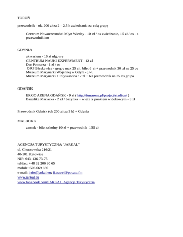TORUŃ przewodnik - ok. 200 zł za 2 - 2,5 h zwiedzania za całą grupę Centrum Nowoczesności Młyn Wiedzy - 10 zł / os zwiedzanie, 15 zł / os - z przewodnikiem GDYNIA akwarium - 16 zł ulgowy CENTRUM NAUKI EXPERYMENT - 12 zł Dar Pomorza - 1 zł / os ORP Błyskawica - grupy max 25 zł , bilet 6 zł + przewodnik 30 zł na 25 os Muzeum Marynarki Wojennej w Gdyni - j.w. Muzeum Marynarki + Błyskawica : 7 zł + 60 przewodnik na 25 os grupa GDAŃSK ERGO ARENA GDAŃSK - 9 zł ( http://funarena.pl/project/stadion/ ) Bazylika Mariacka - 2 zł / bazylika + wieża z punktem widokowym - 3 zł Przewodnik Gdańsk (ok 200 zł za 3 h) + Gdynia MALBORK zamek - bilet szkolny 10 zł + przewodnik 135 zł AGENCJA TURYSTYCZNA "JARKAL" ul. Chorzowska 216/21 40-101 Katowice NIP: 643-136-73-75 tel/fax: +48 32 206 80 65 mobile: 606 669 666 e-mail: [email protected]; [email protected] www.jarkal.eu www.facebook.com/JARKAL.Agencja.Turystyczna