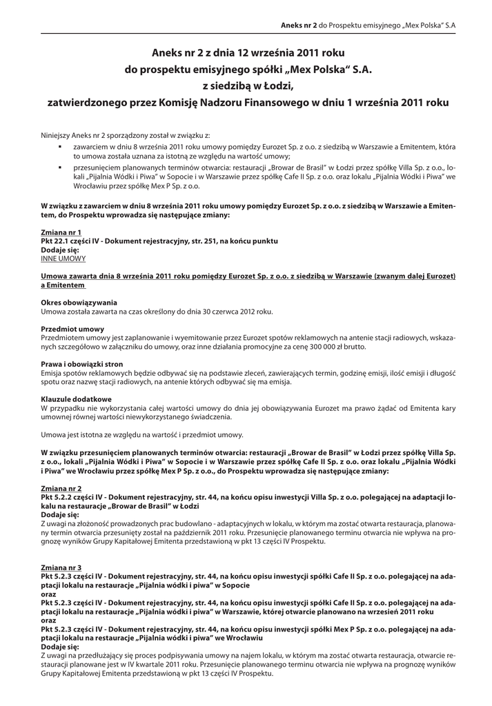 Aneks nr 2 do Prospektu emisyjnego „Mex Polska“ S.A Aneks nr 2 z dnia 12 września 2011 roku do prospektu emisyjnego spółki „Mex Polska“ S.A. z siedzibą w Łodzi, zatwierdzonego przez Komisję Nadzoru Finansowego w dniu 1 września 2011 roku Niniejszy Aneks nr 2 sporządzony został w związku z: zawarciem w dniu 8 września 2011 roku umowy pomiędzy Eurozet Sp. z o.o. z siedzibą w Warszawie a Emitentem, która to umowa została uznana za istotną ze względu na wartość umowy; przesunięciem planowanych terminów otwarcia: restauracji „Browar de Brasil” w Łodzi przez spółkę Villa Sp. z o.o., lokali „Pijalnia Wódki i Piwa” w Sopocie i w Warszawie przez spółkę Cafe II Sp. z o.o. oraz lokalu „Pijalnia Wódki i Piwa” we Wrocławiu przez spółkę Mex P Sp. z o.o. W związku z zawarciem w dniu 8 września 2011 roku umowy pomiędzy Eurozet Sp. z o.o. z siedzibą w Warszawie a Emitentem, do Prospektu wprowadza się następujące zmiany: Zmiana nr 1 Pkt 22.1 części IV - Dokument rejestracyjny, str. 251, na końcu punktu Dodaje się: INNE UMOWY Umowa zawarta dnia 8 września 2011 roku pomiędzy Eurozet Sp. z o.o. z siedzibą w Warszawie (zwanym dalej Eurozet) a Emitentem Okres obowiązywania Umowa została zawarta na czas określony do dnia 30 czerwca 2012 roku. Przedmiot umowy Przedmiotem umowy jest zaplanowanie i wyemitowanie przez Eurozet spotów reklamowych na antenie stacji radiowych, wskazanych szczegółowo w załączniku do umowy, oraz inne działania promocyjne za cenę 300 000 zł brutto. Prawa i obowiązki stron Emisja spotów reklamowych będzie odbywać się na podstawie zleceń, zawierających termin, godzinę emisji, ilość emisji i długość spotu oraz nazwę stacji radiowych, na antenie których odbywać się ma emisja. Klauzule dodatkowe W przypadku nie wykorzystania całej wartości umowy do dnia jej obowiązywania Eurozet ma prawo żądać od Emitenta kary umownej równej wartości niewykorzystanego świadczenia. Umowa jest istotna ze względu na wartość i przedmiot umowy. W związku przesunięciem planowanych terminów otwarcia: restauracji „Browar de Brasil” w Łodzi przez spółkę Villa Sp. z o.o., lokali „Pijalnia Wódki i Piwa” w Sopocie i w Warszawie przez spółkę Cafe II Sp. z o.o. oraz lokalu „Pijalnia Wódki i Piwa” we Wrocławiu przez spółkę Mex P Sp. z o.o., do Prospektu wprowadza się następujące zmiany: Zmiana nr 2 Pkt 5.2.2 części IV - Dokument rejestracyjny, str. 44, na końcu opisu inwestycji Villa Sp. z o.o. polegającej na adaptacji lokalu na restauracje „Browar de Brasil” w Łodzi Dodaje się: Z uwagi na złożoność prowadzonych prac budowlano - adaptacyjnych w lokalu, w którym ma zostać otwarta restauracja, planowany termin otwarcia przesunięty został na październik 2011 roku. Przesunięcie planowanego terminu otwarcia nie wpływa na prognozę wyników Grupy Kapitałowej Emitenta przedstawioną w pkt 13 części IV Prospektu. Zmiana nr 3 Pkt 5.2.3 części IV - Dokument rejestracyjny, str. 44, na końcu opisu inwestycji spółki Cafe II Sp. z o.o. polegającej na adaptacji lokalu na restauracje „Pijalnia wódki i piwa” w Sopocie oraz Pkt 5.2.3 części IV - Dokument rejestracyjny, str. 44, na końcu opisu inwestycji spółki Cafe II Sp. z o.o. polegającej na adaptacji lokalu na restauracje „Pijalnia wódki i piwa” w Warszawie, której otwarcie planowano na wrzesień 2011 roku oraz Pkt 5.2.3 części IV - Dokument rejestracyjny, str. 44, na końcu opisu inwestycji spółki Mex P Sp. z o.o. polegającej na adaptacji lokalu na restauracje „Pijalnia wódki i piwa” we Wrocławiu Dodaje się: Z uwagi na przedłużający się proces podpisywania umowy na najem lokalu, w którym ma zostać otwarta restauracja, otwarcie restauracji planowane jest w IV kwartale 2011 roku. Przesunięcie planowanego terminu otwarcia nie wpływa na prognozę wyników Grupy Kapitałowej Emitenta przedstawioną w pkt 13 części IV Prospektu.