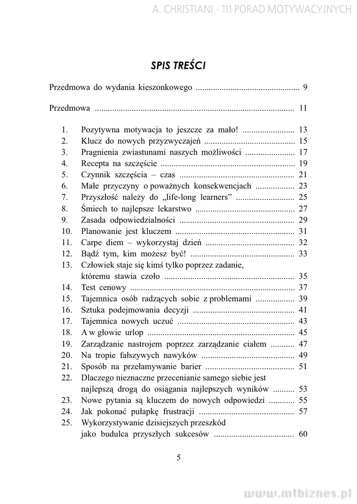 A. CHRISTIANI - 111 PORAD MOTYWACYJNYCH 111 PORAD MOTYWACYJNYCH SPIS TREŚCI Przedmowa do wydania kieszonkowego ................................................ 9 Przedmowa ............................................................................................ 11 1. 2. 3. 4. 5. 6. 7. 8. 9. 10. 11. 12. 13. 14. 15. 16. 17. 18. 19. 20. 21. 22. 23. 24. 25. Pozytywna motywacja to jeszcze za mało! ........................ Klucz do nowych przyzwyczajeń .......................................... Pragnienia zwiastunami naszych możliwości ....................... Recepta na szczęście .............................................................. Czynnik szczęścia – czas ..................................................... Małe przyczyny o poważnych konsekwencjach .................. Przyszłość należy do „life-long learners” ........................... Śmiech to najlepsze lekarstwo .............................................. Zasada odpowiedzialności ..................................................... Planowanie jest kluczem ....................................................... Carpe diem – wykorzystaj dzień ......................................... Bądź tym, kim możesz być! ................................................ Człowiek staje się kimś tylko poprzez zadanie, któremu stawia czoło ............................................................ Test cenowy ............................................................................ Tajemnica osób radzących sobie z problemami .................. Sztuka podejmowania decyzji ............................................... Tajemnica nowych uczuć ...................................................... A w głowie urlop .................................................................... Zarządzanie nastrojem poprzez zarządzanie ciałem ........... Na tropie fałszywych nawyków ........................................... Sposób na przełamywanie barier ......................................... Dlaczego nieznaczne przecenianie samego siebie jest najlepszą drogą do osiągania najlepszych wyników .......... Nowe pytania są kluczem do nowych odpowiedzi ............ Jak pokonać pułapkę frustracji ............................................ Wykorzystywanie dzisiejszych przeszkód jako budulca przyszłych sukcesów ..................................... 13 15 17 19 21 23 25 27 29 31 32 33 35 37 39 41 43 45 47 49 51 53 55 57 60 5 www.mtbiznes.pl A. CHRISTIANI - 111 PORAD MOTYWACYJNYCH 111 PORAD MOTYWACYJNYCH 26. 27. 28. 29. 30. 31. 32. 33. 34. 35. 36. 37. 38. 39. 40. 41. 42. 43. 44. 45. 46. 47. 48. 49. 50. 51. 52. 53. 54. 55. 56. 57. 58. „Siła przyzwyczajenia” .......................................................... 61 Grzechy zaniechania na drodze do piekła ....................... 62 Modelling of excellence ........................................................ 64 Profesjonalne zarządzanie nastrojem .................................... 66 Panowanie nad czasem .......................................................... 68 Wdzięczność jako klucz do szczęścia ................................ 70 Droga ku lepszym decyzjom ............................................... 71 Przekształcanie negatywnych uczuć ..................................... 73 Czy jesteśmy kowalami naszego losu? .............................. 75 Wykrywanie złodziei energii ................................................ 77 W jaki sposób dasz radę zrobić o trzydzieści procent więcej? ................................................ 78 Poszukiwanie kozła ofiarnego .............................................. 80 Konstruktywne zarządzanie uczuciami ................................. 82 Czy sukces jest dziełem przypadku? .................................... 84 Małe rzeczy są często początkiem wielkich przedsięwzięć .... 85 Głupiec i mędrzec ................................................................... 86 Poczucie pieniędzy ................................................................ 88 Wyjątki jako zabójcy nawyków ............................................ 90 Choroba przesuwania „na potem” ........................................ 92 Nauka mówienia „nie” .......................................................... 94 Początki zawsze są trudne, jeśli potem ma być łatwiej ...... 96 Alicja w krainie czarów ......................................................... 97 Zgodność słów i czynów ....................................................... 99 Tajemnica dobrego nastroju bez przyczyny ..................... 101 Zbieranie doświadczeń jako hobby .................................. 103 Wzmacnianie silnych stron ................................................ 105 Świętowanie sukcesu .......................................................... 107 Reguły, które decydują o naszym szczęściu .................... 108 Więzienie z myśli ................................................................ 110 Przekraczanie granic ........................................................... 111 Moc pozytywnego oczekiwania ........................................ 113 Pamiętnik sukcesów ............................................................ 115 Od myślącego „jeśli” do myślącego „jak” ..................... 116 6 www.mtbiznes.pl A. CHRISTIANI - 111 PORAD MOTYWACYJNYCH 111 PORAD MOTYWACYJNYCH 59. 60. 61. 62. 63. 64. 65. 66. 67. 68. 69. 70. 71. 72. 73. 74. 75. 76. 77. 78. 79. 80. 81. 82. 83. 84. 85. 86. 87. 88. 89. 90. Trawa po drugiej stronie płotu ............................................ 118 Nałóg oglądania telewizji ..................................................... 119 Przekraczanie granic, które sobie wmówiliśmy ................... 121 Widzimy to, co chcemy widzieć ........................................... 122 W pracy profesjonalista, prywatnie amator ........................... 123 Otoczenie jako czynnik usprawiedliwienia ........................