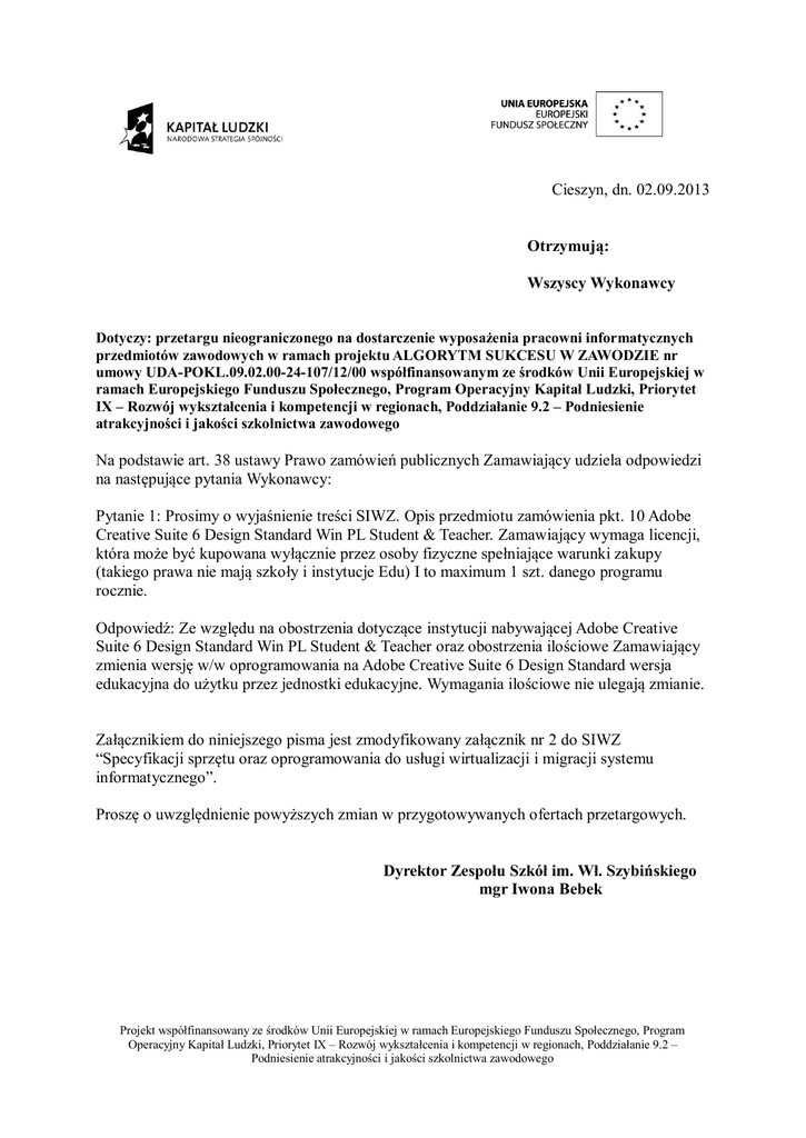 Cieszyn, dn. 02.09.2013 Otrzymują: Wszyscy Wykonawcy Dotyczy: przetargu nieograniczonego na dostarczenie wyposażenia pracowni informatycznych przedmiotów zawodowych w ramach projektu ALGORYTM SUKCESU W ZAWODZIE nr umowy UDA-POKL.09.02.00-24-107/12/00 współfinansowanym ze środków Unii Europejskiej w ramach Europejskiego Funduszu Społecznego, Program Operacyjny Kapitał Ludzki, Priorytet IX – Rozwój wykształcenia i kompetencji w regionach, Poddziałanie 9.2 – Podniesienie atrakcyjności i jakości szkolnictwa zawodowego Na podstawie art. 38 ustawy Prawo zamówień publicznych Zamawiający udziela odpowiedzi na następujące pytania Wykonawcy: Pytanie 1: Prosimy o wyjaśnienie treści SIWZ. Opis przedmiotu zamówienia pkt. 10 Adobe Creative Suite 6 Design Standard Win PL Student & Teacher. Zamawiający wymaga licencji, która może być kupowana wyłącznie przez osoby fizyczne spełniające warunki zakupy (takiego prawa nie mają szkoły i instytucje Edu) I to maximum 1 szt. danego programu rocznie. Odpowiedź: Ze względu na obostrzenia dotyczące instytucji nabywającej Adobe Creative Suite 6 Design Standard Win PL Student & Teacher oraz obostrzenia ilościowe Zamawiający zmienia wersję w/w oprogramowania na Adobe Creative Suite 6 Design Standard wersja edukacyjna do użytku przez jednostki edukacyjne. Wymagania ilościowe nie ulegają zmianie. Załącznikiem do niniejszego pisma jest zmodyfikowany załącznik nr 2 do SIWZ “Specyfikacji sprzętu oraz oprogramowania do usługi wirtualizacji i migracji systemu informatycznego”. Proszę o uwzględnienie powyższych zmian w przygotowywanych ofertach przetargowych. Dyrektor Zespołu Szkół im. Wł. Szybińskiego mgr Iwona Bebek Projekt współfinansowany ze środków Unii Europejskiej w ramach Europejskiego Funduszu Społecznego, Program Operacyjny Kapitał Ludzki, Priorytet IX – Rozwój wykształcenia i kompetencji w regionach, Poddziałanie 9.2 – Podniesienie atrakcyjności i jakości szkolnictwa zawodowego