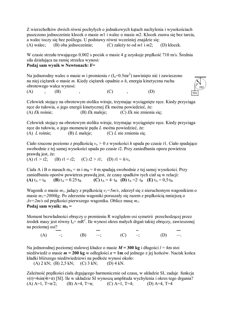 Z wierzchołków dwóch równi pochyłych o jednakowych kątach nachylenia i wysokościach puszczono jednocześnie klocek o masie m1 i walec o masie m2. Klocek zsuwa się bez tarcia, a walec toczy się bez poślizgu. U podstawy równi wcześniej znajdzie się: (A) walec; (B) oba jednocześnie; (C) zależy to od m1 i m2; (D) klocek. W czasie strzału trwającego 0,002 s pocisk o masie 4 g uzyskuje prędkość 710 m/s. Średnia siła działająca na ramię strzelca wynosi: Podaj sam wynik w Newtonach: F= Na jednorodny walec o masie m i promieniu r (Io=0.5mr2) nawinięto nić i zawieszono na niej ciężarek o masie m. Kiedy ciężarek opadnie o h, energia kinetyczna ruchu obrotowego walca wynosi: (A) , (B) , (C) , (D) Człowiek stojący na obrotowym stoliku wiruje, trzymając wyciągnięte ręce. Kiedy przyciąga ręce do tułowia, o jego energii kinetycznej Ek można powiedzieć, że: (A) Ek rośnie; (B) Ek maleje; (C) Ek nie zmienia się; Człowiek stojący na obrotowym stoliku wiruje, trzymając wyciągnięte ręce. Kiedy przyciąga ręce do tułowia, o jego momencie pędu L można powiedzieć, że: (A) L rośnie; (B) L maleje; (C) L nie zmienia się. Ciało rzucone poziomo z prędkością vo > 0 z wysokości h upada po czasie t1. Ciało spadające swobodnie z tej samej wysokości upada po czasie t2. Przy zaniedbaniu oporu powietrza prawdą jest, że: (A) t1 > t2; (B) t1 = t2; (C) t2 > t1; (D) t1 = h/vo Ciała A i B o masach mA = m i mB = 4∙m spadają swobodnie z tej samej wysokości. Przy zaniedbaniu oporów powietrza prawdą jest, że czasy spadków tych ciał są w relacji: (A) tA = tB (B) tA = 0.25∙tB (C) tA = 4∙ tB (D) tA =2∙ tB (E) tA = 0,5∙tB Wagonik o masie m1, jadący z prędkością v1=5m/s, zderzył się z nieruchomym wagonikiem o masie m2=2000kg. Po zderzeniu wagoniki poruszały się razem z prędkością mniejszą o Δv=2m/s od prędkości pierwszego wagonika. Oblicz masę m1. Podaj sam wynik: m1 = Moment bezwładności obręczy o promieniu R względem osi symetrii przechodzącej przez środek masy jest równy Io= mR2. Ile wynosi okres małych drgań takiej obręczy, zawieszonej na poziomej osi? (A) ; (B) ; (C) ; (D) . Na jednorodnej poziomej stalowej kładce o masie M = 300 kg i długości l = 4m stoi niedźwiedź o masie m = 200 kg w odległości x = 1m od jednego z jej końców. Nacisk końca kładki bliższego niedźwiedziowi na podłoże wynosi około: (A) 2 kN; (B) 2,5 kN; (C) 3 kN; (D) 4 kN. Zależność prędkości ciała drgającego harmonicznie od czasu, w układzie SI, zadaje funkcja v(t)=4sin(4t+π) [SI]. Ile w układzie SI wynoszą amplituda wychylenia i okres tego drgania? (A) A=1, T=π/2; (B) A=4, T=π; (C) A=1, T=4; (D) A=4, T=4 Jaka może być wartość fazy początkowej w ruchu harmonicznym opisanym równaniem x=5sin(3t+φo) cm, przy założeniu, że w chwili t=0 wychylenie jest równe x=2,5 cm. Podaj tylko wartość: φo= Fala poprzeczna rozchodząca się wzdłuż struny opisana jest równaniem y=0.001sin(2000πt 20πx) gdzie x i y wyrażone są w metrach, czas t w sekundach. Ile wynosi prędkość rozchodzenia się tej fali? (A) 200 m/s; (B) 100 m/s; (C) 200π m/s; (D) 1000 m/s; (B) 100π m/s; Gaz doskonały pobrał pewną ilość ciepła nie zmieniając swojej energii wewnętrznej. Pozwala to stwierdzić, że: (A) wzrosła jego temperatura (B) wzrosła jego temperatura i wykonał on pracę (C) wykonał on pracę, przy czym jego temperatura zmalała (D) wykonał on pracę zachowując stałą temperaturę Na wykresie przedstawiony jest cykl przemian termodynamicznych 0,5 mola gazu doskonałego. Jaką gaz wykonał pracę w przemianie a-b-c ? (R=8,31J/molK). (A) 24 kJ (B) 20 kJ (D) 30 kJ (D) 0 J (E) żzwo Układ termodynamiczny pobrał z otoczenia ciepło w ilości , a jego energia wewnętrzna wzrosła o ilości Praca wykonana przez układ jest równa: (A) (B) (C) . (D) Opisz drgania wymuszone . Podaj m.in. różniczkowe równanie tych drgań, jego ustalone rozwiązanie dla siły wymuszającej F=FocosΩt, oraz wyjaśnij zjawisko rezonansu. Wyjaśnij znaczenie użytych symboli oraz całych składników w różniczkowym równaniu tych drgań. (8p)