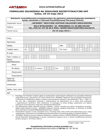www.artmed.kalisz.pl FORMULARZ ZGŁOSZENIA NA SZKOLENIE RECERTYFIKACYJNE KPP Kalisz, 18-19 maja 2013 Szkolenie recertyfikacyjne przygotowujące do egzaminu potwierdzającego posiadanie tytułu ratownika w zakresie Kwalifikowanej Pierwszej Pomocy „ART&MED” MEDYCZNE CENTRUM USŁUGOWO SZKOLENIOWE Organizator kursu: SALA WYKŁADOWA : UL. WINIARSKA 12, 62-800 KALISZ TEL./FAX 62 767 00 66 E-MAIL: [email protected] Miejsce: 18-19 maja 2013 r. Termin kursu: Imię : Nazwisko: PESEL: NIP: Telefon dom.: 0 - - - Tel. kom.: - E-mail: Data i miejsce ur.: - - Adres zameldowania: Ulica: Nr domu: Nr mieszk.: Kod: - Miejscowość: Województwo Dane do rachunku Instytucja: Adres: kod, ulica NIP 1. 2. 3. 4. Przesyłając ten formularz wyrażam zgodę na przetwarzanie swoich danych osobowych oraz przesyłanie informacji drogą elektroniczną i umieszczenie ich w bazie danych Firmy „ART&MED” Medyczne Centrum Usługowo Szkoleniowe, ul. Winiarska 12, 62-800 Kalisz. zgodnie z Ustawą o ochronie danych osobowych z dnia 29.08.1997 r. (Dz. U. z 2002 r. nr 101, poz. 926 z późniejszymi zmianami) z przeznaczeniem do wykorzystania ich w celach ściśle związanych z organizowanymi szkoleniami. Mam świadomośd, że przysługuje mi prawo dostępu, poprawiania oraz żądania zaprzestania ich przetwarzania. Swoje dane udostępniam dobrowolnie. Przy dokonywaniu wpłaty należności prosimy o podanie : imienia i nazwiska oraz adresu zamieszkania uczestnika. Wpłaty należy dokonad na konto : „ART&MED” Medyczne Centrum Usługowo Szkoleniowe, ul. Winiarska 12, 62-800 Kalisz, Multi Bank 15114020170000430205709169 Kwota : 300,00 zł. Potwierdzenie wpisania na listę uczestników kursu, otrzymają osoby, które prześlą kartę zgłoszeniową wraz z kopią zaświadczenia o ukooczeniu kursu kwalifikowanej pierwszej pomocy oraz dokonają wpłaty w wysokości 300,00 zł. „ART&MED” Medyczne Centrum Usługowo Szkoleniowe z siedzibą w Kaliszu nr REGON 300381702, posiada pozytywna Decyzję Wojewody Wielkopolskiego w sprawie zatwierdzenia programu kursu w zakresie kwalifikowanej pierwszej pomocy. Decyzja nr : ZK-V.6312.3.2012.4 ………………………… Czytelny podpis i data Uzupełniony formularz proszę przesłać na : adres: [email protected] lub fax 62 767 00 66