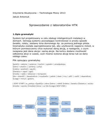 Inżynieria Akustyczna – Technologia Mowy 2013 Jakub Antoniuk Sprawozdanie z laboratoriów HTK 1.Opis gramatyki System był projektowany w celu obsługi inteligentnych instalacji w domach. Istnieją systemy pozwalające kontrolować w prosty sposób światło, rolety, zestawy kina domowego itp. za pomocą jednego pilota. Gramatyka została zaprojektowana tak, aby użytkownik najpierw mówił, w którym pomieszczeniu chce wykonać daną akcję, a następnie, z czym związana jest dana akcja i samą akcje. Na końcu dodano możliwość odłożenia akcji w czasie, czyli można wykona akcję teraz lub za dany odstęp czasu. Plik opisujący gramatykę: $pokOj = salonie | Lazience | kuchni | sypialni | przedpokoju; $okno = otwOrz | zamknij | uchyl; $roleta = podnieS | opuSC; $SwiatLo = zapal | zgaS; $media = radio | telewizor | komputer; $ile = dziesiEC | dwadzieScia | trzydzieSci | jednA | dwie | trzy | piEC | szeSC | dwanaScie; $czego = minut | godzin; ( SENT-START ( w_pokoju <$pokOj> ( okno $okno | roletE $roleta | SwiatLo $SwiatLo | wLAcz $media | wyLAcz $media)) (teraz | za $ile $czego) SENT-END ) W pokoju Światło Zapal | Zgaś Okno Otwórz | Zamknij | Uchyl Teraz Salonie | Łazience | Kuchni | Sypialni | Przedpokoju Roletę Podnieś | Opuść Włącz | Wyłącz Radio | Komputer | Telewizor Za Jedną | Dwie | Trzy | Pięć | Sześć | Dziesięć | Dwadzieścia | Trzydzieści Minutę | Minuty | Minut Godzinę | Godziny | Godzin Dla ułatwienia odmiany wartości czasu (tzn. godzin, godzinę, godziny oraz minut, minutę, minuty) zostały oznaczone, jako jedno słowo (minut lub godzin) z trzema możliwymi transkrypcjami fonetycznymi, ponieważ dla systemu ważna jest ilość, czyli poprzedzające słowo. Ta operacja ma eliminować błędy w rozpoznaniu (np. program rozpoznał godziny, podczas gdy powiedziano godzinę), które nie wpłyną negatywnie na ogólny wynik treści zdania. 2.Opis nagrań Zarówno nagrania treningowe i testowe wykonano w zamkniętym, umeblowanym pomieszczeniu mieszkalnym przy użyciu następujących urządzeń: Mikrofon: Rejestrator: Behringer XM8500 Line6 POD X3 Live Nagranie treningowe zawierało ponad 3 minuty całych zdań w ten sposób, aby każde słowo było wypowiedziane co najmniej trzykrotnie. Zbiór testowy składał się z 10 nagrań pojedynczych zdań wypowiedzianych przez tego samego lektora, w tych samych warunkach, co nagrania treningowe. 3.Wyniki Reestymacja 1 2 3 4 5 6 7 8 9 10 Lektor treningowy Corr Acc 28,57% 25,71% 30,00% 30,00% 37,14% 34,29% 37,14% 34,29% 37,14% 34,29% 42,86% 40,00% 47,14% 47,14% 44,29% 44,29% 40,00% 40,00% 41,43% 41,43% Inny Lektor Corr Acc 37,14% 32,86% 25,71% 25,71% 31,43% 31,43% 34,29% 34,29% 31,43% 31,43% 34,29% 34,29% 31,43% 31,43% 31,43% 31,43% 28,57% 28,57% 30,00% 30,00% Tab. 1 Wyniki rozpoznania nagrań testowych. W tabeli zamieszczono wyniki rozpoznania nagrań testowych lektora, który wykonywał nagranie treningowe oraz innego lektora, również płci męskiej. W każdym przypadku rozpoznawalność zdań wyniosła 0%. Najwyższa rozpoznawalność wyniosła 47.14% i wystąpiła u lektora treningowego przy siódmej reestymacji. Najwyższa rozpoznawalność drugiego lektora wyniosła 37.14% i wystąpiła przy pierwszej reestymacji. 50 45 Poprawnośc słów [%] 40 35 30 25 Inny Lektor 20 Lektor treningowy 15 10 5 0 1 2 3 4 5 6 7 8 9 10 Numer Reestymacji Wykres 1. Poprawność rozpoznania (Corr) w zależności od krotności reestymacji. Na wykresie 1. można zaobserwować, że poprawność słów w nagraniu lektora treningowego, poza pierwszą reestymacją jest, o co najmniej 5% wyższa niż u drugiego lektora. 50 45 Poprawnośc słów [%] 40 35 30 25 Inny Lektor 20 Lektor treningowy 15 10 5 0 1 2 3 4 5 6 7 8 9 10 Numer Reestymacji Wykres 2. Poprawność rozpoznania (Acc) w zależności od krotności reestymacji. 4.Analiza wyników i wnioski Zerowa rozpoznawalność zdań może wynikać z dość skomplikowanej gramatyki. W zaproponowanym systemie występuje 35 różnych słów, a poszczególne zdania w nagraniu testowym są stosunkowo długie (5 do 9 słów). Analizując rozpoznane zdania można zauważyć, że program bardzo często błędnie rozpoznaje żądany czas wykonania akcji. Powodem tego zapewne jest niefortunnie zbudowana gramatyka, w której ważne jest rozpoznanie słowa „za”, ponieważ po nim wypowiadany jest żądany odstęp czasu. Zamiast tego program w większości przypadków rozpoznaje słowo „teraz”, które jest zakończeniem zdania. Wyrażamy zgodę na dołączenie naszych nagrań do korpusu mowy AGH. Nagrania mogą być odtwarzane, ale wyłącznie bez podawani tożsamości mówców (np. w celu prezentacji, jakości, rodzaju nagrań itd.).