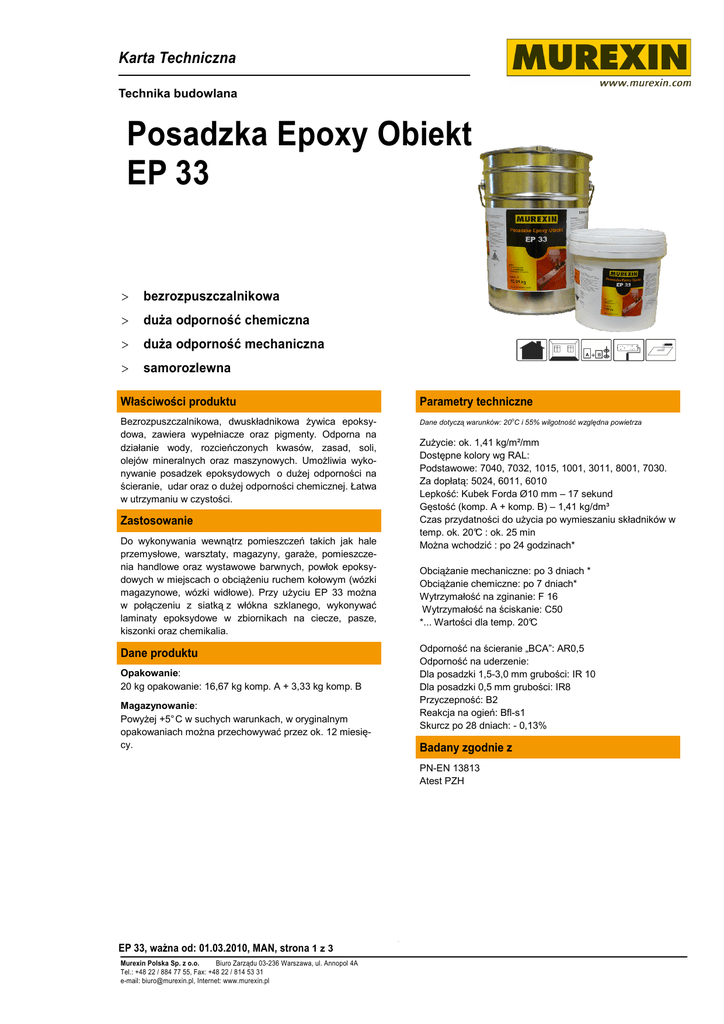 Karta Techniczna Technika budowlana BAT_EP33 Posadzka Epoxy Obiekt EP 33 > bezrozpuszczalnikowa > duża odporność chemiczna > duża odporność mechaniczna > samorozlewna Właściwości produktu Parametry techniczne Bezrozpuszczalnikowa, dwuskładnikowa żywica epoksydowa, zawiera wypełniacze oraz pigmenty. Odporna na działanie wody, rozcieńczonych kwasów, zasad, soli, olejów mineralnych oraz maszynowych. Umożliwia wykonywanie posadzek epoksydowych o dużej odporności na ścieranie, udar oraz o dużej odporności chemicznej. Łatwa w utrzymaniu w czystości. Dane dotyczą warunków: 20oC i 55% wilgotność względna powietrza Zużycie: ok. 1,41 kg/m²/mm Dostępne kolory wg RAL: Podstawowe: 7040, 7032, 1015, 1001, 3011, 8001, 7030. Za dopłatą: 5024, 6011, 6010 Lepkość: Kubek Forda Ø10 mm – 17 sekund Gęstość (komp. A + komp. B) – 1,41 kg/dm³ Czas przydatności do użycia po wymieszaniu składników w temp. ok. 20°C : ok. 25 min Można wchodzić : po 24 godzinach* Zastosowanie Do wykonywania wewnątrz pomieszczeń takich jak hale przemysłowe, warsztaty, magazyny, garaże, pomieszczenia handlowe oraz wystawowe barwnych, powłok epoksydowych w miejscach o obciążeniu ruchem kołowym (wózki magazynowe, wózki widłowe). Przy użyciu EP 33 można w połączeniu z siatką z włókna szklanego, wykonywać laminaty epoksydowe w zbiornikach na ciecze, pasze, kiszonki oraz chemikalia. Obciążanie mechaniczne: po 3 dniach * Obciążanie chemiczne: po 7 dniach* Wytrzymałość na zginanie: F 16 Wytrzymałość na ściskanie: C50 *... Wartości dla temp. 20°C Odporność na ścieranie „BCA”: AR0,5 Odporność na uderzenie: Dla posadzki 1,5-3,0 mm grubości: IR 10 Dla posadzki 0,5 mm grubości: IR8 Przyczepność: B2 Reakcja na ogień: Bfl-s1 Skurcz po 28 dniach: - 0,13% Dane produktu Opakowanie: 20 kg opakowanie: 16,67 kg komp. A + 3,33 kg komp. B Magazynowanie: Powyżej +5° C w suchych warunkach, w oryginalnym opakowaniach można przechowywać przez ok. 12 miesięcy. Badany zgodnie z PN-EN 13813 Atest PZH EP 33, ważna od: 01.03.2010, MAN, strona 1 z 3 Murexin Polska Sp. z o.o. Biuro Zarządu 03-236 Warszawa, ul. Annopol 4A Tel.: +48 22 / 884 77 55, Fax: +48 22 / 814 53 31 e-mail: [email protected], Internet: www.murexin.pl 1 Karta Techniczna Technika budowlana BAT_EP33 Obróbka: Stosowanie Posadzka samorozlewna: Narzędzia: Posadzka Epoksydowa Obiekt EP 33 może być wykonywana jako posadzka bezspoinowa, również na dużych powierzchniach. Jednak szczeliny dylatacyjne (konstrukcyjne) muszą zostać wypełnione materiałem trwale elastycznym. Mieszaninę żywicy należy wylać na odpowiednio przygotowane i zagruntowane podłoże, następnie rozprowadzić równomiernie za pomocą pacy zębatej na grubość 1,5-3,0 mm. Masa żywiczna posiada właściwości samorozlewne. Tak wykonaną powłokę żywiczną należy starannie odpowietrzyć za pomocą wałka kolczastego. Mieszadło wolnoobrotowe, paca zębata, paca, wałek. Podłoże: Podłoże musi suche, nośne, nieprzemarznięte, nieodkształcalne, wolne od kurzu, pyłu, niezaolejone, niezatłuszczone, wolne od substancji pogarszających przyczepność. Można stosować na podłożach spotykanych na placach budów takich jak beton, jastrych cementowy. Niestosować na podłożach bez izolacji przeciwwilgociowej. Podłoże: - wysezonowane przez min. 28 dni - beton klasy B25 - wilgotność podłoża max 4% - wytrzymałość na odrywanie 1,5 N/mm² - temperatura podłoża nie niższa niż 15ºC - zagruntowane Gruntem Epoxy Obiekt EP 73 Posadzka grubopowłokowa: Po wymieszaniu składników A i B stopniowo dodawać odpowiednia ilość piasku kwarcowego o właściwym uziarnieniu. Zaleca się dodawać piasek kwarcowy w ilości ok. 30-50 % wagowo w stosunku do żywicy. Dokładnie wymieszane składniki wylewać na posadzkę, rozprowadzać za pomocą pacy zębatej o odpowiednim uzębieniu. Tak wykonaną powłokę żywiczną należy starannie odpowietrzyć za pomocą wałka kolczastego. Gruntowanie: Chłonne podłoża należy zaimpregnować w celu zmniejszenia chłonności za pomocą żywicy epoksydowej Epoxy Obiekt EP 73. W celu poprawienia przyczepności powłok nakładanych w terminie późniejszym, zagruntowane podłoże posypać piecowo suszonym piaskiem kwarcowym o uziarnieniu 0,3-0,9 mm. Powłoka antypoślizgowa: W celu uzyskania powierzchni antypoślizgowej, niezwiązaną warstwę żywicy EP 33 posypać piaskiem kwarcowym o uziarnieniu 0,2-0,5 mm lub 0,3-0,9 mm. Po związaniu żywicy usunąć nadmiar piasku, przeszlifować powierzchnię i nałożyć powłokę malarska z żywicy EP 33 za pomocą wałka, zużycie żywicy jako warstwy zamykającej ok. 0,41,0 kg Przygotowanie podłoża: Podłoża cementowe nie powinny posiadać wilgotności większej niż 4,0 %. Minimalna wytrzymałość podłoża na ściskanie powinna być większa od 25 N/mm² . Wytrzymałość podłoża na odrywanie powinna być większa niż 1,5 N/mm². Zaleca się podłoże poddać obróbce za pomocą śrutowania, piaskowania, szlifowania bądź frezowania. Następnie podłoże należy starannie odkurzyć. Powłoka żywiczna charakteryzuje się paroszczelnością. Wilgoć podsiąkająca kapilarnie w podłożu może doprowadzić do tworzenia się pęcherzy pod powłoką żywiczną. Posypka z chipsów: Niezwiązaną powłokę żywiczną posypać za pomocą kolorowych płatków – Barwnych Chipsów. Po utwardzeniu posadzki powierzchnię polakierować za pomocą lakieru epoksydowego z połyskiem lub lakieru poliuretanowanego matującego. Mieszanie: Posadzka cienkopowłokowa: Odpowiednie ilości komponentów dostarczone w oryginalnych opakowaniach wymieszać ze sobą w proporcji wagowej A : B = 5 : 1. Należy wlać całkowitą ilość komponentu B do pojemnika z komponentem A, następnie całość starannie wymieszać za pomocą mieszadła wolnoobrotowego przez ok. 2-3 minut. Należy zwrócić szczególną uwagę, aby całość materiału została starannie wym