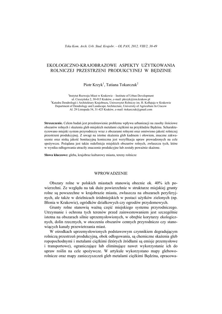 Teka Kom. Arch. Urb. Stud. Krajobr. – OL PAN, 2012, VIII/2, 38-49 EKOLOGICZNO-KRAJOBRAZOWE ASPEKTY UŻYTKOWANIA ROLNICZEJ PRZESTRZENI PRODUKCYJNEJ W BĘDZINIE Piotr Krzyk1, Tatiana Tokarczuk2 1 Instytut Rozwoju Miast w Krakowie – Institute of Urban Development ul. Cieszyńska 2, 30-015 Kraków, e-mail: [email protected] 2 Katedra Dendrologii i Architektury Krajobrazu, Uniwersytet Rolniczy im. H. Kołłątaja w Krakowie Department of Dendrology and Landscape Architecture, University of Agriculture In Cracow Al. 29 Listopada 54, 31-425 Kraków, e-mail: [email protected] Streszczenie. Celem badań jest przedstawienie problemu wpływu urbanizacji na zasoby ilościowe obszarów rolnych i skażenia gleb miejskich metalami ciężkimi na przykładzie Będzina. Scharakteryzowano miejski system przyrodniczy wraz z obszarami rolnymi oraz omówiono jakość rolniczej przestrzeni produkcyjnej. Z uwagi na istotne skażenia gleb kadmem i ołowiem, znaczne zakwaszenie oraz niską jakość bonitacyjną konieczna jest weryfikacja upraw prowadzonych na cele spożywcze. Pożądana jest także redefinicja miejskich obszarów rolnych, zwłaszcza tych, które w wyniku odłogowania utraciły znaczenie produkcyjne lub zostały poważnie skażone. Słowa kluczowe: gleba, krajobraz kulturowy miasta, tereny rolnicze WPROWADZENIE Obszary rolne w polskich miastach stanowią obecnie ok. 40% ich powierzchni. Ze względu na tak duże powierzchnie w strukturze miejskiej grunty rolne są powszechne w krajobrazie miasta, zwłaszcza na obszarach peryferyjnych, ale także w dzielnicach śródmiejskich w postaci użytków zielonych (np. Błonia w Krakowie), ogródków działkowych czy ogrodów przydomowych. Grunty rolne stanowią ważną część miejskiego systemu przyrodniczego. Utrzymanie i ochrona tych terenów przed zainwestowaniem jest szczególnie istotna na obszarach silnie uprzemysłowionych, w obrębie korytarzy ekologicznych, dolin rzecznych, w otoczeniu obszarów cennych przyrodniczo czy stanowiących kanały przewietrzania miast. W ośrodkach uprzemysłowionych podstawowym czynnikiem degradującym rolniczą przestrzeń produkcyjną, obok odłogowania, są chemiczne skażenia gleb ropopochodnymi i metalami ciężkimi (których źródłami są emisje przemysłowe i transportowe), ograniczające lub eliminujące nawet wykorzystanie ich do upraw roślin na cele spożywcze. W artykule wykorzystano mapy gleboworolnicze oraz mapy zanieczyszczeń gleb metalami ciężkimi Będzina, opracowa- EKOLOGICZNO-KRAJOBRAZOWE ASPEKTY UŻYTKOWANIA ROLNICZEJ PRZESTRZENI… 39 ne w Instytucie Uprawy Nawożenia i Gleboznawstwa w Puławach. Stanowią one podstawowe źródło o jakości rolniczej przestrzeni produkcyjnej i powinny być głównym narzędziem w decyzjach o wyłączeniu z użytkowania rolniczego i podejmowania decyzji planistycznych dotyczących kształtowania środowiska w obrębie miejskich obszarów rolnych. ZARYS FIZJOGRAFII I CHARAKTERYSTYKI PRZESTRZENNEJ BĘDZINA Będzin jest miastem powiatowym (ponad 58 tys. mieszk.), położonym we wschodniej części województwa śląskiego w konurbacji katowickiej na silnie uprzemysłowionym obszarze Górnośląskiego Okręgu Przemysłowego. Pod względem regionalizacji wg Kondrackiego [2002] Będzin znajduje się na obszarze Prowincji Śląsko-Krakowskiej makroregionu Wyżyna Śląska, mezoregionu Wyżyna Katowicka, granicząc z mezoregionem Garb Tarnogórski. Wyżyna Katowicka jest środkową częścią Wyżyny Śląskiej. Przez miasto na długości ok. 8 km przepływa Czarna Przemsza wraz z Pogorią i Potokiem Psarskim. Cały obszar miasta leży w zlewni Przemszy w dorzeczu Wisły. Na terenie miasta znajdują się przyrodniczo cenne obszary, do których zalicza się: Górę Zamkową, Wzgórze Doroty wraz ze Wzgórzem Parcina, Las Grodziecki. Stanowią one obszary chronionego krajobrazu o charakterze wyspowym. Ponadto w Będzinie znajduje się 8 użytków ekologicznych oraz liczne pomniki przyrody ożywionej. Obszar Będzina ma bardzo urozmaiconą rzeźbę terenu, która decyduje o zróżnicowanym topoklimacie. Wpływa to na nierównomierny rozkład zanieczyszczeń powietrza. Na powyższe wpływ ma również wielkość powierzchni poszczególnych typów użytkowania terenu, intensywność i rodzaj zabudowy. Będzin położony jest na kilku wzgórzach, między którymi rozciąga się stosunkowo szeroka dolina Czarnej Przemszy. To tutaj w obniżeniach, zwłaszcza w miesiącach zimowych, na które przypada duży udział dni o wysokim ciśnieniu atmosferycznym, kumulowane są zanieczyszczenia pochodzące w znacznej części z tzw. niskiej emisji. Najwyższym punktem terenu jest Góra św. Doroty (381 m n.p.m.), najniżej położone miejsce zaś znajduje się w dolinie Czarnej Przemszy (ok. 255 m n.p.m.). W strukturze ekologicznej miasta wyodrębnić można dolinę rzeczną, znajdującą się po jego południowej stronie oraz wyspowo rozmieszczone wzniesienia zwłaszcza w północnej części miasta. Szata roślinna Będzina została znacznie przekształcona różnorodną działalnością człowieka, związaną głównie z rozwojem przemysłu i urbanizacją terenu. Pomimo wzmożonej industrializacji w okresie minionych 150 lat, nie została ona całkowicie zniszczona. Zaistniały jednak znaczące zmiany w obrębie ekosystemów, przede wszystkim będące skutkiem zmian warunków hydrogeologicznych związanych z górnictwem. 40 P. Krzyk, T. Tokarczuk Ryc. 1. Szkic hipsometryczny Będzina [Program Ochrony Środowiska… 2004] Fig. 1. Hypsometric sketch of Będzin [Program Ochrony Środowiska… 2004] W skali miasta najwięcej terenów rolnych znajduje się w Grodźcu, terenów zieleni w Gzichowie. Obszary przemysłowe zajmują 6% powierzchni miasta, przy czym ok. 73% z nich znajduje się w Łagiszy, Grodźcu i Warpiu. Główne zakłady przemysłowe Będzina to: PKE SA Oddział Elektrownia Łagisza, Elektrociepłownia Będzin SA, Huta Będzin SA – zlokalizowane odpowiednio w Łagi