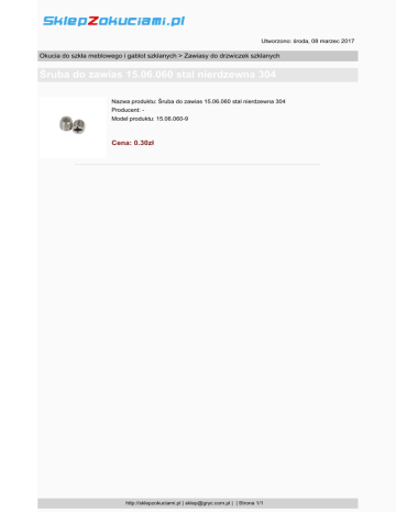 Utworzono: środa, 08 marzec 2017 Okucia do szkła meblowego i gablot szklanych > Zawiasy do drzwiczek szklanych Śruba do zawias 15.06.060 stal nierdzewna 304 Nazwa produktu: Śruba do zawias 15.06.060 stal nierdzewna 304 Producent: Model produktu: 15.06.060-9 Cena: 0.30zł http://sklepzokuciami.pl | [email protected] | | Strona 1/1