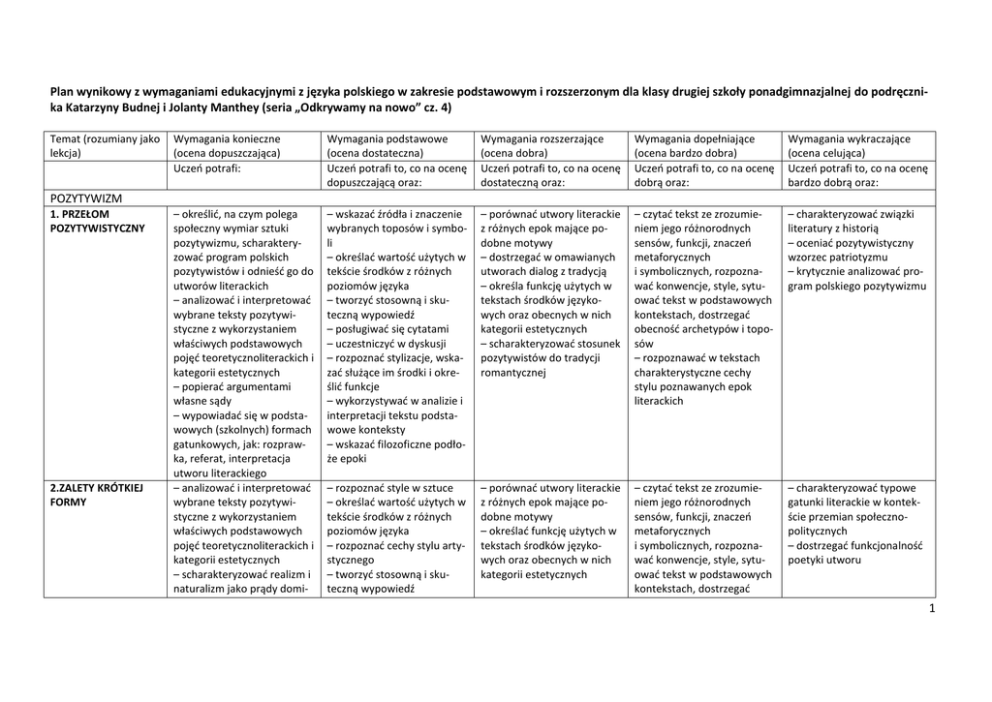 Plan wynikowy z wymaganiami edukacyjnymi z języka polskiego w zakresie podstawowym i rozszerzonym dla klasy drugiej szkoły ponadgimnazjalnej do podręcznika Katarzyny Budnej i Jolanty Manthey (seria „Odkrywamy na nowo” cz. 4) Temat (rozumiany jako lekcja) Wymagania konieczne (ocena dopuszczająca) Uczeń potrafi: Wymagania podstawowe (ocena dostateczna) Uczeń potrafi to, co na ocenę dopuszczającą oraz: Wymagania rozszerzające (ocena dobra) Uczeń potrafi to, co na ocenę dostateczną oraz: Wymagania dopełniające (ocena bardzo dobra) Uczeń potrafi to, co na ocenę dobrą oraz: Wymagania wykraczające (ocena celująca) Uczeń potrafi to, co na ocenę bardzo dobrą oraz: – określić, na czym polega społeczny wymiar sztuki pozytywizmu, scharakteryzować program polskich pozytywistów i odnieść go do utworów literackich – analizować i interpretować wybrane teksty pozytywistyczne z wykorzystaniem właściwych podstawowych pojęć teoretycznoliterackich i kategorii estetycznych – popierać argumentami własne sądy – wypowiadać się w podstawowych (szkolnych) formach gatunkowych, jak: rozprawka, referat, interpretacja utworu literackiego – analizować i interpretować wybrane teksty pozytywistyczne z wykorzystaniem właściwych podstawowych pojęć teoretycznoliterackich i kategorii estetycznych – scharakteryzować realizm i naturalizm jako prądy domi- – wskazać źródła i znaczenie wybranych toposów i symboli – określać wartość użytych w tekście środków z różnych poziomów języka – tworzyć stosowną i skuteczną wypowiedź – posługiwać się cytatami – uczestniczyć w dyskusji – rozpoznać stylizacje, wskazać służące im środki i określić funkcje – wykorzystywać w analizie i interpretacji tekstu podstawowe konteksty – wskazać filozoficzne podłoże epoki – porównać utwory literackie z różnych epok mające podobne motywy – dostrzegać w omawianych utworach dialog z tradycją – określa funkcję użytych w tekstach środków językowych oraz obecnych w nich kategorii estetycznych – scharakteryzować stosunek pozytywistów do tradycji romantycznej – czytać tekst ze zrozumieniem jego różnorodnych sensów, funkcji, znaczeń metaforycznych i symbolicznych, rozpoznawać konwencje, style, sytuować tekst w podstawowych kontekstach, dostrzegać obecność archetypów i toposów – rozpoznawać w tekstach charakterystyczne cechy stylu poznawanych epok literackich – charakteryzować związki literatury z historią – oceniać pozytywistyczny wzorzec patriotyzmu – krytycznie analizować program polskiego pozytywizmu – rozpoznać style w sztuce – określać wartość użytych w tekście środków z różnych poziomów języka – rozpoznać cechy stylu artystycznego – tworzyć stosowną i skuteczną wypowiedź – porównać utwory literackie z różnych epok mające podobne motywy – określać funkcję użytych w tekstach środków językowych oraz obecnych w nich kategorii estetycznych – czytać tekst ze zrozumieniem jego różnorodnych sensów, funkcji, znaczeń metaforycznych i symbolicznych, rozpoznawać konwencje, style, sytuować tekst w podstawowych kontekstach, dostrzegać – charakteryzować typowe gatunki literackie w kontekście przemian społecznopolitycznych – dostrzegać funkcjonalność poetyki utworu POZYTYWIZM 1. PRZEŁOM POZYTYWISTYCZNY 2.ZALETY KRÓTKIEJ FORMY 1 3. POZYTYWIŚCI WOBEC POWSTANIA STYCZNIOWEGO nujące w pozytywizmie, wskazać nowe obszary zainteresowań literatury i preferowane gatunki, podając przykłady utworów literackich – popierać argumentami własne sądy – wypowiadać się w podstawowych (szkolnych) formach gatunkowych, jak: rozprawka, referat, interpretacja utworu literackiego – zna treść omawianego utworu literackiego – analizować i interpretować wybrane teksty pozytywistyczne z wykorzystaniem właściwych podstawowych pojęć teoretycznoliterackich i kategorii estetycznych – popierać argumentami własne sądy – wypowiadać się w podstawowych (szkolnych) formach gatunkowych, jak: rozprawka, referat, interpretacja utworu literackiego – posługiwać się cytatami – uczestniczyć w dyskusji – sporządzać notatkę , zestawienie bibliograficzne, bazę danych z wykorzystaniem Internetu – rozpoznać stylizacje, wskazać służące im środki i określić funkcje – wykorzystywać w analizie i interpretacji tekstu podstawowe konteksty – scharakteryzować poetykę realizmu – wskazać źródła i znaczenie wybranych toposów i symboli – określać wartość użytych w tekście środków z różnych poziomów języka – tworzyć stosowną i skuteczną wypowiedź, posługiwać się cytatami – uczestniczyć w dyskusji – sporządzać notatkę, zestawienie bibliograficzne, bazę danych z wykorzystaniem Internetu – rozpoznać stylizacje, wskazać służące im środki i określić funkcje – wykorzystywać w analizie i interpretacji tekstu podstawowe konteksty obecność archetypów i toposów – rozpoznawać w tekstach charakterystyczne cechy stylu poznawanych epok literackich – określa funkcję użytych w tekstach środków językowych oraz obecnych w nich kategorii estetycznych – scharakteryzować stosunek pozytywistów do tradycji romantycznej – czytać tekst ze zrozumieniem jego różnorodnych sensów, funkcji, znaczeń metaforycznych i symbolicznych, rozpoznawać konwencje, style, sytuować tekst w podstawowych kontekstach, dostrzegać obecność archetypów i toposów – oceniać pozytywistyczny wzorzec patriotyzmu – krytycznie analizować postawy i poglądy wyrażane w tekstach literackich – dostrzec obecność tradycji w dyskursie współczesnym 2 4. IDEALIŚCI W KONFRONTACJI Z RZECZYWISTOŚCIĄ – LALKA BOLESŁAWA PRUSA – analizować i interpretować wybrane teksty pozytywistyczne z wykorzystaniem właściwych podstawowych pojęć teoretycznoliterackich i kategorii estetycznych – scharakteryzować re