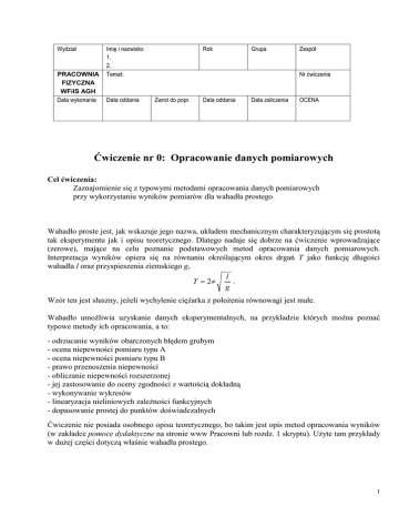 Wydział PRACOWNIA FIZYCZNA WFiIS AGH Data wykonania Imię i nazwisko 1. 2. Temat: Data oddania Rok Grupa Zespół Nr ćwiczenia Zwrot do popr. Data oddania Data zaliczenia OCENA Ćwiczenie nr 0: Opracowanie danych pomiarowych Cel ćwiczenia: Zaznajomienie się z typowymi metodami opracowania danych pomiarowych przy wykorzystaniu wyników pomiarów dla wahadła prostego Wahadło proste jest, jak wskazuje jego nazwa, układem mechanicznym charakteryzującym się prostotą tak eksperymentu jak i opisu teoretycznego. Dlatego nadaje się dobrze na ćwiczenie wprowadzające (zerowe), mające na celu poznanie podstawowych metod opracowania danych pomiarowych. Interpretacja wyników opiera się na równaniu określającym okres drgań T jako funkcję długości wahadła l oraz przyspieszenia ziemskiego g, l T = 2π . g Wzór ten jest słuszny, jeŜeli wychylenie cięŜarka z połoŜenia równowagi jest małe. Wahadło umoŜliwia uzyskanie danych eksperymentalnych, na przykładzie których moŜna poznać typowe metody ich opracowania, a to: - odrzucanie wyników obarczonych błędem grubym - ocena niepewności pomiaru typu A - ocena niepewności pomiaru typu B - prawo przenoszenia niepewności - obliczanie niepewności rozszerzonej - jej zastosowanie do oceny zgodności z wartością dokładną - wykonywanie wykresów - linearyzacja nieliniowych zaleŜności funkcyjnych - dopasowanie prostej do punktów doświadczalnych Ćwiczenie nie posiada osobnego opisu teoretycznego, bo takim jest opis metod opracowania wyników (w zakładce pomoce dydaktyczne na stronie www Pracowni lub rozdz. 1 skryptu). UŜyte tam przykłady w duŜej części dotyczą właśnie wahadła prostego. 1 1. Układ pomiarowy 1. Zestaw wahadła prostego (rys. w1) 2. Sekundomierz (stoper) 3. Przymiar milimetrowy (linijka) Rys. w1. Zestaw wahadła prostego. 2. Wykonanie ćwiczenia 1. Pomiary okresu dla ustalonej długości wahadła: a) Przy uŜyciu przymiaru milimetrowego zmierz długość wahadła rozumianą jako odległość od środka cięŜarka do punktu zamocowania jego nici (rys. 1), b) Wprowadź wahadło w ruch drgający o amplitudzie kątowej nie przekraczającej trzech stopni. Następnie zmierz czas k = 20 ÷ 40 okresów. WaŜne jest, by uruchamiać i zatrzymywać sekundomierz w tej samej fazie ruchu (np. maksymalne wychylenie w prawo), bez zatrzymywania wahadła. c) Pomiar ten powtórz dziesięciokrotnie. Liczba okresów k w kolejnych pomiarach moŜe być taka sama, lub zmieniana w podanych wyŜej granicach. Uwaga: wahadło nie jest wyposaŜone w kątomierz. Przed wykonaniem pomiaru oblicz amplitudę A drgań (rys. w1) jako iloczyn długości l i kąta 3° przeliczonego na miarę łukową. 2. Pomiary zaleŜności okresu drgań od długości wahadła. Wykonaj kilkanaście pojedynczych pomiarów okresu (jak w pt. 1b), zmieniając długość wahadła w zakresie od około 10 cm do długości maksymalnej. 2 3. Wyniki pomiarów Tabela 1. Pomiar okresu drgań przy ustalonej długości wahadła długość wahadła l = ......... ....... niepewność pomiaru u(l) = ......... ....... Lp. liczba okresów k czas t dla k okresów [s] okres Ti = t/k [s] 1 2 3 4 5 6 7 8 9 10 Tabela 2. Pomiar zaleŜności okresu drgań od długości wahadła Lp. l [mm] k t [s] Ti [s] Ti2 [s2] 1 2 3 4 5 6 7 8 9 10 11 12 13 14 15 3 4. Opracowanie wyników pomiaru 1. Oceń, czy wyniki pomiaru okresu nie zawierają błędów grubych. (Zwrócić uwagę na największą i najmniejszą wartość Ti w uzyskanym zestawie danych). 2. Oblicz niepewność pomiaru okresu (typu A). 3. Oceń niepewność pomiaru długości wahadła (typu B). 4. Na podstawie uzyskanych wartości l i T oblicz przyspieszenie ziemskie. 5. Oblicz niepewność złoŜoną uc(g) przy pomocy prawa przenoszenia niepewności. 6. Oblicz niepewność rozszerzoną U(g). 7. Czy uzyskana wartość przyspieszenia ziemskiego jest zgodna, w granicach niepewności rozszerzonej, z wartością tabelaryczną? Dla Krakowa g = 9,811 m/s2. 8. Wykonaj wykres zaleŜności okresu od długości wahadła T(l). 9. Wykonaj wykres zlinearyzowany T2 w funkcji l. 10. Do ostatniego wykresu dopasuj prostą przechodzącą przez początek układu współrzędnych metodą graficzną lub metodą najmniejszych kwadratów (wzory (1.26) i (1.27), względnie stosowna opcja w programie komputerowym). Uwaga: zakres wykonania ćwiczenia i opracowania danych moŜe być zmodyfikowany przez prowadzącego zajęcia. 4