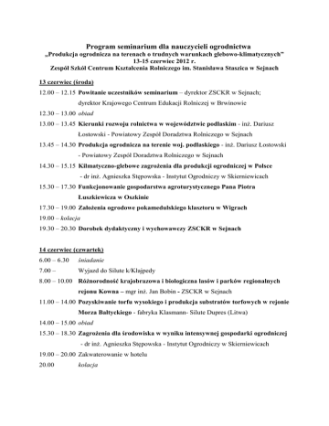 Program seminarium dla nauczycieli ogrodnictwa „Produkcja ogrodnicza na terenach o trudnych warunkach glebowo-klimatycznych” 13-15 czerwiec 2012 r. Zespół Szkół Centrum Kształcenia Rolniczego im. Stanisława Staszica w Sejnach 13 czerwiec (środa) 12.00 – 12.15 Powitanie uczestników seminarium – dyrektor ZSCKR w Sejnach; dyrektor Krajowego Centrum Edukacji Rolniczej w Brwinowie 12.30 – 13.00 obiad 13.00 – 13.45 Kierunki rozwoju rolnictwa w województwie podlaskim - inż. Dariusz Łostowski - Powiatowy Zespół Doradztwa Rolniczego w Sejnach 13.45 – 14.30 Produkcja ogrodnicza na terenie woj. podlaskiego - inż. Dariusz Łostowski - Powiatowy Zespół Doradztwa Rolniczego w Sejnach 14.30 – 15.15 Kilmatyczno-glebowe zagrożenia dla produkcji ogrodniczej w Polsce - dr inż. Agnieszka Stępowska - Instytut Ogrodniczy w Skierniewicach 15.30 – 17.30 Funkcjonowanie gospodarstwa agroturystycznego Pana Piotra Łuszkiewicza w Oszkinie 17.30 – 19.00 Założenia ogrodowe pokamedulskiego klasztoru w Wigrach 19.00 – kolacja 19.30 – 20.30 Dorobek dydaktyczny i wychowawczy ZSCKR w Sejnach 14 czerwiec (czwartek) 6.00 – 6.30 śniadanie 7.00 – Wyjazd do Silute k/Kłajpedy 8.00 – 10.00 Różnorodność krajobrazowa i biologiczna lasów i parków regionalnych rejonu Kowna – mgr inż. Jan Bobin - ZSCKR w Sejnach 11.00 – 14.00 Pozyskiwanie torfu wysokiego i produkcja substratów torfowych w rejonie Morza Bałtyckiego - fabryka Klasmann- Silute Dupres (Litwa) 14.00 – 15.00 obiad 15.30 – 18.30 Zagrożenia dla środowiska w wyniku intensywnej gospodarki ogrodniczej - dr inż. Agnieszka Stępowska - Instytut Ogrodniczy w Skierniewicach 19.00 – 20.00 Zakwaterowanie w hotelu 20.00 kolacja 15 czerwiec (piątek) 7.00 – 7.30 śniadanie 8.00 –15.00 Gatunki drzew i krzewów ozdobnych w nasadzeniach miejskich w Wilnie. Prezentacja dorobku historycznego i kulturowego miasta Wilna – mgr inż. Jan Bobin – ZSCKR w Sejnach 15.00 – 15.30 obiad 16.00 – Różnorodność krajobrazowa i biologiczna lasów i parków regionalnych rejonu Wilna – mgr inż. Jan Bobin- ZSCKR w Sejnach 18.00 – kolacja 19.00 Podsumowanie seminarium. Ocena arkuszy ewaluacyjnych mgr inż. Marianna Deroń – KCER w Brwinowie 16 czerwiec (sobota) 7.00 – 7.30 śniadanie Dodatkowa propozycja: 9.00 –12.00 Technologia produkcji borówki wysokiej - gospodarstwo Pana Jerzego Wilczewskiego w Biełousach k/Janowa 12.00 – 13.00 obiad Organizator seminarium: Marianna Deroń tel. (22) 729 73 02 wew. 28 kom. 692 231 668 e-mail; [email protected]