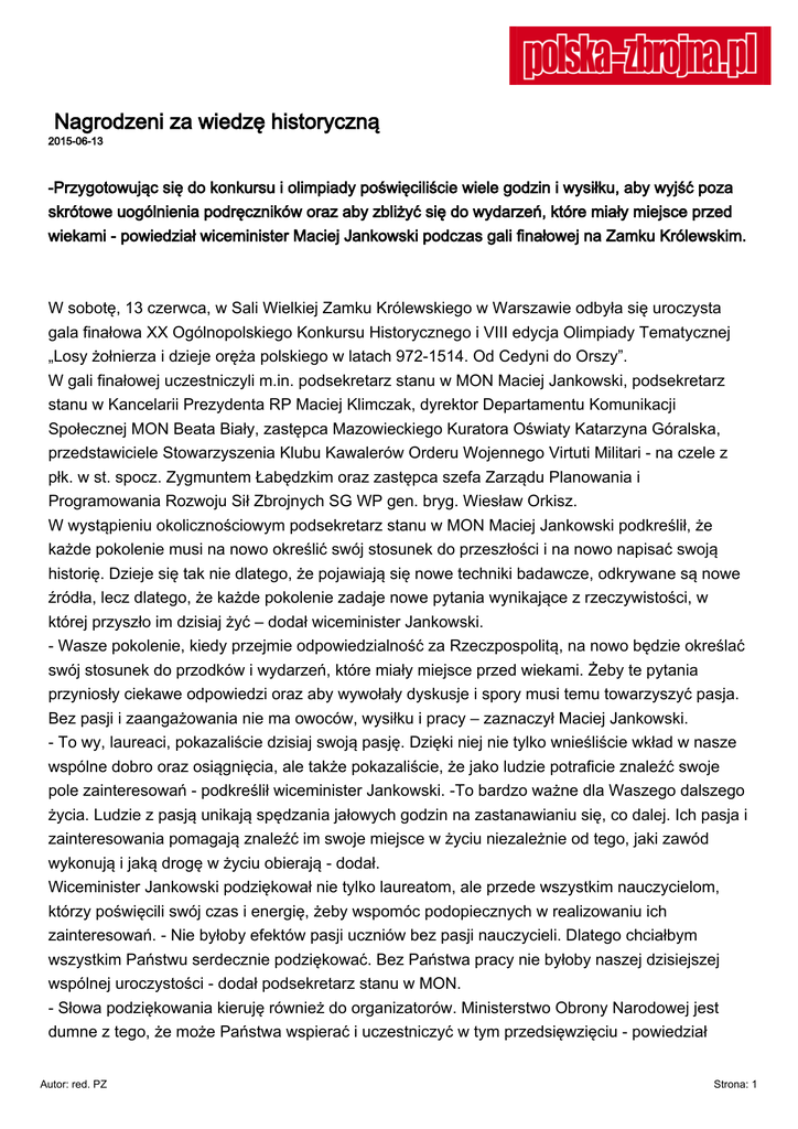 Nagrodzeni za wiedzę historyczną 2015-06-13 -Przygotowując się do konkursu i olimpiady poświęciliście wiele godzin i wysiłku, aby wyjść poza skrótowe uogólnienia podręczników oraz aby zbliżyć się do wydarzeń, które miały miejsce przed wiekami - powiedział wiceminister Maciej Jankowski podczas gali finałowej na Zamku Królewskim. W sobotę, 13 czerwca, w Sali Wielkiej Zamku Królewskiego w Warszawie odbyła się uroczysta gala finałowa XX Ogólnopolskiego Konkursu Historycznego i VIII edycja Olimpiady Tematycznej „Losy żołnierza i dzieje oręża polskiego w latach 972-1514. Od Cedyni do Orszy”. W gali finałowej uczestniczyli m.in. podsekretarz stanu w MON Maciej Jankowski, podsekretarz stanu w Kancelarii Prezydenta RP Maciej Klimczak, dyrektor Departamentu Komunikacji Społecznej MON Beata Biały, zastępca Mazowieckiego Kuratora Oświaty Katarzyna Góralska, przedstawiciele Stowarzyszenia Klubu Kawalerów Orderu Wojennego Virtuti Militari - na czele z płk. w st. spocz. Zygmuntem Łabędzkim oraz zastępca szefa Zarządu Planowania i Programowania Rozwoju Sił Zbrojnych SG WP gen. bryg. Wiesław Orkisz. W wystąpieniu okolicznościowym podsekretarz stanu w MON Maciej Jankowski podkreślił, że każde pokolenie musi na nowo określić swój stosunek do przeszłości i na nowo napisać swoją historię. Dzieje się tak nie dlatego, że pojawiają się nowe techniki badawcze, odkrywane są nowe źródła, lecz dlatego, że każde pokolenie zadaje nowe pytania wynikające z rzeczywistości, w której przyszło im dzisiaj żyć – dodał wiceminister Jankowski. - Wasze pokolenie, kiedy przejmie odpowiedzialność za Rzeczpospolitą, na nowo będzie określać swój stosunek do przodków i wydarzeń, które miały miejsce przed wiekami. Żeby te pytania przyniosły ciekawe odpowiedzi oraz aby wywołały dyskusje i spory musi temu towarzyszyć pasja. Bez pasji i zaangażowania nie ma owoców, wysiłku i pracy – zaznaczył Maciej Jankowski. - To wy, laureaci, pokazaliście dzisiaj swoją pasję. Dzięki niej nie tylko wnieśliście wkład w nasze wspólne dobro oraz osiągnięcia, ale także pokazaliście, że jako ludzie potraficie znaleźć swoje pole zainteresowań - podkreślił wiceminister Jankowski. -To bardzo ważne dla Waszego dalszego życia. Ludzie z pasją unikają spędzania jałowych godzin na zastanawianiu się, co dalej. Ich pasja i zainteresowania pomagają znaleźć im swoje miejsce w życiu niezależnie od tego, jaki zawód wykonują i jaką drogę w życiu obierają - dodał. Wiceminister Jankowski podziękował nie tylko laureatom, ale przede wszystkim nauczycielom, którzy poświęcili swój czas i energię, żeby wspomóc podopiecznych w realizowaniu ich zainteresowań. - Nie byłoby efektów pasji uczniów bez pasji nauczycieli. Dlatego chciałbym wszystkim Państwu serdecznie podziękować. Bez Państwa pracy nie byłoby naszej dzisiejszej wspólnej uroczystości - dodał podsekretarz stanu w MON. - Słowa podziękowania kieruję również do organizatorów. Ministerstwo Obrony Narodowej jest dumne z tego, że może Państwa wspierać i uczestniczyć w tym przedsięwzięciu - powiedział Autor: red. PZ Strona: 1 kończąc swoje wystąpienie wiceminister Maciej Jankowski. Podczas uroczystej gali na Zamku Królewskim uhonorowani zostali laureaci XX Ogólnopolskiego Konkursu Historycznego i VIII edycji Olimpiady Tematycznej „Losy żołnierza i dzieje oręża polskiego w latach 972-1514. Od Cedyni do Orszy”. Nagrody oraz medale pamiątkowe wręczyli m.in. wiceminister Maciej Jankowski, zastępca Mazowieckiego Kuratora Oświaty Katarzyna Góralska, przedstawiciel Stowarzyszenia Klubu Kawalerów Orderu Wojennego Virtuti Militari płk w st. spocz. Zygmunt Łabędzki. W przeddzień gali, 12 czerwca br., uczestnicy i organizatorzy Konkursu i Olimpiady wzięli udział w uroczystości patriotycznej na placu Marszałka Józefa Piłsudskiego. Przy Grobie Nieznanego Żołnierza odbyła się zmiana posterunku honorowego, złożenie kwiatów oraz wpis do księgi pamiątkowej. XX Ogólnopolski Konkurs Historyczny i Olimpiada Tematyczna „Losy żołnierza i dzieje oręża polskiego” jest przedsięwzięciem o wieloletniej tradycji, skierowanym do uczniów szkół podstawowych, gimnazjalnych i ponadgimnazjalnych. Obejmuje swoją tematyką historię Polski i dzieje oręża polskiego ze szczególnym uwzględnieniem znajomości broni i barwy, architektury obronnej, topografii wojskowej, heraldyki, falerystyki, formacji wojskowych oraz ich dowódców. Najważniejszymi celami Konkursu i Olimpiady są: kształtowanie postaw patriotycznych młodego pokolenia poprzez upowszechnianie wiedzy o historii oręża polskiego w różnych okresach historycznych oraz o znaczeniu Sił Zbrojnych w życiu narodu i państwa polskiego, popularyzowanie wśród młodzieży wiedzy o losach żołnierza oraz kształtowanie umiejętności kreatywno-krytycznego myślenia o dziejach minionych. Źródło: MON Autor: red. PZ Strona: 2