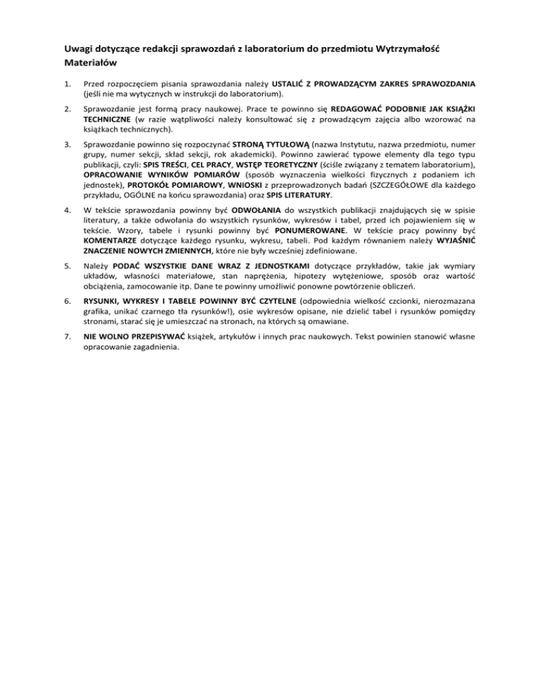 Uwagi dotyczące redakcji sprawozdań z laboratorium do przedmiotu Wytrzymałość Materiałów 1. Przed rozpoczęciem pisania sprawozdania należy USTALIĆ Z PROWADZĄCYM ZAKRES SPRAWOZDANIA (jeśli nie ma wytycznych w instrukcji do laboratorium). 2. Sprawozdanie jest formą pracy naukowej. Prace te powinno się REDAGOWAĆ PODOBNIE JAK KSIĄŻKI TECHNICZNE (w razie wątpliwości należy konsultować się z prowadzącym zajęcia albo wzorować na książkach technicznych). 3. Sprawozdanie powinno się rozpoczynać STRONĄ TYTUŁOWĄ (nazwa Instytutu, nazwa przedmiotu, numer grupy, numer sekcji, skład sekcji, rok akademicki). Powinno zawierać typowe elementy dla tego typu publikacji, czyli: SPIS TREŚCI, CEL PRACY, WSTĘP TEORETYCZNY (ściśle związany z tematem laboratorium), OPRACOWANIE WYNIKÓW POMIARÓW (sposób wyznaczenia wielkości fizycznych z podaniem ich jednostek), PROTOKÓŁ POMIAROWY, WNIOSKI z przeprowadzonych badań (SZCZEGÓŁOWE dla każdego przykładu, OGÓLNE na końcu sprawozdania) oraz SPIS LITERATURY. 4. W tekście sprawozdania powinny być ODWOŁANIA do wszystkich publikacji znajdujących się w spisie literatury, a także odwołania do wszystkich rysunków, wykresów i tabel, przed ich pojawieniem się w tekście. Wzory, tabele i rysunki powinny być PONUMEROWANE. W tekście pracy powinny być KOMENTARZE dotyczące każdego rysunku, wykresu, tabeli. Pod każdym równaniem należy WYJAŚNIĆ ZNACZENIE NOWYCH ZMIENNYCH, które nie były wcześniej zdefiniowane. 5. Należy PODAĆ WSZYSTKIE DANE WRAZ Z JEDNOSTKAMI dotyczące przykładów, takie jak wymiary układów, własności materiałowe, stan naprężenia, hipotezy wytężeniowe, sposób oraz wartość obciążenia, zamocowanie itp. Dane te powinny umożliwić ponowne powtórzenie obliczeń. 6. RYSUNKI, WYKRESY I TABELE POWINNY BYĆ CZYTELNE (odpowiednia wielkość czcionki, nierozmazana grafika, unikać czarnego tła rysunków!), osie wykresów opisane, nie dzielić tabel i rysunków pomiędzy stronami, starać się je umieszczać na stronach, na których są omawiane. 7. NIE WOLNO PRZEPISYWAĆ książek, artykułów i innych prac naukowych. Tekst powinien stanowić własne opracowanie zagadnienia.