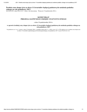 5.12.2016 LEX Średnia cena skupu żyta za okres 11 kwartałów będącej podstawą do ustalenia podatku rolnego na rok podatkowy 2017. Średnia cena skupu żyta za okres 11 kwartałów będącej podstawą do ustalenia podatku rolnego na rok podatkowy 2017. M.P.2016.993 z dnia 2016.10.19 Status: Akt nieoceniany Wersja od: 19 października 2016 r. KOMUNIKAT PREZESA GŁÓWNEGO URZĘDU STATYSTYCZNEGO z dnia 18 października 2016 r. w sprawie średniej ceny skupu żyta za okres 11 kwartałów będącej podstawą do ustalenia podatku rolnego na rok podatkowy 2017 Na podstawie art. 6 ust. 2 ustawy z dnia 15 listopada 1984 r. o podatku rolnym (Dz. U. z 2016 r. poz. 617 i 1579) ogłasza się, że średnia cena skupu żyta za okres 11 kwartałów poprzedzających kwartał poprzedzający rok podatkowy 2017 wynosi 52,44 zł za 1 dt. https://sip.lex.pl/#/akt/18359165/2107067/sredniacenaskupuzytazaokres11kwartalowbedacejpodstawadoustaleniapodatkurolnegona... 1/1
