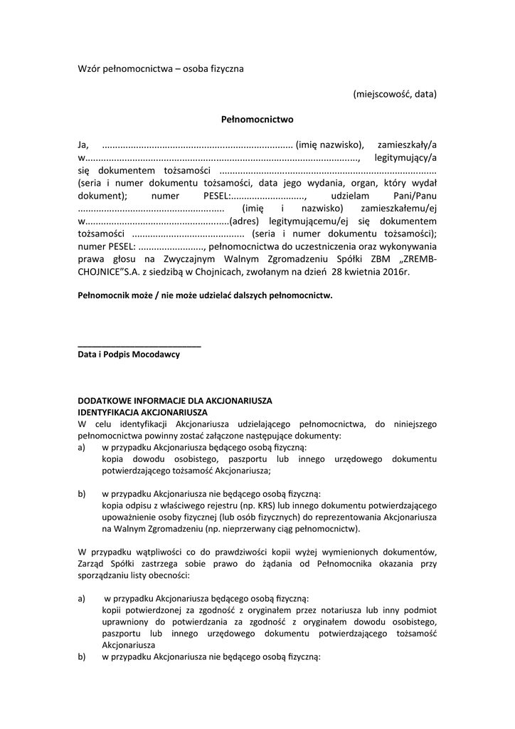 Wzór pełnomocnictwa – osoba fizyczna (miejscowość, data) Pełnomocnictwo Ja, ......................................................................... (imię nazwisko), zamieszkały/a w........................................................................................................, legitymujący/a się dokumentem tożsamości ................................................................................... (seria i numer dokumentu tożsamości, data jego wydania, organ, który wydał dokument); numer PESEL:............................, udzielam Pani/Panu ........................................................ (imię i nazwisko) zamieszkałemu/ej w.......................................................(adres) legitymującemu/ej się dokumentem tożsamości ........................................... (seria i numer dokumentu tożsamości); numer PESEL: ........................., pełnomocnictwa do uczestniczenia oraz wykonywania prawa głosu na Zwyczajnym Walnym Zgromadzeniu Spółki ZBM „ZREMBCHOJNICE”S.A. z siedzibą w Chojnicach, zwołanym na dzień 28 kwietnia 2016r. Pełnomocnik może / nie może udzielać dalszych pełnomocnictw. __________________________ Data i Podpis Mocodawcy DODATKOWE INFORMACJE DLA AKCJONARIUSZA IDENTYFIKACJA AKCJONARIUSZA W celu identyfikacji Akcjonariusza udzielającego pełnomocnictwa, do niniejszego pełnomocnictwa powinny zostać załączone następujące dokumenty: a) w przypadku Akcjonariusza będącego osobą fizyczną: kopia dowodu osobistego, paszportu lub innego urzędowego dokumentu potwierdzającego tożsamość Akcjonariusza; b) w przypadku Akcjonariusza nie będącego osobą fizyczną: kopia odpisu z właściwego rejestru (np. KRS) lub innego dokumentu potwierdzającego upoważnienie osoby fizycznej (lub osób fizycznych) do reprezentowania Akcjonariusza na Walnym Zgromadzeniu (np. nieprzerwany ciąg pełnomocnictw). W przypadku wątpliwości co do prawdziwości kopii wyżej wymienionych dokumentów, Zarząd Spółki zastrzega sobie prawo do żądania od Pełnomocnika okazania przy sporządzaniu listy obecności: a) b) w przypadku Akcjonariusza będącego osobą fizyczną: kopii potwierdzonej za zgodność z oryginałem przez notariusza lub inny podmiot uprawniony do potwierdzania za zgodność z oryginałem dowodu osobistego, paszportu lub innego urzędowego dokumentu potwierdzającego tożsamość Akcjonariusza w przypadku Akcjonariusza nie będącego osobą fizyczną: oryginału lub kopii potwierdzonej za zgodność z oryginałem przez notariusza lub inny podmiot uprawniony do potwierdzania za zgodność z oryginałem odpisu z właściwego rejestru (np. KRS) lub innego dokumentu potwierdzającego upoważnienie osoby fizycznej (lub osób fizycznych) do reprezentowania Akcjonariusza na Walnym Zgromadzeniu (np. nieprzerwany ciąg pełnomocnictw) IDENTYFIKACJA PEŁNOMOCNIKA W celu identyfikacji pełnomocnika, Zarząd Spółki zastrzega sobie prawo do żądania od pełnomocnika okazania przy sporządzaniu listy obecności: a) w przypadku Pełnomocnika będącego osobą fizyczną: dowodu osobistego, paszportu lub innego urzędowego dokumentu potwierdzającego tożsamość Pełnomocnika; b w przypadku Pełnomocnika nie będącego osobą fizyczną: oryginału lub kopii potwierdzonej za zgodność z oryginałem przez notariusza lub inny podmiot uprawniony do potwierdzania za zgodność z oryginałem odpisu z właściwego rejestru (np. KRS) lub innego dokumentu potwierdzającego upoważnienie osoby fizycznej (lub osób fizycznych) do reprezentowania Akcjonariusza na Walnym Zgromadzeniu (np. nieprzerwany ciąg pełnomocnictw). Zarząd Spółki zastrzega, że w przypadku wystąpienia rozbieżności pomiędzy danymi Akcjonariusza wskazanymi w Pełnomocnictwie a danymi znajdującymi się na liście akcjonariuszy sporzadzonej w oparciu o wykaz otrzymany od podmiotu prowadzacego depozyt papierów wartościowych Krajowy Depozyt Papierów Wartościowych S.A. z siedzibą w Warszawie) i przekazanego Spółce zgodnie z art. 406³ KSH, Akcjonariusz może nie zostać dopuszczony do uczestnictwa w Walnym Zgromadzeniu Spółki. Jednocześnie Zarząd Spółki zwraca uwagę, iż zgodnie z Regulaminem Walnych Zgromadzeń Spółki i KSH, Spółka nie nakłada obowiązku udzielania pełnomocnictw na niniejszym formularzu. Wzór pełnomocnictwa – osoba prawna (miejscowość, data) Pełnomocnictwo ................................................. (nazwa), z siedzibą w ........................................................................................................................................ ......... (adres siedziby, dane rejestrowe), reprezentowany/a/e przez: ........................................................................................................................................ .................................................. (imię i nazwisko, funkcja) – zamieszkałego/ą w........................................... (adres), legitymującego/ą się dokumentem tożsamości .............................................................................................................. (seria i numer dokumentu tożsamości; data jego wydania; organ, który wydał dokument); numer PESEL: .................., udziela Pani/Panu .............................................. zamieszkałemu/ej w....................................................................... (adres) legitymującemu/ej się dokumentem tożsamości .................................... (seria i numer dokumentu tożsamości), pełnomocnictwa do uczestniczenia oraz wykonywania prawa głosu na Zwyczajnym Walnym Zgromadzeniu Spółki ZBM „ZREMB-CHOJNICE” S.A. z siedzibą w Chojnicach, zwołanym na dzień 28 kwietnia 2016r. Pełnomocnik może / nie może udzielać dalszych pełnomocnictw __________________________ Data i Podpis Mocodawcy DODATKOWE INFORMACJE DLA AKCJONARIUSZA IDENTYFIKACJA AKCJONARIUSZA W celu identyfikacji Akcjonariusza udzielającego pełno