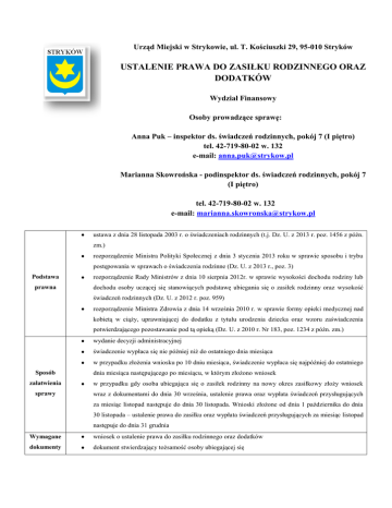 Urząd Miejski w Strykowie, ul. T. Kościuszki 29, 95-010 Stryków USTALENIE PRAWA DO ZASIŁKU RODZINNEGO ORAZ DODATKÓW Wydział Finansowy Osoby prowadzące sprawę: Anna Puk – inspektor ds. świadczeń rodzinnych, pokój 7 (I piętro) tel. 42-719-80-02 w. 132 e-mail: [email protected] Marianna Skowrońska - podinspektor ds. świadczeń rodzinnych, pokój 7 (I piętro) tel. 42-719-80-02 w. 132 e-mail: [email protected] ustawa z dnia 28 listopada 2003 r. o świadczeniach rodzinnych (t.j. Dz. U. z 2013 r. poz. 1456 z późn. zm.) rozporządzenie Ministra Polityki Społecznej z dnia 3 stycznia 2013 roku w sprawie sposobu i trybu postępowania w sprawach o świadczenia rodzinne (Dz. U. z 2013 r., poz. 3) Podstawa rozporządzenie Rady Ministrów z dnia 10 sierpnia 2012r. w sprawie wysokości dochodu rodziny lub prawna dochodu osoby uczącej się stanowiących podstawę ubiegania się o zasiłek rodzinny oraz wysokość świadczeń rodzinnych (Dz. U. z 2012 r. poz. 959) rozporządzenie Ministra Zdrowia z dnia 14 września 2010 r. w sprawie formy opieki medycznej nad kobietą w ciąży, uprawniającej do dodatku z tytułu urodzenia dziecka oraz wzoru zaświadczenia potwierdzającego pozostawanie pod tą opieką (Dz. U. z 2010 r. Nr 183, poz. 1234 z późn. zm.) wydanie decyzji administracyjnej świadczenie wypłaca się nie później niż do ostatniego dnia miesiąca w przypadku złożenia wniosku po 10 dniu miesiąca, świadczenie wypłaca się najpóźniej do ostatniego Sposób dnia miesiąca następującego po miesiącu, w którym złożono wniosek załatwienia w przypadku gdy osoba ubiegająca się o zasiłek rodzinny na nowy okres zasiłkowy złoży wniosek sprawy wraz z dokumentami do dnia 30 września, ustalenie prawa oraz wypłata świadczeń przysługujących za miesiąc listopad następuje do dnia 30 listopada. Wnioski złożone od dnia 1 października do dnia 30 listopada – ustalenie prawa do zasiłku oraz wypłata świadczeń przysługujących za miesiąc listopad następuje do dnia 31 grudnia Wymagane wniosek o ustalenie prawa do zasiłku rodzinnego oraz dodatków dokumenty dokument stwierdzający tożsamość osoby ubiegającej się skrócony odpis aktu urodzenia dziecka lub inny dokument stwierdzający wiek dziecka orzeczenie o niepełnosprawności albo o umiarkowanym lub znacznym stopniu niepełnosprawności – w przypadku gdy w rodzinie wychowuje się dziecko niepełnosprawne zaświadczenie szkoły albo oświadczenie o uczęszczaniu dziecka do szkoły − w przypadku gdy dziecko ukończyło 18 rok życia zaświadczenie szkoły wyższej albo oświadczenie o uczęszczaniu do szkoły wyższej − w przypadku osoby uczącej się lub osoby legitymującej się orzeczeniem o umiarkowanym albo znacznym stopniu niepełnosprawności, jeżeli osoba uczy się w szkole wyższej dokumenty stwierdzające wysokość dochodu rodziny, w tym odpowiednio: o zaświadczenia z urzędu skarbowego albo oświadczenia członków rodziny o dochodzie podlegającym opodatkowaniu na zasadach określonych w art. 27, 30b, 30c i 30e ustawy z dnia 26 lipca 1991 r. o podatku dochodowym od osób fizycznych osiągniętym w roku kalendarzowym poprzedzającym okres zasiłkowy o oświadczenia członków rodziny rozliczających się na podstawie przepisów o zryczałtowanym podatku dochodowym od niektórych przychodów osiąganych przez osoby fizyczne o dochodzie osiągniętym w roku kalendarzowym poprzedzającym okres zasiłkowy o oświadczenia członków rodziny o dochodzie niepodlegającym opodatkowaniu podatkiem dochodowym od osób fizycznych osiągniętym w roku kalendarzowym poprzedzającym okres zasiłkowy o zaświadczenia albo oświadczenia członków rodziny zawierające informację o wysokości składek na ubezpieczenie zdrowotne w roku kalendarzowym poprzedzającym okres zasiłkowy o zaświadczenie właściwego organu gminy, nakaz płatniczy albo oświadczenie o wielkości gospodarstwa rolnego wyrażonej w hektarach przeliczeniowych ogólnej powierzchni w roku kalendarzowym poprzedzającym okres zasiłkowy o umowę dzierżawy − w przypadku oddania części lub całości znajdującego się w posiadaniu rodziny gospodarstwa rolnego w dzierżawę, na podstawie umowy zawartej stosownie do przepisów o ubezpieczeniu społecznym rolników, albo oddania gospodarstwa rolnego w dzierżawę w związku z pobieraniem renty określonej w przepisach o wspieraniu rozwoju obszarów wiejskich ze środków pochodzących z Sekcji Gwarancji Europejskiego Funduszu Orientacji i Gwarancji Rolnej o umowę o wniesieniu wkładów gruntowych − w przypadku wniesienia gospodarstwa rolnego do użytkowania przez rolniczą spółdzielnię produkcyjną o odpis podlegającego wykonaniu orzeczenia sądu zasądzającego alimenty na rzecz osób w rodzinie lub poza rodziną lub odpis protokołu posiedzenia zawierającego treść ugody sądowej, lub odpis zatwierdzonej przez sąd ugody zawartej przed mediatorem, zobowiązujących do alimentów na rzecz osób w rodzinie lub poza rodziną o przekazy lub przelewy pieniężne dokumentujące wysokość zapłaconych alimentów, jeżeli członkowie rodziny są zobowiązani orzeczeniem sądu, ugodą sądową lub ugodą zawartą przed mediatorem do ich płacenia na rzecz osoby spoza rodziny o w przypadku gdy osoba uprawniona nie otrzymała alimentów albo otrzymała je w wysokości niższej od ustalonej w orzeczeniu sądu, ugodzie sądowej lub ugodzie zawartej przed mediatorem: zaświadczenie organu prowadzącego postępowanie egzekucyjne o całkowitej lub częściowej bezskuteczności egzekucji alimentów, a także o wysokości wyegzekwowanych alimentów lub informację właściwego sądu lub właściwej instytucji o podjęciu przez osobę uprawnioną czynności związanych z wykonaniem tytułu wykonawczego za granicą albo o niepodjęciu tych czynności, w szczególności w związku z brakiem podstawy prawnej do ich podjęcia lub brakiem możliwości wskazania przez osobę uprawnioną miejsca 
