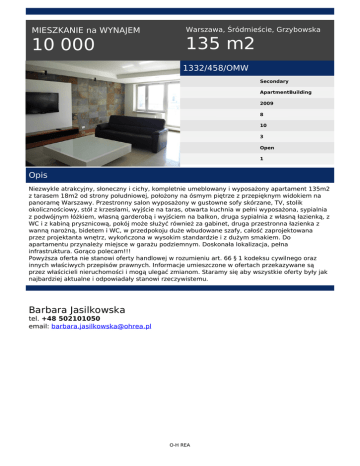 MIESZKANIE na WYNAJEM 10 000 Warszawa, Śródmieście, Grzybowska 135 m2 1332/458/OMW Secondary ApartmentBuilding 2009 8 10 3 Open 1 Opis Niezwykle atrakcyjny, słoneczny i cichy, kompletnie umeblowany i wyposażony apartament 135m2 z tarasem 18m2 od strony południowej, położony na ósmym piętrze z przepięknym widokiem na panoramę Warszawy. Przestronny salon wyposażony w gustowne sofy skórzane, TV, stolik okolicznościowy, stół z krzesłami, wyjście na taras, otwarta kuchnia w pełni wyposażona, sypialnia z podwójnym łóżkiem, własną garderobą i wyjściem na balkon, druga sypialnia z własną łazienką, z WC i z kabiną prysznicową, pokój może służyć również za gabinet, druga przestronna łazienka z wanną narożną, bidetem i WC, w przedpokoju duże wbudowane szafy, całość zaprojektowana przez projektanta wnętrz, wykończona w wysokim standardzie i z dużym smakiem. Do apartamentu przynależy miejsce w garażu podziemnym. Doskonała lokalizacja, pełna infrastruktura. Gorąco polecam!!! Powyższa oferta nie stanowi oferty handlowej w rozumieniu art. 66 § 1 kodeksu cywilnego oraz innych właściwych przepisów prawnych. Informacje umieszczone w ofertach przekazywane są przez właścicieli nieruchomości i mogą ulegać zmianom. Staramy się aby wszystkie oferty były jak najbardziej aktualne i odpowiadały stanowi rzeczywistemu. Barbara Jasilkowska tel. +48 502101050 email: [email protected] O-H REA Powered by TCPDF (www.tcpdf.org)
