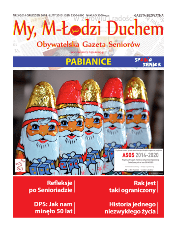 NR 3/2014 GRUDZIEŃ 2014 - LUTY 2015 ISSN 2300-6390 NAKŁAD 3000 egz. Pabianice My, M-Łodzi Duchem GAZETA BEZPŁATNA! 1 www.seniorzy-hipokamp.pl PABIANICE Wydanie naszej gazety możliwe jest dzięki wsparciu projektu Rządowy Program na rzecz Aktywności Społecznej Osób Starszych na lata 2014-2020 Ministerstwo Pracy i Polityki Społecznej „M-Łodzi Duchem - Gazeta Lokalna” foto: pixabay.com, condesign Refleksje po Senioriadzie Rak jest taki ograniczony DPS: Jak nam minęło 50 lat Historia jednego niezwykłego życia 2 My, M-Łodzi Duchem Pabianice Kochani, Po raz trzeci mam ogromną przyjemność przekazać Wam gazetę senioralną „My, M-Łodzi Duchem. Pabianice”. Cieszy mnie, ze coraz chętniej bierzecie udział w naszym wspólnym przedsięwzięciu. To od Państwa zależy, jakie treści znajdują się w piśmie. Cieszymy się ogromnie, iż do naszej ekipy dołączyli pensjonariusze Domu Pomocy Społecznej w Pabianicach. Pojawił się też temat hospicyjny, na łamach kwartalnika sporo historycznych opowieści i Wasze spostrzeżenia na różne tematy. Mam nadzieję, że kwartalnik „My, M-Łodzi Duchem .Pabianice” będzie chętnie czytany przez Was pod choinką, a artykuły staną się tematem świątecznych rozmów. Życzę, aby nadchodzące święta minęły spokojnie, zdrowo, pogodnie. Życzę, aby Nowy Rok 2015 okazał się pozytywny, piękny, twórczy Grażyna Busse, redaktor naczelna Rada numeru Ostrożnie z zimą Ujemne temperatury w połączeniu z wiejącym wiatrem i wilgotnym powietrzem sprzyjają powstawaniu odmrożeń. Jeśli już do niego dojdzie, pamiętajcie, aby powoli i stopniowo ogrzać tę część ciała (potrzyjcie tkaniną, skropcie ciepłą wodą). Nie może być to gwałtowne działanie. Na odmrożenia zakładamy tylko jałowe opatrunki. Ból i pieczenie to oznaka powrotu czucia. Cytat numeru „Po czterdziestce zaczyna się starość młodych, a po pięćdziesiątce młodość starych” Victor Marie Hugo Nasze smutki i radości - Czy potrzebna nam Rada Seniorów? Moim zdaniem tak, sama bym trochę działała w tej radzie. Przede wszystkim trzeba ustalić, kim jest „senior”, bo nie może to być 50-latek. Według medycyny senior to starzec, a starość to po ukończeniu 60 lat. Jeżeli przepisy pozwalają na coś takiego, to powinno to zaistnieć! Treść statutu Rady Seniorów powinna zależeć od starców, a nie od młodej Rady Miejskiej… - Lubię zimę, a szczególnie mróz, który maluje na szybach piękne wzory… - Łódzcy seniorzy są według mnie w lepszej sytuacji – tam jest więcej organizacji i stowarzyszeń zajmujących się „senioralnymi sprawami”. Większe i przede wszystkim bogatsze miasto ma większe możliwości… - Ubolewam, że teraz większość ludzi korzysta z internetowej prasy. Kultura czytania gazet powoli zamiera… - I od nowego roku znowu podwyżka emerytury o jakieś marne grosze… - Nie mogę się doczekać, kiedy moja wnusia otworzy prezent „od Mikołaja”. W tym roku pod choinkę zafundowałem jej wymarzoną zabawkę… - Kiedy na rozkładach jazdy autobusów wreszcie pojawi się większa czcionka? To przejaw ignorancji wobec seniorów… - Koledzy i Koleżanki - uważajcie na siebie w zimę. Na oblodzonym chodniku łatwo o wywrotkę i kontuzja gotowa… - Jestem bardzo zadowolona ze swoich kozaków, które kupiłam na rynku. Dużo chodzę, buty były wystawiane na różne próby, a one ani śladu użytkowania... - Już po raz drugi przełożono moją wizytę u lekarza. Najpierw poszedł na urlop, potem zachorował… Senior - ważny głos W Pabianicach powstanie Rada Seniorów - będzie mieć charakter konsultacyjny, doradczy i inicjatywny. Chodzi o wspieranie samorządu, solidarność międzypokoleniową oraz pobudzanie aktywności obywatelskiej. W tej sprawie przeprowadzono konsultacje społeczne z udziałem środowisk reprezentujących, zrzeszających i działających na rzecz osób starszych. Konsultacje miały formę warsztatów, na których wypracowano ramy działania i zasady funkcjonowania rady seniorów. Łącznie wzięło w nich udział 19 przedstawicieli środowiska - wszyscy poparli pomysł. Rada będzie się składać z 11 osób w wieku 60+. Siedmiu członków (zgłoszą je organizacje pozarządowe) wyłonią wybory bezpośrednie, tajne, które odbędą się na spotkaniu otwartym zwołanym przez prezydenta miasta (udział w głosowaniu mogą brać osoby powyżej 60. roku życia). Informacje o terminach zgłaszania kandydatur pojawią się na tablicy ogłoszeń w urzędzie oraz stronie internetowej. Po dwóch członków wskażą radni oraz prezydent. Do zadań rady będzie należeć m.in. współpraca z organami miasta przy rozstrzyganiu istotnych spraw dotyczących seniorów, przedstawianie propozycji działań, zgłaszanie uwag i wydawanie opinii. jum. Wydanie naszej gazety możliwe jest dzięki wsparciu projektu Rządowy Program na rzecz Aktywności Społecznej Osób Starszych na lata 2014-2020 Ministerstwo Pracy i Polityki Społecznej „M-Łodzi Duchem - Gazeta Lokalna” KWARTALNIK „MY, M-ŁODZI DUCHEM - REDAKCJA: Red. Naczelna: Grażyna Busse, Wydawca: Stowarzyszenie ECIM: „HIPOKAMP”, Zespół Redakcyjny: członkowie Klubu Seniorów „My-M-Łodzi Duchem” przy ECIM „HIPOKAMP”. Adres i kontakt: ECIM „HIPOKAMP”, ul. Brużyca nr 100/102 Aleksandrów Łódzki, [email protected], www.seniorzy-hipokamp.pl, tel. kom. 601 25 43 71, 42 640 15 94, skład: GRAFIGA, Pabianice, ul. Zamkowa 30, druk: POLSKAPRESSE Sp. z o.o. Oddział Poligrafia Drukarnia Łódź, ul. ks. Skorupki 17/19. 3 Pabianice My, M-Łodzi Duchem Nasze Święto Jak co roku, gdy nadchodzi jesienna pora, świętujemy Dzień Seniora. Obchodzony jest w kilku wariantach, na poziomie globalnym i lokalnym: 1 października jako Międzynarodowy Dzień Osób Starszych, 14 listopada jako Ogólnopolski Dzień Seniora i 20 października jako Europejski Dzień Seniora. Wszystkie te daty mają jednak wspólny cel - aktywiz