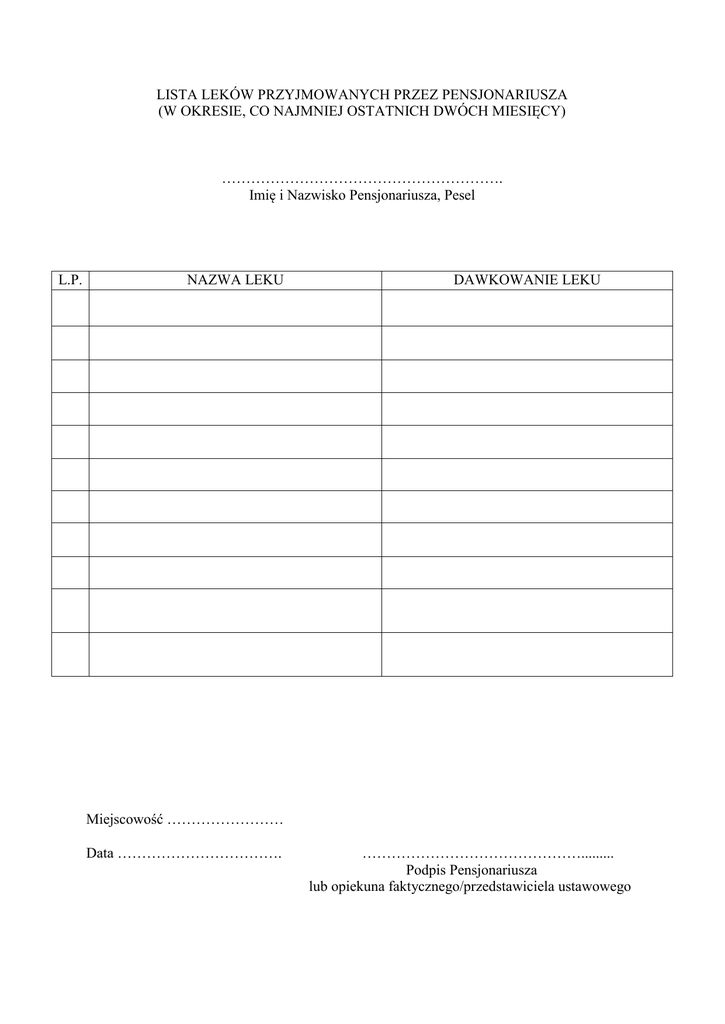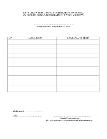 LISTA LEKÓW PRZYJMOWANYCH PRZEZ PENSJONARIUSZA (W OKRESIE, CO NAJMNIEJ OSTATNICH DWÓCH MIESIĘCY) …………………………………………………. Imię i Nazwisko Pensjonariusza, Pesel L.P. NAZWA LEKU DAWKOWANIE LEKU Miejscowość …………………… Data ……………………………. ………………………………………......... Podpis Pensjonariusza lub opiekuna faktycznego/przedstawiciela ustawowego