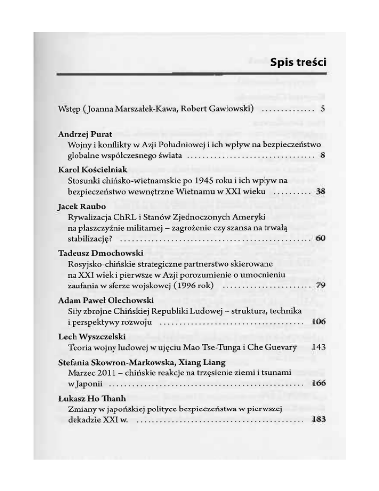 Spis treści Wstęp (Joanna Marszałek-Kawa, Robert Gawłowski) 5 Andrzej Purat Wojny i konflikty w Azji Południowej i ich wpływ na bezpieczeństwo globalne współczesnego świata 8 Karol Kościelniak Stosunki chińsko-wietnamskie po 1945 roku i ich wpływ na bezpieczeństwo wewnętrzne Wietnamu w XXI wieku 38 Jacek Raubo Rywalizacja ChRL i Stanów Zjednoczonych Ameryki na płaszczyźnie militarnej - zagrożenie czy szansa na trwałą stabilizację? 60 Tadeusz Dmochowski Rosyjsko-chińskie strategiczne partnerstwo skierowane na XXI wiek i pierwsze w Azji porozumienie o umocnieniu zaufania w sferze wojskowej (1996 rok) 79 Adam Paweł Olechowski Siły zbrojne Chińskiej Republiki Ludowej - struktura, technika i perspektywy rozwoju 106 Lech Wyszczelski Teoria wojny ludowej w ujęciu Mao Tse-Tunga i Che Guevary 143 Stefania Skowron-Markowska, Xiang Liang Marzec 2011 - chińskie reakcje na trzęsienie ziemi i tsunami wjaponii 166 Łukasz Ho Ihanh Zmiany w japońskiej polityce bezpieczeństwa w pierwszej dekadzie XXI w. 183 4 Spis treści Krzysztof Karolczak System zarządzania kryzysowego w Japonii (zarys problematyki) 211 Krzysztof Chmielewski Determinanty polityki bezpieczeństwa Malezji 229 Piotr Kwiatkiewicz Azerbejdżan-Iran - relacje dwustronne w okresie zbrojnej fazy konfliktu o Górski Karabach 240 Franciszek Czech Geneza i rozwój muzułmańskiego ruchu separatystycznego na południu Filipin 260 Małgorzata Klimczak Naruszenia praw człowieka popełniane przez indyjskie służby bezpieczeństwa w okresie konfliktu w Pendżabie wiatach 1978-1995 284 Małgorzata Klimczak Naruszenia praw człowieka dokonywane przez członków sikhijskich organizacji separatystycznych 321 Łukasz Stach Rozwój zbrojeń morskich na Dalekim Wschodzie na początku XXI stulecia. Implikacje dla sytuacji militarnej i politycznej regionu 335 Łukasz Wyszyński Marynarka Wojenna Chińskiej Republiki Ludowej w XXI w. ocena potencjału i znaczenie dla wzrostu mocarstwowej pozycji Chin 372 Grzegorz Piwnicki, Jerzy Bojko Wielki Mur na morzu i niebieskie wody Przemiany w strategii morskiej ChRL 393 Ksenia Kakareko Bezpieczeństwo energetyczne Kazachstanu 426