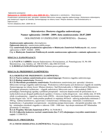 Ogłoszenie powiązane: Ogłoszenie nr 162666-2009 z dnia 2009-05-22 r. Ogłoszenie o zamówieniu - Skierniewice Przedmiotem zamówienia jest: sprzedaŜ i dostawa fabrycznie nowego ciągnika sadowniczego. Wykonawca zobowiązany jest dostarczyć ciągnik do siedziby Zamawiającego na własny koszt. Miejsce dostawy: Sad Doświadczalny w Dąbrowicach... Termin składania ofert: 2009-06-16 Skierniewice: Dostawa ciągnika sadowniczego umer ogłoszenia: 244480 - 2009; data zamieszczenia: 20.07.2009 OGŁOSZENIE O UDZIELENIU ZAMÓWIENIA - Dostawy Zamieszczanie ogłoszenia: obowiązkowe. Ogłoszenie dotyczy: zamówienia publicznego. Czy zamówienie było przedmiotem ogłoszenia w Biuletynie Zamówień Publicznych: tak, numer ogłoszenia w BZP: 162666 - 2009r. Czy w Biuletynie Zamówień Publicznych zostało zamieszczone ogłoszenie o zmianie ogłoszenia: nie. SEKCJA I: ZAMAWIAJĄCY I. 1) AZWA I ADRES: Instytut Sadownictwa i Kwiaciarstwa, ul. Pomologiczna 18, 96-100 Skierniewice, woj. łódzkie, tel. 046 8332021, faks 046 8333228. I. 2) RODZAJ ZAMAWIAJĄCEGO: Podmiot prawa publicznego. SEKCJA II: PRZEDMIOT ZAMÓWIEIA II.1) OKREŚLEIE PRZEDMOTU ZAMÓWIEIA II.1.1) azwa nadana zamówieniu przez zamawiającego: Dostawa ciągnika sadowniczego. II.1.2) Rodzaj zamówienia: Dostawy. II.1.3) Określenie przedmiotu zamówienia: Przedmiotem zamówienia jest: sprzedaż i dostawa fabrycznie nowego ciągnika sadowniczego. Wykonawca zobowiązany jest dostarczyć ciągnik do siedziby Zamawiającego na własny koszt. Miejsce dostawy: Sad Doświadczalny w Dąbrowicach k/Skierniewic. Wymagane parametry techniczne: - ciągnik sadowniczy fabrycznie nowy - rok produkcji 2009 r. posiadający homologację zgodną z polskimi przepisami - maszyna dopuszczona do poruszania się w ruchu kołowym po drogach publicznych zgodnie z Ustawą o ruchu drogowym - moc silnika min. 65 KM, silnik wysokoprężny - napęd na cztery koła (4WD), - skrzynia biegów mechaniczna, zsynchronizowana, liczba biegów min. 16/10 - maksymalna prędkość co najmniej 40 km/h - udźwig podnośnika minimum 2 500 kg - kabina komfortowa, ogrzewana i wentylowana z klimatyzacją - minimum 2 rozdzielacze hydrauliczne z 4 gniazdami zewnętrznymi - niezależna pompa kierowania - obciążniki przednie min. 150 kg - minimalna szerokość ciągnika w zakresie 1200 - 1400 mm - kąt skrętu minimum 60º Minimalna gwarancja 12 miesięcy. II.1.4) Wspólny Słownik Zamówień (CPV): 16.70.00.00-2. II.1.5) Całkowita końcowa wartość zamówienia (bez VAT) obejmująca wszystkie zamówienia i części: 113500 PLN. SEKCJA IV: PROCEDURA IV.1) TRYB UDZIELEIA ZAMÓWIEIA: Przetarg nieograniczony 1 IV.2) IFORMACJE ADMIISTRACYJE Zamówienie dotyczy projektu/programu finansowanego ze środków Unii Europejskiej: tak, projekt/program: Zamówienie dotyczy projektu badawczego pt. Opracowanie innowacyjnych produktów i technologii dla ekologicznej uprawy roślin sadowniczych, nr umowy UDAPOIG.01.03.01-00-109/08-00, współfinansowanego przez UNIĘ EUROPEJSKĄ ze środków Europejskiego Funduszu Rozwoju Regionalnego w ramach Działania 1.3. Programu Operacyjnego Innowacyjna Gospodarka, Poddziałanie 1.3.1. SEKCJA V: UDZIELEIE ZAMÓWIEIA V.1) DATA UDZIELEIA ZAMÓWIEIA: 02.07.2009. V.2) LICZBA OTRZYMAYCH OFERT: 5. V.3) AZWA I ADRES WYKOAWCY, KTÓREMU UDZIELOO ZAMÓWIEIA: PH AGROSKŁAD Sp. Jawna Wł. Jabłoński, J. Kaczuba, Józefin 39, 97-225 Ujazd, kraj/woj. łódzkie. V.4) IFORMACJA O CEIE WYBRAEJ OFERTY ORAZ O IE PODLEGAJĄCYCH ODRZUCEIU OFERTACH Z AJIŻSZĄ I AJWYŻSZĄ CEĄ (bez VAT) Cena wybranej oferty: 113500 Oferta z najniższą ceną: 109500 oferta z najwyższą ceną: 119000 Waluta: PLN. 2