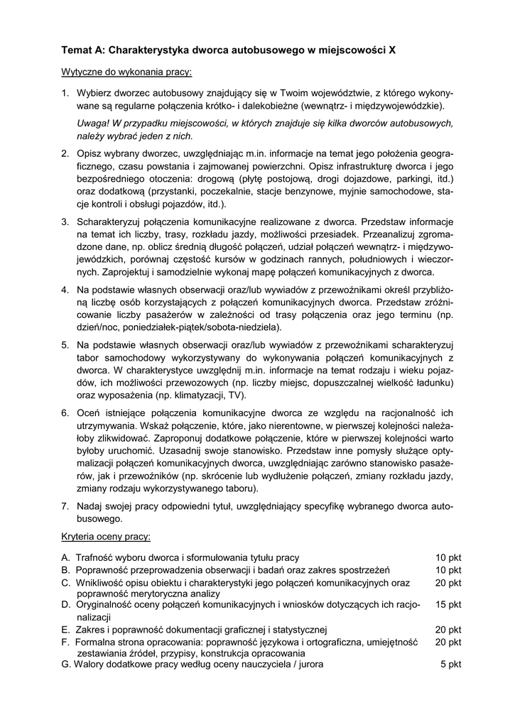 Temat A: Charakterystyka dworca autobusowego w miejscowości X Wytyczne do wykonania pracy: 1. Wybierz dworzec autobusowy znajdujący się w Twoim województwie, z którego wykonywane są regularne połączenia krótko- i dalekobieżne (wewnątrz- i międzywojewódzkie). Uwaga! W przypadku miejscowości, w których znajduje się kilka dworców autobusowych, należy wybrać jeden z nich. 2. Opisz wybrany dworzec, uwzględniając m.in. informacje na temat jego położenia geograficznego, czasu powstania i zajmowanej powierzchni. Opisz infrastrukturę dworca i jego bezpośredniego otoczenia: drogową (płytę postojową, drogi dojazdowe, parkingi, itd.) oraz dodatkową (przystanki, poczekalnie, stacje benzynowe, myjnie samochodowe, stacje kontroli i obsługi pojazdów, itd.). 3. Scharakteryzuj połączenia komunikacyjne realizowane z dworca. Przedstaw informacje na temat ich liczby, trasy, rozkładu jazdy, możliwości przesiadek. Przeanalizuj zgromadzone dane, np. oblicz średnią długość połączeń, udział połączeń wewnątrz- i międzywojewódzkich, porównaj częstość kursów w godzinach rannych, południowych i wieczornych. Zaprojektuj i samodzielnie wykonaj mapę połączeń komunikacyjnych z dworca. 4. Na podstawie własnych obserwacji oraz/lub wywiadów z przewoźnikami określ przybliżoną liczbę osób korzystających z połączeń komunikacyjnych dworca. Przedstaw zróżnicowanie liczby pasażerów w zależności od trasy połączenia oraz jego terminu (np. dzień/noc, poniedziałek-piątek/sobota-niedziela). 5. Na podstawie własnych obserwacji oraz/lub wywiadów z przewoźnikami scharakteryzuj tabor samochodowy wykorzystywany do wykonywania połączeń komunikacyjnych z dworca. W charakterystyce uwzględnij m.in. informacje na temat rodzaju i wieku pojazdów, ich możliwości przewozowych (np. liczby miejsc, dopuszczalnej wielkość ładunku) oraz wyposażenia (np. klimatyzacji, TV). 6. Oceń istniejące połączenia komunikacyjne dworca ze względu na racjonalność ich utrzymywania. Wskaż połączenie, które, jako nierentowne, w pierwszej kolejności należałoby zlikwidować. Zaproponuj dodatkowe połączenie, które w pierwszej kolejności warto byłoby uruchomić. Uzasadnij swoje stanowisko. Przedstaw inne pomysły służące optymalizacji połączeń komunikacyjnych dworca, uwzględniając zarówno stanowisko pasażerów, jak i przewoźników (np. skrócenie lub wydłużenie połączeń, zmiany rozkładu jazdy, zmiany rodzaju wykorzystywanego taboru). 7. Nadaj swojej pracy odpowiedni tytuł, uwzględniający specyfikę wybranego dworca autobusowego. Kryteria oceny pracy: A. Trafność wyboru dworca i sformułowania tytułu pracy B. Poprawność przeprowadzenia obserwacji i badań oraz zakres spostrzeżeń C. Wnikliwość opisu obiektu i charakterystyki jego połączeń komunikacyjnych oraz poprawność merytoryczna analizy D. Oryginalność oceny połączeń komunikacyjnych i wniosków dotyczących ich racjonalizacji E. Zakres i poprawność dokumentacji graficznej i statystycznej F. Formalna strona opracowania: poprawność językowa i ortograficzna, umiejętność zestawiania źródeł, przypisy, konstrukcja opracowania G. Walory dodatkowe pracy według oceny nauczyciela / jurora 10 pkt 10 pkt 20 pkt 15 pkt 20 pkt 20 pkt 5 pkt