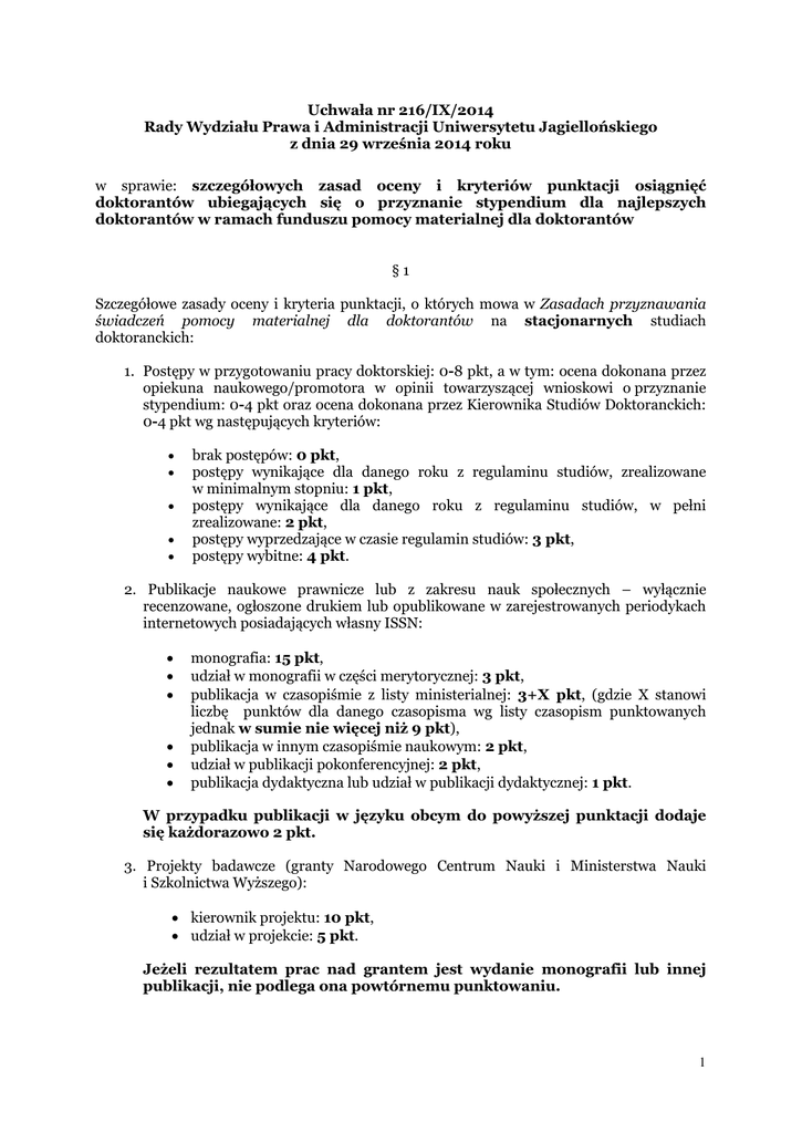 Uchwała nr 216/IX/2014 Rady Wydziału Prawa i Administracji Uniwersytetu Jagiellońskiego z dnia 29 września 2014 roku w sprawie: szczegółowych zasad oceny i kryteriów punktacji osiągnięć doktorantów ubiegających się o przyznanie stypendium dla najlepszych doktorantów w ramach funduszu pomocy materialnej dla doktorantów §1 Szczegółowe zasady oceny i kryteria punktacji, o których mowa w Zasadach przyznawania świadczeń pomocy materialnej dla doktorantów na stacjonarnych studiach doktoranckich: 1. Postępy w przygotowaniu pracy doktorskiej: 0-8 pkt, a w tym: ocena dokonana przez opiekuna naukowego/promotora w opinii towarzyszącej wnioskowi o przyznanie stypendium: 0-4 pkt oraz ocena dokonana przez Kierownika Studiów Doktoranckich: 0-4 pkt wg następujących kryteriów: • • • • • brak postępów: 0 pkt, postępy wynikające dla danego roku z regulaminu studiów, zrealizowane w minimalnym stopniu: 1 pkt, postępy wynikające dla danego roku z regulaminu studiów, w pełni zrealizowane: 2 pkt, postępy wyprzedzające w czasie regulamin studiów: 3 pkt, postępy wybitne: 4 pkt. 2. Publikacje naukowe prawnicze lub z zakresu nauk społecznych – wyłącznie recenzowane, ogłoszone drukiem lub opublikowane w zarejestrowanych periodykach internetowych posiadających własny ISSN: • • • • • • monografia: 15 pkt, udział w monografii w części merytorycznej: 3 pkt, publikacja w czasopiśmie z listy ministerialnej: 3+X pkt, (gdzie X stanowi liczbę punktów dla danego czasopisma wg listy czasopism punktowanych jednak w sumie nie więcej niż 9 pkt), publikacja w innym czasopiśmie naukowym: 2 pkt, udział w publikacji pokonferencyjnej: 2 pkt, publikacja dydaktyczna lub udział w publikacji dydaktycznej: 1 pkt. W przypadku publikacji w języku obcym do powyższej punktacji dodaje się każdorazowo 2 pkt. 3. Projekty badawcze (granty Narodowego Centrum Nauki i Ministerstwa Nauki i Szkolnictwa Wyższego): • kierownik projektu: 10 pkt, • udział w projekcie: 5 pkt. Jeżeli rezultatem prac nad grantem jest wydanie monografii lub innej publikacji, nie podlega ona powtórnemu punktowaniu. 1 4. Konferencje prawnicze lub z zakresu nauk społecznych: • czynny udział w krajowej konferencji naukowej z referatem, poświadczony certyfikatem: 0,5 pkt, • czynny udział w zagranicznej konferencji naukowej z referatem, poświadczony certyfikatem: 1 pkt. Punktowany jest udział w 6 konferencjach rocznie. 5. Odbywanie praktyk dydaktycznych w formie prowadzenia zajęć, wykraczające poza wymagania regulaminowe: • za każde 30 godz. zajęć dydaktycznych powyżej limitu regulaminowego: 2 pkt (w sumie nie więcej niż 6 pkt). 6. Odbywanie praktyk dydaktycznych w formie uczestniczenia w prowadzeniu zajęć, wykraczające poza wymagania regulaminowe, z zastrzeżeniem § 3 pkt. 2: • za każde 30 godz. zajęć dydaktycznych powyżej limitu regulaminowego: 1 pkt (w sumie nie więcej niż 3 pkt). 7. Oceny za każdy z egzaminów uzyskane w danym roku studiów: • bdb: 4 pkt, • plus db: 2 pkt, • db: 1 pkt. §2 Szczegółowe zasady oceny i kryteria punktacji, o których mowa w Zasadach przyznawania świadczeń pomocy materialnej dla doktorantów na niestacjonarnych studiach doktoranckich: 1. Postępy w przygotowaniu pracy doktorskiej: 0-8 pkt, a w tym: ocena dokonana przez opiekuna naukowego/promotora w opinii towarzyszącej wnioskowi o przyznanie stypendium: 0-4 pkt oraz ocena dokonana przez Kierownika Studiów Doktoranckich: 0-4 pkt wg następujących kryteriów: • • • • • brak postępów: 0 pkt, postępy wynikające dla danego roku z regulaminu studiów, zrealizowane w minimalnym stopniu: 1 pkt, postępy wynikające dla danego roku z regulaminu studiów, w pełni zrealizowane: 2 pkt, postępy wyprzedzające w czasie regulamin studiów: 3 pkt, postępy wybitne: 4 pkt. 2. Publikacje naukowe prawnicze lub z zakresu nauk społecznych – wyłącznie recenzowane, ogłoszone drukiem lub opublikowane w zarejestrowanych periodykach internetowych posiadających własny ISSN: • • • monografia: 15 pkt, udział w monografii w części merytorycznej: 3 pkt, publikacja w czasopiśmie z listy ministerialnej: 3+X pkt, (gdzie X stanowi liczbę punktów dla danego czasopisma wg listy czasopism punktowanych jednak w sumie nie więcej niż 9 pkt), 2 • • publikacja w innym czasopiśmie naukowym: 2 pkt, udział w publikacji pokonferencyjnej: 2 pkt, W przypadku publikacji w języku obcym do powyższej punktacji dodaje się każdorazowo 2 pkt. 3. Projekty badawcze (granty Narodowego Centrum Nauki i Ministerstwa Nauki i Szkolnictwa Wyższego): • kierownik projektu: 10 pkt, • udział w projekcie: 5 pkt. Jeżeli rezultatem prac nad grantem jest wydanie monografii lub innej publikacji, nie podlega ona powtórnemu punktowaniu. 4. Konferencje prawnicze lub z zakresu nauk społecznych: • czynny udział w krajowej konferencji naukowej z referatem, poświadczony certyfikatem: 0,5 pkt, • czynny udział w zagranicznej konferencji naukowej z referatem, poświadczony certyfikatem: 1 pkt. Punktowany jest udział w 6 konferencjach rocznie. 5. Oceny za każdy z egzaminów uzyskane w danym roku studiów: • bdb: 4 pkt, • plus db: 2 pkt, • db: 1 pkt. §3 1. Uchwała wchodzi w życie z dniem uchwalenia. 2. § 1 pkt. 6 uchwały obowiązuje do końca roku akademickiego 2013/2014. 3