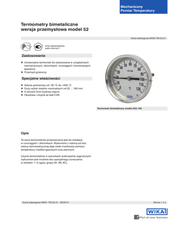 Mechaniczny Pomiar Temperatury Termometry bimetaliczne wersja przemysłowa model 52 Karta katalogowa WIKA TM 52.01 inne zatwierdzenia patrz strona 5 Zastosowanie Uniwersalny termometr do zastoswania w urządzeniach mechanicznych, zbiornikach, rurociągach i konstrukcjach aparatury Przemysł grzewczy Specjalne właściwości Zakres pomiarowy od -30 °C do +500 °C Duży wybór średnic nominalnych od 25 ... 160 mm 5 różnych form budowy złącza Obudowa i czujnik ze stali CrNi Termometr bimetaliczny model A52.100 Opis Ta seria termometrów przeznaczona jest do instalacji w rurociągach i zbiornikach. Wykonanie z osłoną lub bez osłony termometrycznej daje wiele możliwości pomiaru temperatury mediów gazowych oraz płynnych. Użycie termometrów w warunkach potencjalnie zagrożonych wybuchem jest możliwe bez specjalnego oznaczenia w strefach 1 i 2 (gazy, grupy IIA, IIB, IIC). Karta katalogowa WIKA TM 52.01 · 09/2013 Strona 1 z 5 Cechy standardowe Obudowa, pokrywa, długość zanurzeniowa, przyłącze procesowe i szyjka dystansowa Stal CrNi Element pomiarowy Spirala bimetaliczna Rozmiar nominalny 25, 33, 40, 50, 63, 80, 100, 160 Kolanko z tyłu obudowy Aluminium, tylko dla przyłącza dolnego Forma budowy złącza S standardowa (stałe przyłącze gwintowe) 1 czujnik gładki (bez gwintu) 2 złącze ruchome z gwintem zewnętrznym 3 złącze ruchome z gwintem wewnętrznym 4 złącze zaciskowe (przesuwne na czujniku) Podzielnia Białe aluminium, czarna skala Szyba Szkło przemysłowe NS 33 szyba pliwęglanowa 1) Nie dla NS 25, 33, 40, 50 Modele Model A52.025 A52.033 A52.040 A52.050 A52.063 A52.080 A52.100 A52.160 R52.063 R52.080 R52.100 R52.160 NS 25 33 40 50 63 80 100 160 63 80 100 160 Wskazówka NS 25, 33, 40: aluminium czarne NS 50, 63, 80, 100, 160: aluminium czarne, wskazówka nastawna Ciśnienie znamionowe czujnika NS 25, 33, 40, 50: max. 6 bar, statyczne NS 63, 80, 100, 160: max. 25 bar, statyczne Konstrukcja Montaż tylni (osiowy) Stopień ochrony obudowy NS 25, 33, 40: IP 54 (EN 60 529 / IEC 529) NS 50, 63, 80, 100, 160: IP 43 (EN 60 529 / IEC 529) Montaż dolny (osiowy) Klasa dokładności NS 25, 33 ±5 % zakresu pomiarowego NS 63, 80, 100, 160: 1 wg EN 13190 NS 40, 50: 2 wg EN 13190 Zakres pracy Stały: zakres pomiarowy (DIN EN 13 190) Krótki czas (max. 24 h): zakres wskazań (DIN EN 13 190) Opcjonalnie Zakres wskazań °F, °C/°F (skala podwójna) Inne zakresy wskazań Inne przyłącza procesowe Zakres wskazań i pomiarowy 1), granica błędu (DIN EN 13 190) Skalowanie wg norm WIKA Zakres wskazań w °C Zakres pomiarowy Podziałka skali w °C do NS 63 w °C od NS 80 w °C Granica błędu do NS 50 ± °C od NS 63 ± °C -30 ... +50 -20 ... +60 0 ... 60 0 ... 80 0 ... 100 0 ... 120 0 ... 160 0 ... 200 2) 0 ... 250 2) 0 ... 300 3) 0 ... 400 3) 0 ... 500 3) -20 ... +40 -10 ... +50 +10 ... +50 +10 ... +70 +10 ... +90 +10 ... +110 +20 ... +140 +20 ... +180 +30 ... +220 +30 ... +270 +50 ... +350 +50 ... +450 1 1 1 1 1 1 1 2 2 2 5 5 2 2 2 2 2 4 4 4 5 - - - 1 1 1 1 1 2 2 2 2,5 5 5 5 1 1 1 1 2 2 2 5 5 5 5 5 2) Zakres pomiarowy zaznaczony jest na podzielni przez dwa trójkątne znaki. Podany zakres błędu granicznego jest prawdziwy tylko w tym zakresie wg DIN EN 13 190. Strona 2 z 5 3) Nie dla NS 33 4) Nie dla NS 25 do NS 50 Karta katalogowa WIKA TM 52.01 · 09/2013 Wymiary w mm Średnica Przyłącze procesowe Wymiary w mm NS G i SW Ød 25, 33 M8 x 1,25 8 12 4 G 1/8 B 8 17 4 G 1/4 B 8 17 4 40, 50 M8 x 1,25 8 17 4 G 1/8 B 8 17 4 G 1/4 B 8 17 4 G 1/2 B 14 27 4 63, 80, 100, 160 G 1/4 B 8 17 6; 8 G 1/2 B 14 27 6; 8 M18 x 1,5 12 24 6; 8 1/2 NPT 19 22 6; 8 3073050.05 Forma złącza S, standardowa (przyłącze gwintowe, stałe) Standardowa dł. zanurzeniowa l1: 63, 100, 160, 200, 250 mm Legenda: G gwint zewnętrzny i długość gwintu Ø d4 średnica kołnierza uszczelającego SW pod klucz Ø d średnica czujnika l2 długość aktywna Średnica Wymiary w mm NSd6 Ød 25, 33 8 4 40, 50 12 4 63, 80, 100, 160 18 6; 8 3073050.05 Forma złącza 1, czujnik gładki (bez gwintu) Standardowa dł. zanurzeniowa l: 45, 63, 100, 140, 160, 200, 240, 290 mm Legenda: Ø d1 średnica szyjki Ø d średnica czujnika l2 długość aktywna Średnica Przyłącze procesowe Wymiary w mm NG G i SW Ød 63, 80, 100, 160 G 1/2 B 20 27 6; 8 M18 x 1,5 12 24 6; 8 3073050.05 Forma złącza 2, ruchoma z gwintem zew. Standardowa długości zanurzeniowa l1: 80, 140, 180, 230 mm Legenda: G gwint zewnętrzny i długość gwintu SW pod klucz Ø d średnica czujnika l2 długość aktywna Legenda: G gwint zewnętrzny i długość gwintu SW pod klucz Ø d średnica czujnika l2 długość aktywna Średnica Przyłącze procesowe Wymiary w mm NS G i SW Ød 63, 80, 100, 160 G 1/2 8,5 27 6; 8 G 3/4 10,5 32 6; 8 Karta katalogowa WIKA TM 52.01 · 09/2013 3073050.05 Forma złącza 3, ruchoma z gwintem wew. Stanadrdowa długości zanurzeniowa l1: 89, 126, 186, 226, 276 mm Strona 3 z 5 Średnica Przyłącze procesowe Wymiary w mm NG G i SW Ød 63, 80, 100, 160 G 1/4 B 8 17 6; 8 G 1/2 B 14 27 6; 8 M18 x 1,5 12 24 6; 8 1/2 NPT 19 22 6; 8 G 3/4 B 14 27 6; 8 3/4 NPT 20 30 6; 8 3073050.05 Forma złącza 4, zaciskowe (przesuwne na czujniku) Długość zanurzeniowa l1 = różna Długość L = l1 + 40 mm uszczelka Legenda: G gwint zewnętrzny i długość gwintu Ø d4 średnica kołnierza uszczelającego SW pod klucz Ø d średnica czujnika l2 długość aktywna Wymiary w mm NS Wymiary w mm b1b2b3 b4 b5 Ø D F 25 12/16 - - - 2/6 25 - 33 12/16 - - - 2/6 33 - 40 21 - - - 8 40 - 50 21 - - - 8 50 - 6329 30 1) 46 34 13 63 47 8030 30 1) 47 36 13 80 56 10035 30 1) 52 40 13 100 66 16039 30 1) 57 42,5 13 160 96 1) Od 300 °C lub na zapytanie Strona 4 z 5 Położenie czujnika, dolne 3190307.01 3073009.01 Położenie czujnika, tylne z szyjką dystansową (od 300 °C lub na zapytanie) 3072991.01 Położenie czujnika, tylne (do 250 °C) Waga w kg R RD U 0,035 0,040 0,050 0,060 0,160 0,200 0,250 0,450 0,220 0,270 0,330 0,560 - - - - 0,200 0,240 0,290 0,490 R Prz