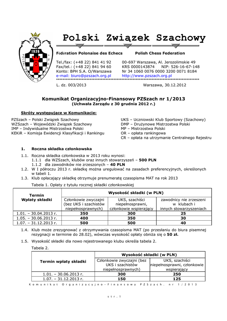 Polski Związek Szachowy Fédération Polonaise des Echecs Tel./fax: (+48 22) 841 41 92 Fax/tel.: (+48 22) 841 94 60 Konto: BPH S.A. O/Warszawa e-mail: [email protected] Polish Chess Federation 00-697 Warszawa, Al. Jerozolimskie 49 KRS 0000143874 NIP: 526-16-67-148 Nr 34 1060 0076 0000 3200 0071 8184 http://www.pzszach.org.pl ****************************************************************************************** L. dz. 003/2013 Warszawa, 30.12.2012 Komunikat Organizacyjno-Finansowy PZSzach nr 1/2013 (Uchwała Zarządu z 30 grudnia 2012 r.) Skróty występujące w Komunikacie: PZSzach – Polski Związek Szachowy WZSzach – Wojewódzki Związek Szachowy IMP – Indywidualne Mistrzostwa Polski KEKiR – Komisja Ewidencji Klasyfikacji i Rankingu 1. UKS – Uczniowski Klub Sportowy (Szachowy) DMP – Drużynowe Mistrzostwa Polski MP – Mistrzostwa Polski OR – opłata rankingowa CR – opłata na utrzymanie Centralnego Rejestru Roczna składka członkowska 1.1. Roczna składka członkowska w 2013 roku wynosi: 1.1.1 dla WZSzach, klubów oraz innych stowarzyszeń – 500 PLN 1.1.2 dla zawodników nie zrzeszonych – 40 PLN 1.2. W I półroczu 2013 r. składkę można uregulować na zasadach preferencyjnych, określonych w tabeli 1. 1.3. Klub opłacający składkę otrzymuje prenumeratę czasopisma MAT na rok 2013 Tabela 1. Opłaty z tytułu rocznej składki członkowskiej Termin Wpłaty składki 1.01. – 30.04.2013 r. 1.05. – 30.06.2013 r. 1.07. – 31.12.2013 r. Wysokość składki (w PLN) Członkowie zwyczajni (bez UKS i szachistów niepełnosprawnych) 350 400 500 UKS, szachiści niepełnosprawni, członkowie wspierający 300 350 500 zawodnicy nie zrzeszeni w klubach i innych stowarzyszeniach 25 30 40 1.4. Klub może zrezygnować z otrzymywania czasopisma MAT (po przesłaniu do biura pisemnej rezygnacji w terminie do 28.02), wówczas wysokość opłaty obniża się o 50 zł. 1.5. Wysokość składki dla nowo rejestrowanego klubu określa tabela 2. Tabela 2. Wysokość składki (w PLN) Termin wpłaty składki 1.01. – 30.06.2013 r. 1.07. – 31.12.2013 r. K o m u n i k a t Członkowie zwyczajni (bez UKS i szachistów niepełnosprawnych) 300 150 O r g a n i z a c y j n o - F i n a n s o w y s t r . 1 UKS, szachiści niepełnosprawni, członkowie wspierający 250 125 P Z S z a c h . n r 1 / 2 0 1 3 Składkę roczną oraz opłatę licencyjną i rejestracyjną (odpowiednio pkt. 2.3. i 14.1 niniejszego komunikatu) należy uregulować przed wysłaniem do PZSzach deklaracji zgłoszenia klubu – kserokopię dowodu wpłaty przesłać jako załącznik do deklaracji. 1.6. WZSzach, który w 2012 roku terminowo i prawidłowo rozliczał się z PZSzach, może wnioskować do Zarządu PZSzach w terminie do 15.01.2013 r. o uprawnienie go do pobierania opłat wynikających z postanowień niniejszego komunikatu. Ułatwi to klubom regulowanie ich zobowiązań. W umowie, uprawniającej do takiego działania, PZSzach określi tryb i terminy wzajemnych rozliczeń między oboma związkami. 2. Opłaty licencyjne 2.1. Szczegóły dotyczące wydawania licencji zawarte są w Regulaminie Licencyjnym Polskiego Związku Szachowego z dnia 21 grudnia 2012 r., opublikowanym na stronie internetowej PZSzach. 2.2. Opłata za wydanie licencji wynosi 30 PLN. 2.3. Osoby posiadające godność Członka Honorowego PZSzach są zwolnieni z opłaty licencyjnej. 3. Opłaty rankingowe 3.1. Każdy zawodnik, także zagraniczny, biorący udział w turnieju podlegającym ocenie rankingowej FIDE lub stanowiącym podstawę do nadawania tytułów szachowych lub kategorii, począwszy od normy na I kategorię wzwyż oraz w turniejach z cyklu Mistrzostw Polski (ligi drużynowe wszystkich szczebli, MPJ oraz TPS, TOS i eliminacje międzywojewódzkie ) jest zobowiązany do opłacenia z tytułu uczestnictwa w tym turnieju opłaty rankingowej. Opłata ta jest stała bez względu na rangę turnieju oraz niezależna od opłaty startowej i organizacyjnej. 3.2. Opłata rankingowa w turniejach podlegających ocenie rankingowej FIDE wynosi: 20 PLN za zawodnika w turniejach minimum 8 rundowych, 15 PLN za zawodnika w turniejach 6 -7 rundowych, 10 PLN za zawodnika w turniejach 5 rundowych. 3.3. OR w turniejach nie klasyfikowanych w rankingu FIDE wynosi 10 PLN od zawodnika. 3.4. Opłatę rankingową zawodnik przekazuje do PZSzach za pośrednictwem organizatora turnieju i jest zobowiązany do jej wniesienia przed rozpoczęciem turnieju. 3.5. W przypadku rozgrywek drużynowych opłatę rankingową należy przekazać na konto PZSzach przed rozpoczęciem zawodów. Zobowiązanym do wniesienia OR w imieniu członków drużyny jest jej kapitan lub klub, przy czym kwota należna z tego tytułu jest sumą opłat za wszystkich zawodników zgłoszonych do rozgrywek. 3.6. Organizator turnieju w terminie 7 dni od dnia zakończenia turnieju ma obowiązek przekazać całość zebranych opłat rankingowych na konto PZSzach. Nie przekazanie przez organizatora powyższej kwoty lub nie przekazanie jej w całości skutkuje nie uwzględnieniem turnieju w systemie klasyfikacyjno- rankingowym. W takim przypadku wszelkie roszczenia zawodników, którzy wnieśli powyższe opłaty do organizatora, mogą być kierowane jedynie wobec niego. 3.7. Organizatorzy wszystkich turniejów podlegających ocenie rankingowej FIDE lub stanowiących podstawę do nadawania tytułów szachowych lub kategorii, począwszy od normy na I kategorię w turniejach z cyklu Mistrzostw Polski (ligi drużynowe wszystkich szczebli, MPJ oraz TPS, TOS i eliminacje międzywojewódzkie ) mają obowiązek określenia w komunikacie organizacyjnym czy OR są uwzględnione we wpisowym do danego turnieju, czy też będą pobierane niezależnie od wpisowego. 3.8. PZSzach przekazuje 25% kwoty uzyskanej z tytułu OR na konto WZSzach, wskazanego przez organizatora zawodów (nie dotyczy turniejów z cyklu mistrzostw Polski we wszystkich kategoriach wiekowych) – przy braku wskazania do WZSzach właściwego dla siedziby 