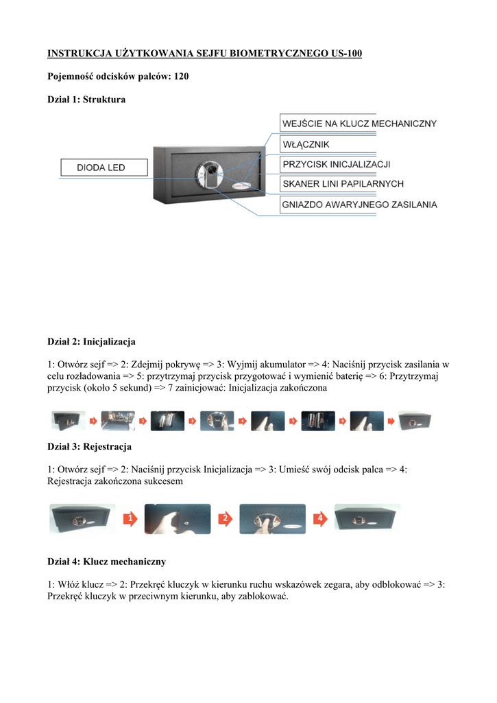 INSTRUKCJA UŻYTKOWANIA SEJFU BIOMETRYCZNEGO US-100 Pojemność odcisków palców: 120 Dział 1: Struktura Dział 2: Inicjalizacja 1: Otwórz sejf => 2: Zdejmij pokrywę => 3: Wyjmij akumulator => 4: Naciśnij przycisk zasilania w celu rozładowania => 5: przytrzymaj przycisk przygotować i wymienić baterię => 6: Przytrzymaj przycisk (około 5 sekund) => 7 zainicjować: Inicjalizacja zakończona Dział 3: Rejestracja 1: Otwórz sejf => 2: Naciśnij przycisk Inicjalizacja => 3: Umieść swój odcisk palca => 4: Rejestracja zakończona sukcesem Dział 4: Klucz mechaniczny 1: Włóż klucz => 2: Przekręć kluczyk w kierunku ruchu wskazówek zegara, aby odblokować => 3: Przekręć kluczyk w przeciwnym kierunku, aby zablokować. Dział 5: Zasilanie awaryjne Proszę używać baterii alkalicznej 9V, aby awaryjnie podłączyć gniazdo pod moduł. Dział 6: Blokowanie/Odblokowanie Aby zablokować: 1: Otwórz sejf => 2: zamknij sejf => 3: Naciśnij przycisk zasilania => 4:Sejf Zablokowany Aby odblokować: 1: Zamknij sejf => 2: Naciśnij przycisk zasilania => 3: Umieść swój odcisk palca => 4: Sejf Odblokowany Uwaga: zielone światło będzie migać, co 4 sekundy informując, że sejf został otwarty. Dział 7: Uwagi 1: Gdy podczas otwierania sejfu, usłyszymy sygnalizator dźwiękowy wraz z migającą czerwona diodą należy wymienić baterie(rozładowane baterie). Proszę używać tej samej marki baterii alkalicznych szt 4x 1.5V,. 2: Proszę o nie czyszczenia sejfu substancjami żrącymi, aby nie uszkodzić powierzchni ochronnej i połysku sejfu. W celu ochrony powierzchni sejfu, należy oczyścić je okresowo za pomocą suchej szmatki. 3. Proszę okresowo czyścić skaner linii papilarnych. 4. Należy umieścić sejf w odpowiednim miejscu i zamocować na ścianie lub podłodze. 5: Proszę nie zostawiać cennych rzeczy lub pieniędzy w sejfie , firma nie ponosi żadnej odpowiedzialności w przypadku kradzieży. LINK DO FILMU: http://www.youtube.com/watch?v=Nmu0BHv1cTg&list=UUOJkg3j1aw5qtVX4VEOi2fA WWW.USIMPORT.PL Zapraszam do kontaktu telefonicznego pod numerami: +48 791660160 +48 668 194 962 Skrzynaka pocztowa: Mail box: [email protected] [email protected]
