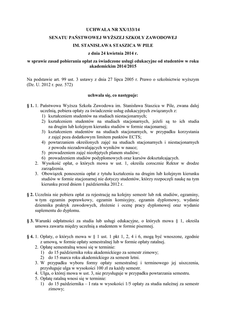 UCHWAŁA NR XX/133/14 SENATU PAŃSTWOWEJ WYŻSZEJ SZKOŁY ZAWODOWEJ IM. STANISŁAWA STASZICA W PILE z dnia 24 kwietnia 2014 r. w sprawie zasad pobierania opłat za świadczone usługi edukacyjne od studentów w roku akademickim 2014/2015 Na podstawie art. 99 ust. 3 ustawy z dnia 27 lipca 2005 r. Prawo o szkolnictwie wyższym (Dz. U. 2012 r. poz. 572) uchwala się, co następuje: § 1. 1. Państwowa Wyższa Szkoła Zawodowa im. Stanisława Staszica w Pile, zwana dalej uczelnią, pobiera opłaty za świadczenie usług edukacyjnych związanych z: 1) kształceniem studentów na studiach niestacjonarnych; 2) kształceniem studentów na studiach stacjonarnych, jeżeli są to ich studia na drugim lub kolejnym kierunku studiów w formie stacjonarnej; 3) kształceniem studentów na studiach stacjonarnych, w przypadku korzystania z zajęć poza dodatkowym limitem punktów ECTS; 4) powtarzaniem określonych zajęć na studiach stacjonarnych i niestacjonarnych z powodu niezadowalających wyników w nauce; 5) prowadzeniem zajęć nieobjętych planem studiów; 6) prowadzeniem studiów podyplomowych oraz kursów dokształcających. 2. Wysokość opłat, o których mowa w ust. 1, określa corocznie Rektor w drodze zarządzenia. 3. Obowiązek ponoszenia opłat z tytułu kształcenia na drugim lub kolejnym kierunku studiów w formie stacjonarnej nie dotyczy studentów, którzy rozpoczęli naukę na tym kierunku przed dniem 1 października 2012 r. § 2. Uczelnia nie pobiera opłat za rejestrację na kolejny semestr lub rok studiów, egzaminy, w tym egzamin poprawkowy, egzamin komisyjny, egzamin dyplomowy, wydanie dziennika praktyk zawodowych, złożenie i ocenę pracy dyplomowej oraz wydanie suplementu do dyplomu. § 3. Warunki odpłatności za studia lub usługi edukacyjne, o których mowa § 1, określa umowa zawarta między uczelnią a studentem w formie pisemnej. § 4. 1. Opłaty, o których mowa w § 1 ust. 1 pkt 1, 2, 4 i 6, mogą być wnoszone, zgodnie z umową, w formie opłaty semestralnej lub w formie opłaty ratalnej. 2. Opłatę semestralną wnosi się w terminie: 1) do 15 października roku akademickiego za semestr zimowy; 2) do 15 marca roku akademickiego za semestr letni. 3. W przypadku wyboru formy opłaty semestralnej i terminowego jej uiszczenia, przysługuje ulga w wysokości 100 zł za każdy semestr. 4. Ulga, o której mowa w ust. 3, nie przysługuje w przypadku powtarzania semestru. 5. Opłatę ratalną wnosi się w terminie: 1) do 15 października – I rata w wysokości 1/5 opłaty za studia należnej za semestr zimowy; 2) do 15 listopada – II rata w wysokości 1/5 opłaty za studia należnej za semestr zimowy; 3) do 15 grudnia – III rata w wysokości 1/5 opłaty za studia należnej za semestr zimowy; 4) do 15 stycznia – IV rata w wysokości 1/5 opłaty za studia należnej za semestr zimowy; 5) do 15 lutego – V rata w wysokości 1/5 opłaty za studia należnej za semestr zimowy; 6) do 15 marca – VI rata w wysokości 2/5 opłaty za studia należnej za semestr letni; 7) do 15 kwietnia – VII rata w wysokości 1/5 opłaty za studia należnej za semestr letni; 8) do 15 maja – VIII rata w wysokości 1/5 opłaty za studia należnej za semestr letni; 9) do 15 czerwca – IX rata w wysokości 1/5 opłaty za studia należnej za semestr letni. § 5. Opłaty, o których mowa w § 1 ust. 1 pkt 3 i 5 winny być wniesione jednorazowo przed rozpoczęciem zajęć. § 6. Opłaty uważa się za dokonane z chwilą wpływu środków na rachunek bankowy uczelni. § 7. 1. Kwestura ma obowiązek zawiadomić właściwe instytuty oraz Dział Nauczania i Spraw Studenckich o zaległościach w opłatach w ciągu 2 tygodni od dnia ich powstania. 2. Dyrektor Instytutu odmawia wpisu na kolejny semestr osobie, która w wyznaczonym terminie nie wniosła opłat za zajęcia dydaktyczne. 3. W przypadku opóźnienia w uiszczeniu opłat, od kwoty należności naliczone zostaną odsetki ustawowe za czas opóźnienia. 4. W przypadku, gdy zaległości z uiszczaniem opłat przekraczają 1 miesiąc, wszczyna się postępowanie w sprawie skreślenia z listy studentów/słuchaczy. 5. Osoby, które zostały skreślone z listy studentów/słuchaczy z powodu braku opłat, mogą złożyć pisemny wniosek o ponowne wpisanie na listę, jeśli uregulują zaległości wraz z należnymi odsetkami ustawowymi. 6. Decyzję w sprawie ponownego wpisania skreślonego studenta/słuchacza na listę podejmuje Rektor. § 8. 1. W szczególnie uzasadnionych przypadkach Rektor może, na wniosek studenta/słuchacza, zwolnić go z obowiązku uiszczenia opłat, o których mowa w § 1, w całości lub w części. 2. Za uzasadnione przypadki, o których mowa w ust. 1, uważa się w szczególności: 1) nieszczęśliwy wypadek; 2) ciężką chorobę; 3) śmierć członka rodziny prowadzącego wspólne gospodarstwo domowe; 4) klęski żywiołowe; 5) inne szczególne zdarzenia losowe. 3. Rektor, na wniosek studenta, zwalania z obowiązku uiszczenia opłat w całości lub w części studenta osiągającego wybitne wyniki w nauce, tj. posiadającego średnią ocen za poprzedni rok studiów co najmniej 4,90. 4. Wnioski, o których mowa w ust. 1 i 3 należy złożyć do Rektora nie później, niż w terminie 14 dni przed upływem terminów określonych w § 4. 2 § 9. W przypadku złożenia pisemnej rezygnacji ze studiów, skreślenia z listy studentów lub rozpoczęcia urlopu dziekańskiego w trakcie semestru, student jest zobowiązany do wniesienia opłaty za usługi edukacyjne w kwocie równej sumie rat wymagalnych od rozpoczęcia semestru do dnia, w którym nastąpiło złożenie rezygnacji, skreślenie z listy studentów lub rozpoczęcie urlopu. W stosunku do opłat wniesionych z góry, dla których termin wymagalności, zgodnie z systemem ratalnym jeszcze nie minął, przysługuje zwrot na wniosek studenta. § 10. W pozostałych sprawach, nieuregulowanych uchwałą, zastosowanie mają odpowiednie przepisy ustawy z dnia 27 lipca 2005 r. Prawo 