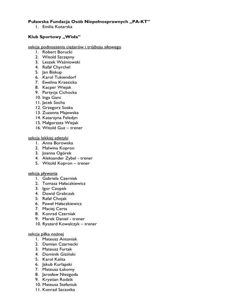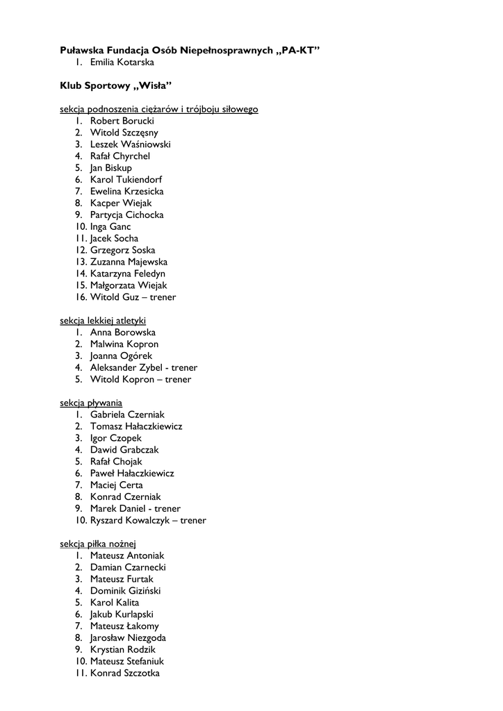Puławska Fundacja Osób Niepełnosprawnych „PA-KT” 1. Emilia Kotarska Klub Sportowy „Wisła” sekcja podnoszenia cięŜarów i trójboju siłowego 1. Robert Borucki 2. Witold Szczęsny 3. Leszek Waśniowski 4. Rafał Chyrchel 5. Jan Biskup 6. Karol Tukiendorf 7. Ewelina Krzesicka 8. Kacper Wiejak 9. Partycja Cichocka 10. Inga Ganc 11. Jacek Socha 12. Grzegorz Soska 13. Zuzanna Majewska 14. Katarzyna Feledyn 15. Małgorzata Wiejak 16. Witold Guz – trener sekcja lekkiej atletyki 1. Anna Borowska 2. Malwina Kopron 3. Joanna Ogórek 4. Aleksander Zybel - trener 5. Witold Kopron – trener sekcja pływania 1. Gabriela Czerniak 2. Tomasz Hałaczkiewicz 3. Igor Czopek 4. Dawid Grabczak 5. Rafał Chojak 6. Paweł Hałaczkiewicz 7. Maciej Certa 8. Konrad Czerniak 9. Marek Daniel - trener 10. Ryszard Kowalczyk – trener sekcja piłka noŜnej 1. Mateusz Antoniak 2. Damian Czarnecki 3. Mateusz Furtak 4. Dominik Giziński 5. Karol Kalita 6. Jakub Kurlapski 7. Mateusz Łakomy 8. Jarosław Niezgoda 9. Krystian Rodzik 10. Mateusz Stefaniuk 11. Konrad Szczotka 12. Kamila Śmich 13. Marcin Śliwiński 14. Dawid Świercz 15. Mateusz Tobiasz 16. Szymon Wiejak 17. Mirosław Banaszek – trener Uczniowski Klub Sportowy „Andros” 1. Jakub Olech 2. Mikołaj Krysa 3. Ewa Sulej 4. Mateusz Sadurski 5. Eryk Rodzik 6. Michał Bochenkiewicz 7. Patryk Rodzik 8. Filip Sosik 9. Marcin Bochenkiewicz - trener 10. Arkadiusz Gajos – trener Klub Sportowy „Centrum Tang Soo Do” 1. 2. 3. 4. 5. 6. 7. Damian Gębal Agnieszka Smolak Adrian Łbik Paweł Gil Sebastian Chudzik Marek Czapka Marcin Kostyra - trener 8. Krzysztof Chudzik – działacz Klub Sportowy „Pogoń” sekcja kolarska 1. Piotr Typek 2. Piotr Sztobryn 3. Przemysław Marek 4. Grzegorz Haba 5. Michał Podlaski sekcja piłki koszykowej 1. Marek Macieszczuk 2. Mateusz Wójcik 3. Paweł SzeleŜniak 4. Łukasz Norton Szkolny Klub Tenisowy „Smecz” 1. Marcin Kowal 2. Piotr Adamiak