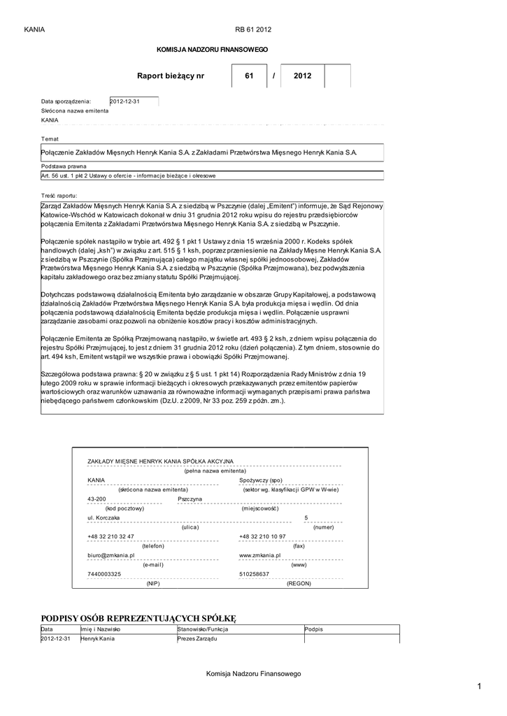 Nr 61/2012 - Połączenie Zakładów Mięsnych Henryk Kania S.A. z