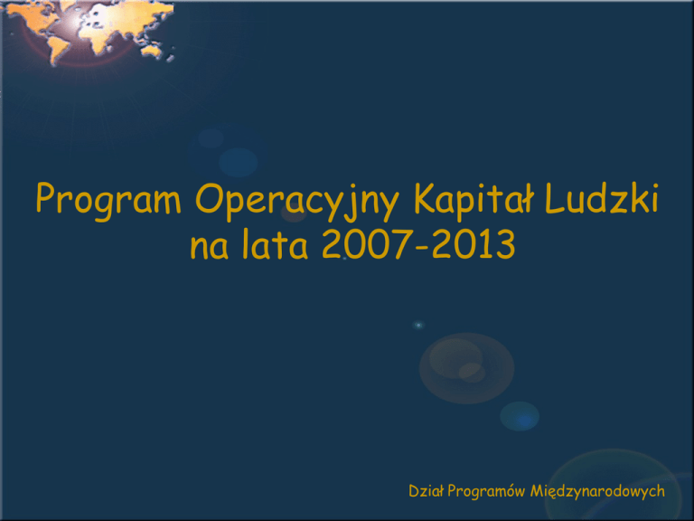 Program Operacyjny Kapitał Ludzki na lata 2007-2013 Dział Programów Międzynarodowych Program Operacyjny Kapitał Ludzki na lata 2007-2013 priorytety centralne Priorytet I Priorytet II Priorytet III Priorytet IV Priorytet V Priorytet X priorytety regionalne Priorytet VI Priorytet VII Priorytet VIII Priorytet IX Dział Programów Międzynarodowych Program Operacyjny Kapitał Ludzki na lata 2007-2013 STUDIA: PRIORYTET I Zatrudnienie i integracja społeczna Działanie 1.1 Wsparcie systemowe instytucji rynku pracy - Studia podyplomowe a także studia uzupełniające dla kadr publicznych służb zatrudnienia (w tym w szczególności kierowanych do pracowników kluczowych) oraz instytucji rynku pracy Instytucja pośrednicząca: Minister Pracy i Polityki Socjalnej Instytucja pośrednicząca II stopnia (wdrażająca): Centrum Rozwoju Zasobów Ludzkich Projekty systemowe: 2008r. Dział Programów Międzynarodowych Program Operacyjny Kapitał Ludzki na lata 2007-2013 STUDIA: PRIORYTET I Zatrudnienie i integracja społeczna Działanie 1.2 Wsparcie systemowe instytucji pomocy i integracji społecznej - Studia podyplomowe dla pracowników instytucji pomocy i integracji społecznej oraz administracji publicznej działających bezpośrednio w obszarze pomocy i integracji społecznej Instytucja pośrednicząca: Minister Pracy i Polityki Socjalnej Instytucja pośrednicząca II stopnia: Centrum Rozwoju Zasobów Ludzkich Projekty systemowe: 2008r. Dział Programów Międzynarodowych Program Operacyjny Kapitał Ludzki na lata 2007-2013 STUDIA: PRIORYTET II Rozwój zasobów ludzkich i potencjału adaptacyjnego przedsiębiorstw Działanie 2.1 Rozwój kadr nowoczesnej gospodarki - Studia podyplomowe dla przedsiębiorców oraz pracowników przedsiębiorstw delegowanych przez pracodawców częściowa odpłatność za studia: 20% pracownicy małych przedsiębiorstw 40% pracownicy średnich przedsiębiorstw Instytucja pośrednicząca: Minister Pracy i Polityki Socjalnej Instytucja pośrednicząca II stopnia: Polska Agencja Rozwoju Przedsiębiorczości Planowane pierwsze konkursy: drugi kwartał 2008r. Dział Programów Międzynarodowych Program Operacyjny Kapitał Ludzki na lata 2007-2013 STUDIA: PRIORYTET IV Szkolnictwo wyższe i nauka Działanie 4.1 Rozwój potencjału dydaktycznego uczelni -Opracowywanie programów i materiałów dydaktycznych oraz wdrożenie programów kształcenia w formie e-learningu (studia wyższe, podyplomowe, kursy) -Przygotowanie, otwieranie i realizacja nowych kierunków studiów -Dostosowanie programów na istniejących kierunkach studiów do potrzeb rynku pracy Instytucja pośrednicząca II stopnia: Minister Nauki i Szkolnictwa Wyższego Planowane pierwsze konkursy: drugi kwartał 2008r. Dział Programów Międzynarodowych Program Operacyjny Kapitał Ludzki na lata 2007-2013 STUDIA: PRIORYTET IX: Rozwój wykształcenia i kompetencji w regionach Działanie 9.4 Wysoko wykwalifikowane kadry systemu oświaty -Studia podyplomowe i kursy doskonalące dla nauczycieli w zakresie zgodnym z lokalną i regionalna polityką edukacyjną (w tym przygotowanie do nauczania drugiego przedmiotu lub rodzaju prowadzonych zajęć) -Studia podyplomowe, kursy i szkolenia oraz inne formy podwyższania kwalifikacji pracowników placówek kształcenia ustawicznego, praktycznego i doskonalenia zawodowego oraz instruktorów praktycznej nauki zawodu -Studia wyższe dla nauczycieli zainteresowanych podwyższeniem lub uzupełnieniem posiadanego wykształcenia -Studia podyplomowe i kursy doskonalące dla nauczycieli i pracowników administracji oświatowej w zakresie organizacji, zarządzania, finansowania oraz monitoringu działalności oświatowej Dział Programów Międzynarodowych Program Operacyjny Kapitał Ludzki na lata 2007-2013 STUDIA: PRIORYTET IX: Rozwój wykształcenia i kompetencji w regionach Działanie 9.4 Wysoko wykwalifikowane kadry systemu oświaty Instytucja pośrednicząca II stopnia: Wojewódzki Urząd Pracy w Krakowie Planowane pierwsze konkursy: styczeń 2008 roku Dział Programów Międzynarodowych Program Operacyjny Kapitał Ludzki na lata 2007-2013 SZKOLENIA: PRIORYTET II: Rozwój zasobów ludzkich i potencjału adaptacyjnego przedsiębiorstw Działanie 2.1 Rozwój kadr nowoczesnej gospodarki - Ogólnopolskie i ponadregionalne zamknięte projekty szkoleń (ogólnych i specjalistycznych) i doradztwa dla przedsiębiorców (lub grup przedsiębiorców) przygotowane w oparciu o indywidualne strategie rozwoju firm - Ogólnopolskie i ponadregionalne otwarte projekty szkoleń (ogólnych i specjalistycznych) i doradztwa dla pracowników przedsiębiorstw delegowanych przez pracodawców Instytucja pośrednicząca: Ministerstwo Pracy i Polityki Socjalnej Instytucja pośrednicząca II stopnia: Polska Agencja Rozwoju Przedsiębiorczości -Planowane pierwsze konkursy: drugi kwartał 2008r. Dział Programów Międzynarodowych Program Operacyjny Kapitał Ludzki na lata 2007-2013 SZKOLENIA: Priorytet IV Szkolnictwo wyższe i nauka Działanie 4.1 Rozwój potencjału dydaktycznego uczelni - Rozszerzenie oferty edukacyjnej uczelni o programy, kursy, zajęcia fakultatywne skierowane do studentów i słuchaczy oraz do osób zewnętrznych (zwiększenie roli szkolnictwa wyższego w kształceniu ustawicznym) - Organizowanie staży i szkoleń przydatnych dla prowadzenia pracy naukowo-badawczej i dydaktycznej w wiodących zagranicznych i krajowych ośrodkach akademickich i naukowobadawczych Instytucja pośrednicząca II stopnia: Minister Nauki i Szkolnictwa Wyższego Planowane pierwsze konkursy: drugi kwartał 2008 roku Dział Programów Międzynarodowych Program Operacyjny Kapitał Ludzki na lata 2007-2013 SZKOLENIA: Priorytet IV Szkolnictwo wyższe i nauka Działanie 4.1 Rozwój potencjału dydaktycznego uczelni - Podnoszenie kompetencji kadry akademickiej realizującej proces dydaktyczny w celu podwyższania jakości nauczania Instytucja pośrednicząca II stopnia: Minister Nauki i Szkolnictwa Wyższego Planowa