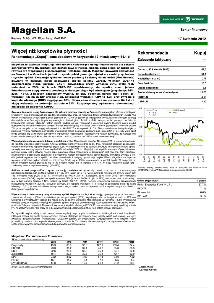 Magellan S.A. Sektor finansowy Reuters: MAGL.WA Bloomberg: MAG PW 17 kwietnia 2012 Więcej niŜ kroplówka płynności Rekomendacja Rekomendacja „Kupuj”, cena docelowa w horyzoncie 12-miesięcznym 64,1 zł Magellan to czołowa instytucja niebankowa świadcząca usługi finansowania dla sektora ochrony zdrowia (tj. szpitali i ich dostawców) w Polsce. Spółka coraz silniej angaŜuje się równieŜ we współpracę z samorządami i władzami miast. Magellan prowadzi działalność na Słowacji i w Czechach, jednak to rynek polski generuje największą część przychodów i zysków spółki. Ekspansja rynkowa, nowe produkty i sektory działalności (MedFinance) powinny w dalszym ciągu zapewniać spółce solidny wzrost. W latach 2007–11 średnioroczna stopa wzrostu (CAGR) przychodów grupy wynosiła 29%, zyski rosły natomiast o 23%. W latach 2012–15P spodziewamy się spadku marŜ, jednak średnioroczne stopy wzrostu powinny w dalszym ciągu być atrakcyjne (przychody: 24%, zyski: 18%). Z naszych szacunków wynika, Ŝe przy obecnym kursie akcji spółki jej wskaźnik P/E na 2012P wynosi 7,8x, natomiast wskaźnik P/BV to 1,3x przy zwrocie z kapitału własnego (ROE) sięgającym 18%. Nasza cena docelowa na poziomie 64,1 zł za akcję wskazuje na potencjał wzrostu o 51%. Rozpoczynamy wydawanie rekomendacji dla spółki od zalecenia KUPUJ. Zalecenie taktyczne Kupuj — Cena (zł, 13 kwietnia 2012) 42,5 Cena docelowa (zł) 64,1 Kapitalizacja (zł m) 277 Free float (%) 13,5 Liczba akcji (mln) Średni dzienny obrót (3 miesiące) 6,5 1 970 EURPLN 4.19 USDPLN 3.20 Czołowy dostawca usług finansowych dla sektora ochrony zdrowia w Polsce. Grupa Magellan oferuje szeroką gamę produktów i usług finansowych dla szpitali, ich dostawców oraz, od niedawna, takŜe samorządów lokalnych i władz miast. Rynek finansowania zobowiązań szpitali jest wart ok. 10 mld zł, jednak ze względu na swoją złoŜoność nie jest atrakcyjny dla banków oraz firm zajmujących się leasingiem i factoringiem. To takŜe efekt częstych zmian prawnych w dziedzinie finansowania szpitali. Magellan potrafi jednak szybko na nie reagować i oferować swoim klientom nowe produkty dostosowane do ich konkretnych potrzeb. Portfel aktywów grupy na koniec 2011 r. dawał jej udział w rynku na poziomie 7%, podczas gdy udział drugiej w kolejności spółki (MW Trade) wynosił ok. 3%. Nie przewidujemy Ŝadnych większych zmian na rynku w najbliŜszej przyszłości; ewentualna presja pojawi się zapewne pod koniec 2014/15 r., gdy wiele szpitali moŜe zmienić się z instytucji publicznych w podmioty niepubliczne. Jednocześnie naleŜy zauwaŜyć, Ŝe wartość rynku finansowania inwestycji, która obecnie wynosi ok. 1 mld zł, powinna do 2015 r. dwukrotnie wzrosnąć. Wysoki poziom zlewarowania bilansu upodabnia spółkę Magellan do banków. Na koniec 2011 r. stosunek aktywów do kapitału własnego spółki wynosił 4,1x (w sektorze bankowym średnia to ok. 11x), natomiast stosunek zobowiązań oprocentowanych do kapitału własnego sięgał 2,8x. W przeciwieństwie do banków, struktura finansowania spółki opiera się wyłącznie na instytucjach finansowych (23% to kredyty, 73% to obligacje) oraz kapitale własnym. Oprocentowanie aktywów grupy jest w głównej mierze stałe, natomiast stopa procentowa jej zobowiązań jest zmienna. Przy załoŜeniu niezmienności pozostałych czynników, 5-procentowy wzrost oprocentowania spowodowałby obniŜenie zysków o ok. 4%, jednak wysokie marŜe spółki, ostroŜne zarządzanie i hedging ograniczają ryzyko. Bilans Magellana cechuje się wysokim poziomem wykorzystania — poŜyczone środki są w 100% inwestowane w portfel spółki. W połączeniu z niskim kosztem ryzyka przekłada się to na solidne marŜe dla jej portfela (10–13% w ciągu ostatnich trzech lat) i znakomity zwrot z kapitału własnego (16–18%). Wykres mierzy zmianę ceny akcji w stosunku do indeksu WIG. Solidny wzrost przychodów i zysku na akcję powinien utrzymać się nawet przy naszych konserwatywnych16/04/2012, indeks WIG zamknął się na poziomie 40,605 załoŜeniach dotyczących portfela (wzrost o 8–15% r/r w latach 2012–15P w stosunku do wzrostu o 8–80% w latach 2008 11) i obniŜenia marŜ (7,2% w 2015 r. w stosunku do 10% w 2011 r.). Szacujemy, Ŝe w latach 2012–15P średnioroczna stopa wzrostu (CAGR) przychodów spółki wyniesie 24% (w latach 2007–11 było to 29%), natomiast zysk na akcję będzie rósł w tym okresie średnio o 18% rocznie (w latach 2007–11: 23%). Poziom lewarowania osiągnie prawdopodobnieGłówni akcjonariusze maksymalną wartość w 2013 r. (stosunek aktywów do kapitału własnego: 4,7x, stosunek zadłuŜenia netto do kapitałuPolish Enterprise Fund IV L.P.. własnego: 3,6x), jednak zakładane zatrzymanie całego zysku powinno zapewnić spółce wystarczające moŜliwości do PKO TFI. dalszego rozwoju bilansu. Pioneer IM Wyznaczamy 12-miesięczną cenę docelową spółki Magellan na 64,1 zł za akcję, opierając się przy tym metodzie zysków rezydualnych (50%) i wskaźników podobnych spółek (50%). Wynikający stąd potencjał wzrostu o 51% moŜ PZU AM wydawać się wygórowany, jednak dla naszej ceny docelowej wskaźniki Magellana na 2012P (P/E: 11,8x) wypadają tylko niewiele powyŜej obecnej średniej wskaźników spółek w grupie porównawczej. Uzasadnieniem dla wskaźnika P/BV na poziomie 2,0x jest natomiast 18-procentowy zwrot z kapitału własnego (ROE). Przy obecnej cenie akcji spółki jej wskaźnik P/E na 2012P wynosi 7,8x, P/BV to 1,3x, a wskaźnik EV/EBITDA sięga 21,3x (ten ostatni jednak pomijamy). Za czynniki ryzyka naleŜy uznać częste zmiany regulacji dotyczących zobowiązań szpitali i ogólne trudności strukturalne, z którymi zmaga się polski system ochrony zdrowia. Kolejnym czynnikiem, który naleŜy wziąć pod uwagę, jest ryzyko związane z pozyskiwaniem finansowania. UwaŜamy jednak, Ŝe odpowiednio uwzględniliśmy je w
