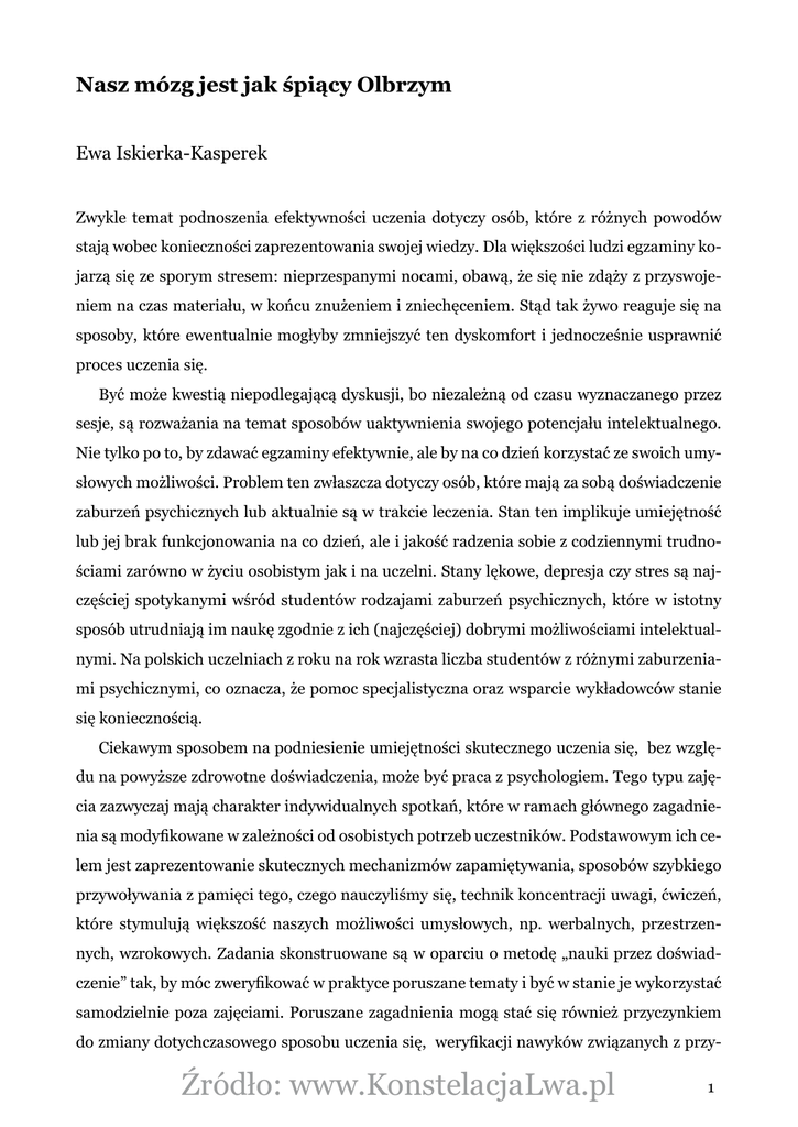 Nasz mózg jest jak śpiący Olbrzym Ewa Iskierka-Kasperek Zwykle temat podnoszenia efektywności uczenia dotyczy osób, które z różnych powodów stają wobec konieczności zaprezentowania swojej wiedzy. Dla większości ludzi egzaminy kojarzą się ze sporym stresem: nieprzespanymi nocami, obawą, że się nie zdąży z przyswojeniem na czas materiału, w końcu znużeniem i zniechęceniem. Stąd tak żywo reaguje się na sposoby, które ewentualnie mogłyby zmniejszyć ten dyskomfort i jednocześnie usprawnić proces uczenia się. Być może kwestią niepodlegającą dyskusji, bo niezależną od czasu wyznaczanego przez sesje, są rozważania na temat sposobów uaktywnienia swojego potencjału intelektualnego. Nie tylko po to, by zdawać egzaminy efektywnie, ale by na co dzień korzystać ze swoich umysłowych możliwości. Problem ten zwłaszcza dotyczy osób, które mają za sobą doświadczenie zaburzeń psychicznych lub aktualnie są w trakcie leczenia. Stan ten implikuje umiejętność lub jej brak funkcjonowania na co dzień, ale i jakość radzenia sobie z codziennymi trudnościami zarówno w życiu osobistym jak i na uczelni. Stany lękowe, depresja czy stres są najczęściej spotykanymi wśród studentów rodzajami zaburzeń psychicznych, które w istotny sposób utrudniają im naukę zgodnie z ich (najczęściej) dobrymi możliwościami intelektualnymi. Na polskich uczelniach z roku na rok wzrasta liczba studentów z różnymi zaburzeniami psychicznymi, co oznacza, że pomoc specjalistyczna oraz wsparcie wykładowców stanie się koniecznością. Ciekawym sposobem na podniesienie umiejętności skutecznego uczenia się, bez względu na powyższe zdrowotne doświadczenia, może być praca z psychologiem. Tego typu zajęcia zazwyczaj mają charakter indywidualnych spotkań, które w ramach głównego zagadnienia są modyfikowane w zależności od osobistych potrzeb uczestników. Podstawowym ich celem jest zaprezentowanie skutecznych mechanizmów zapamiętywania, sposobów szybkiego przywoływania z pamięci tego, czego nauczyliśmy się, technik koncentracji uwagi, ćwiczeń, które stymulują większość naszych możliwości umysłowych, np. werbalnych, przestrzennych, wzrokowych. Zadania skonstruowane są w oparciu o metodę „nauki przez doświadczenie” tak, by móc zweryfikować w praktyce poruszane tematy i być w stanie je wykorzystać samodzielnie poza zajęciami. Poruszane zagadnienia mogą stać się również przyczynkiem do zmiany dotychczasowego sposobu uczenia się, weryfikacji nawyków związanych z przy Źródło: www.KonstelacjaLwa.pl 1 gotowywaniem się do sesji: jak pory uczenia się, częstotliwości przerw, stosowanych używek (np. kawa), a nawet diety. Podczas zajęć poruszane jest też zagadnienie, które leży u podstaw wszelkiego sukcesu, czyli umiejętność wzbudzania motywacji do długotrwałego wysiłku umysłowego oraz radzenie sobie często z nadmiernym stresem. Ważne jest, by zbudować w sobie wewnętrzną postawę (chcę, wolę, widzę sens) i powiązać ją z determinacją do wykonania danej czynności. Tak kształtuje się zaangażowanie w realizację niekiedy mało interesujących, a nawet monotonnych zadań. Motywacja wewnętrzna może prowadzić też do specyficznego stanu umysłu, nazywanego w psychologii poczuciem przepływu (ang. flow). Daje on niezwykłe doznania intelektualne, wyzwala ogromny twórczy potencjał, ma się wrażenie pracy poza czasem. „3 Z” Najczęściej studenci narzekają na małą efektywność tzw. „kucia”, który realizuje się według wzoru „3 Z”, czyli zakuć, zdać, zapomnieć. Poza niską skutecznością realizowanego uczenia się dodatkowo „cierpi się” podczas tego procesu na nudę, która z czasem wyłącza działanie naszego mózgu. Uczymy się bez refleksji, niemalże „jak leci”. Dla mózgu wiele niepowiązanych ze sobą danych jest ciągiem nielogicznych informacji, które nie może odnieść do tego co już posiada, a więc nie widzi sensu, by je zapamiętać. Nie mając możliwości praktycznego ich zastosowania, traktuje je jak tzw. luźne treści, a więc trudne do wyuczenia się. Sposobem na podążanie z pragmatyzmem umysłu jest porządkowania wiedzy, której się uczymy, a następnie logiczne skojarzenie wszystkich informacji ze sobą. Potrzebny stres Myślenie o konieczności rozpoczęcia nauki rodzi spory stres, który w efekcie utrudnia, spowalnia, a niekiedy nawet uniemożliwia uczenie się. Z wywiadu ze studentami wynika, że jest znaczna grupa osób, którą ten stan wręcz „obezwładnia” i jest powodem porażek podczas egzaminów. Stres jednak nie musi być negatywny. Mało tego, bez niego trudno byłoby nam żyć. Istnieje bowiem tzw. pozytywny stres, nazywany eustresem, którego doświadczamy jako pobudzenie. Mobilizuje nas do działania, pozwala nam nie nudzić się, utrzymywać motywację do realizacji jakiegokolwiek zadań. Natomiast w życiu rzeczywiście występuje szkodliwy dla nas rodzaj stresu zwany dystresem. Za jego sprawą w hipokampie, czyli centrum zapa 2 Źródło: www.KonstelacjaLwa.pl miętywania i uczenia się, zostaje uwalniany hormon o nazwie kortykoliberyna (CRH ). Ma on działanie wysoko destrukcyjne w naszych synapsach, które przecież poprzez tworzenie nowych połączeń między sobą stanowią podstawę procesu uczenia się. Wniosek z tego dla efektywności zapamiętywania jest prosty – dbajmy o wzbudzanie w sobie emocji na optymalnym poziomie, by brak, jak i nadmiar stresu nie wpłynął negatywnie na nasze działanie. Studenci bardzo często prezentują opinię, że podczas egzaminu sprawdza się wiedzę rozumianą jako 10% nauki a 90% umiejętności wykorzystania nabytych już informacji. Stanowi to podstawę bardzo interesującej tezy kolektywizmu, która wychodzi z założenia, że ludzka wiedza nie musi być w całości skompensowana w głowie. Ilość informacji, która zalewa nas codziennie, jej zmienność sprawia, że st