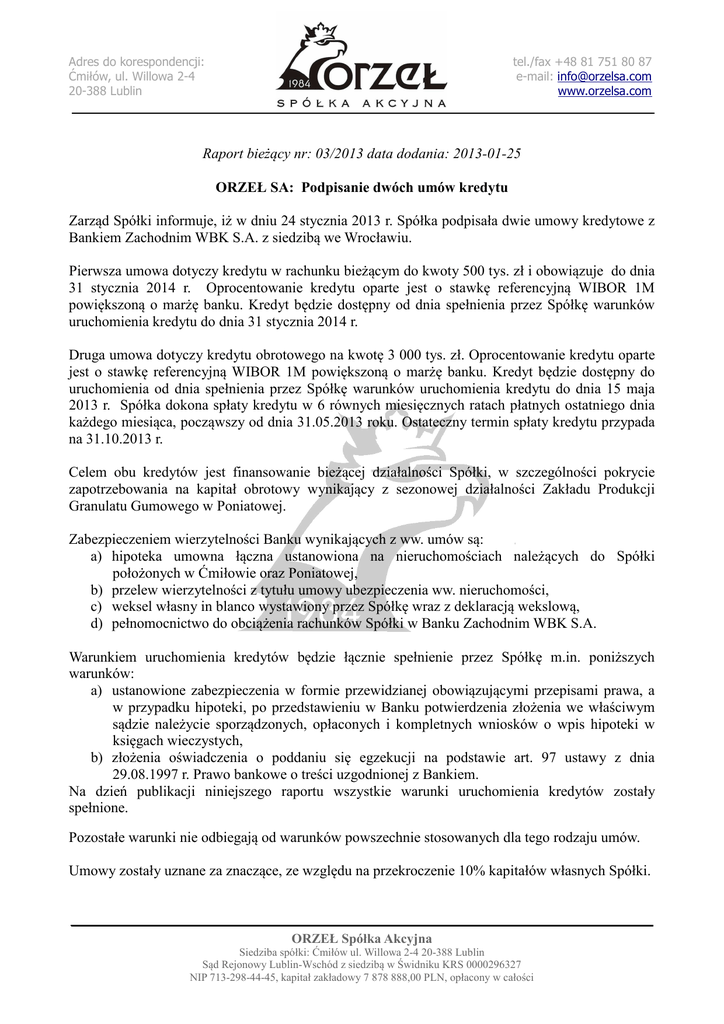 Adres do korespondencji: Ćmiłów, ul. Willowa 2-4 20-388 Lublin tel./fax +48 81 751 80 87 e-mail: [email protected] www.orzelsa.com Raport bieżący nr: 03/2013 data dodania: 2013-01-25 ORZEŁ SA: Podpisanie dwóch umów kredytu Zarząd Spółki informuje, iż w dniu 24 stycznia 2013 r. Spółka podpisała dwie umowy kredytowe z Bankiem Zachodnim WBK S.A. z siedzibą we Wrocławiu. Pierwsza umowa dotyczy kredytu w rachunku bieżącym do kwoty 500 tys. zł i obowiązuje do dnia 31 stycznia 2014 r. Oprocentowanie kredytu oparte jest o stawkę referencyjną WIBOR 1M powiększoną o marżę banku. Kredyt będzie dostępny od dnia spełnienia przez Spółkę warunków uruchomienia kredytu do dnia 31 stycznia 2014 r. Druga umowa dotyczy kredytu obrotowego na kwotę 3 000 tys. zł. Oprocentowanie kredytu oparte jest o stawkę referencyjną WIBOR 1M powiększoną o marżę banku. Kredyt będzie dostępny do uruchomienia od dnia spełnienia przez Spółkę warunków uruchomienia kredytu do dnia 15 maja 2013 r. Spółka dokona spłaty kredytu w 6 równych miesięcznych ratach płatnych ostatniego dnia każdego miesiąca, począwszy od dnia 31.05.2013 roku. Ostateczny termin spłaty kredytu przypada na 31.10.2013 r. Celem obu kredytów jest finansowanie bieżącej działalności Spółki, w szczególności pokrycie zapotrzebowania na kapitał obrotowy wynikający z sezonowej działalności Zakładu Produkcji Granulatu Gumowego w Poniatowej. Zabezpieczeniem wierzytelności Banku wynikających z ww. umów są: a) hipoteka umowna łączna ustanowiona na nieruchomościach należących do Spółki położonych w Ćmiłowie oraz Poniatowej, b) przelew wierzytelności z tytułu umowy ubezpieczenia ww. nieruchomości, c) weksel własny in blanco wystawiony przez Spółkę wraz z deklaracją wekslową, d) pełnomocnictwo do obciążenia rachunków Spółki w Banku Zachodnim WBK S.A. Warunkiem uruchomienia kredytów będzie łącznie spełnienie przez Spółkę m.in. poniższych warunków: a) ustanowione zabezpieczenia w formie przewidzianej obowiązującymi przepisami prawa, a w przypadku hipoteki, po przedstawieniu w Banku potwierdzenia złożenia we właściwym sądzie należycie sporządzonych, opłaconych i kompletnych wniosków o wpis hipoteki w księgach wieczystych, b) złożenia oświadczenia o poddaniu się egzekucji na podstawie art. 97 ustawy z dnia 29.08.1997 r. Prawo bankowe o treści uzgodnionej z Bankiem. Na dzień publikacji niniejszego raportu wszystkie warunki uruchomienia kredytów zostały spełnione. Pozostałe warunki nie odbiegają od warunków powszechnie stosowanych dla tego rodzaju umów. Umowy zostały uznane za znaczące, ze względu na przekroczenie 10% kapitałów własnych Spółki. ORZEŁ Spółka Akcyjna Siedziba spółki: Ćmiłów ul. Willowa 2-4 20-388 Lublin Sąd Rejonowy Lublin-Wschód z siedzibą w Świdniku KRS 0000296327 NIP 713-298-44-45, kapitał zakładowy 7 878 888,00 PLN, opłacony w całości Adres do korespondencji: Ćmiłów, ul. Willowa 2-4 20-388 Lublin tel./fax +48 81 751 80 87 e-mail: [email protected] www.orzelsa.com Ponadto Spółka informuje, iż w dniu 24 stycznia 2013 r. podpisała aneks do umowy o kredyt obrotowy z dnia 6 kwietnia 2012 r. z pózn. zm. udzielonego w kwocie 2.500 tys. zł na okres 5 lat, o zawarciu którego Spółka informowała w raporcie RB nr 21/2012 z dnia 10 kwietnia 2012 r. Przedmiotem ww. aneksu jest ujednolicenie prawnych zabezpieczeń spłaty wszystkich trzech umów kredytowych zawartych pomiędzy Spółką a Bankiem Zachodnim WBK S.A. W ocenie Zarządu, podpisanie powyższych umów, pomimo pogorszenia wyników finansowych w 2012 roku, uprawdopodabnia uzyskanie satysfakcjonujących wyników finansowych w 2013 roku. Podstawa prawna: § 3 ust. 2 pkt 2 Załącznika Nr 3 do Regulaminu Alternatywnego Systemu Obrotu ,,Informacje bieżące i okresowe przekazywane w Alternatywnym Systemie Obrotu na rynku NewConnect". Osoby reprezentujące spółkę: Jacek Orzeł - Prezes Zarządu ORZEŁ Spółka Akcyjna Siedziba spółki: Ćmiłów ul. Willowa 2-4 20-388 Lublin Sąd Rejonowy Lublin-Wschód z siedzibą w Świdniku KRS 0000296327 NIP 713-298-44-45, kapitał zakładowy 7 878 888,00 PLN, opłacony w całości