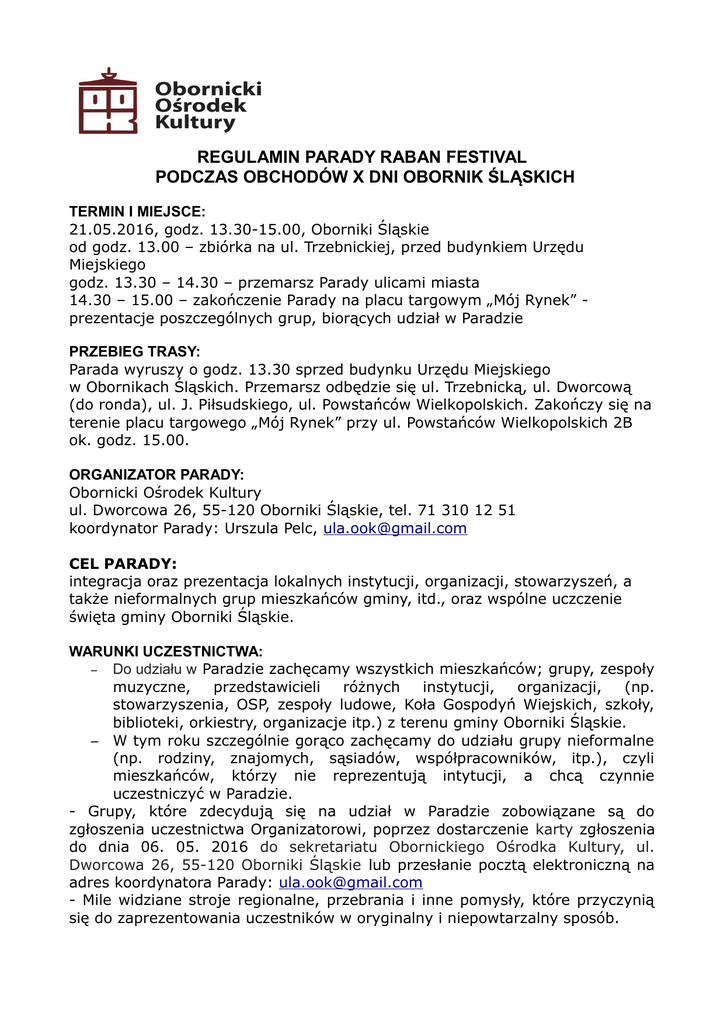 REGULAMIN PARADY RABAN FESTIVAL PODCZAS OBCHODÓW X DNI OBORNIK ŚLĄSKICH TERMIN I MIEJSCE: 21.05.2016, godz. 13.30-15.00, Oborniki Śląskie od godz. 13.00 – zbiórka na ul. Trzebnickiej, przed budynkiem Urzędu Miejskiego godz. 13.30 – 14.30 – przemarsz Parady ulicami miasta 14.30 – 15.00 – zakończenie Parady na placu targowym „Mój Rynek” prezentacje poszczególnych grup, biorących udział w Paradzie PRZEBIEG TRASY: Parada wyruszy o godz. 13.30 sprzed budynku Urzędu Miejskiego w Obornikach Śląskich. Przemarsz odbędzie się ul. Trzebnicką, ul. Dworcową (do ronda), ul. J. Piłsudskiego, ul. Powstańców Wielkopolskich. Zakończy się na terenie placu targowego „Mój Rynek” przy ul. Powstańców Wielkopolskich 2B ok. godz. 15.00. ORGANIZATOR PARADY: Obornicki Ośrodek Kultury ul. Dworcowa 26, 55-120 Oborniki Śląskie, tel. 71 310 12 51 koordynator Parady: Urszula Pelc, [email protected] CEL PARADY: integracja oraz prezentacja lokalnych instytucji, organizacji, stowarzyszeń, a także nieformalnych grup mieszkańców gminy, itd., oraz wspólne uczczenie święta gminy Oborniki Śląskie. WARUNKI UCZESTNICTWA: – Do udziału w Paradzie zachęcamy wszystkich mieszkańców; grupy, zespoły muzyczne, przedstawicieli różnych instytucji, organizacji, (np. stowarzyszenia, OSP, zespoły ludowe, Koła Gospodyń Wiejskich, szkoły, biblioteki, orkiestry, organizacje itp.) z terenu gminy Oborniki Śląskie. – W tym roku szczególnie gorąco zachęcamy do udziału grupy nieformalne (np. rodziny, znajomych, sąsiadów, współpracowników, itp.), czyli mieszkańców, którzy nie reprezentują intytucji, a chcą czynnie uczestniczyć w Paradzie. - Grupy, które zdecydują się na udział w Paradzie zobowiązane są do zgłoszenia uczestnictwa Organizatorowi, poprzez dostarczenie karty zgłoszenia do dnia 06. 05. 2016 do sekretariatu Obornickiego Ośrodka Kultury, ul. Dworcowa 26, 55-120 Oborniki Śląskie lub przesłanie pocztą elektroniczną na adres koordynatora Parady: [email protected] - Mile widziane stroje regionalne, przebrania i inne pomysły, które przyczynią się do zaprezentowania uczestników w oryginalny i niepowtarzalny sposób. ZASADY BEZPIECZEŃSTWA: - Uczestnicy Parady są zobowiązani do przestrzegania poleceń wydawanych przez służby porządkowe i organizatorów Parady. - Zobowiązuje się uczestników Parady do szczególnej ostrożności podczas trwania całej imprezy, w celu zachowania bezpieczeństwa wszystkich obecnych. - Uczestnicy Parady są zobowiązani do zachowań zgodnych z zasadami współżycia społecznego, w szczególności do udzielania pomocy osobom jej potrzebującym. - Zabrania się wnoszenia na teren Parady: alkoholu/ bądź pozostawania pod jego wpływem/, niebezpiecznych narzędzi itp. - Ruchem Parady kierują służby porządkowe. – Organizator zapewnia opiekę medyczną na czas trwania parady. – W trosce o komfort naszych czworonogów oraz z uwagi na hałas i dużą ilość osób prosimy o nie zabieranie ze sobą zwierząt. ZASADY KONTROLI OSÓB I POJAZDÓW NA TERENIE ORGANIZOWANEJ IMPREZY - Służba porządkowa, w uzasadnionych przypadkach, ma prawo żądać od osób przebywających w miejscach organizowanej Parady okazania dowodu tożsamości oraz prawo interweniowania w stosunku do osób, które stwarzają zagrożenie dla bezpieczeństwa imprezy (stan wskazujący na pozostawanie pod wpływem środków odurzających lub wpływem alkoholu). - Organizator ma prawo wydalenia poza teren imprezy osób niepoddających się kontroli przez służby porządkowe, nietrzeźwych lub stwarzających ryzyko spowodowania niebezpieczeństwa. - Organizator Parady i służba porządkowa mają wyłączne prawo do wyrażenia zgody na wjazd pojazdów w obszar wyznaczony do organizowania Parady. Wyjątkiem są okoliczności nadzwyczajne tj. działania ratownicze i interwencyjne, prowadzone w sytuacji zagrożenia bezpieczeństwa na tym terenie. UWAGI KOŃCOWE: - Organizator zastrzega sobie prawo do wprowadzania zmian w regulaminie. - Wszyscy zgłoszeni uczestnicy Parady zostaną poinformowani o zmianach w regulaminie. - Wszelkich informacji dotyczących Parady udziela koordynator Parady pod nr tel. 71 310 12 51 oraz drogą mailową pod adresem [email protected]