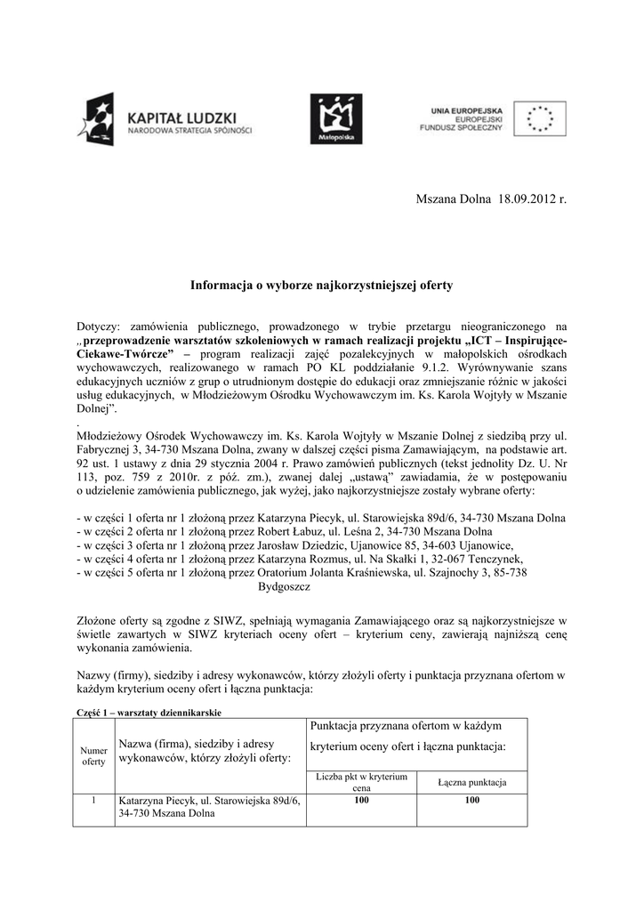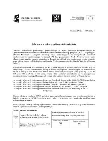 Mszana Dolna 18.09.2012 r. Informacja o wyborze najkorzystniejszej oferty Dotyczy: zamówienia publicznego, prowadzonego w trybie przetargu nieograniczonego na „przeprowadzenie warsztatów szkoleniowych w ramach realizacji projektu „ICT – InspirująceCiekawe-Twórcze” – program realizacji zajęć pozalekcyjnych w małopolskich ośrodkach wychowawczych, realizowanego w ramach PO KL poddziałanie 9.1.2. Wyrównywanie szans edukacyjnych uczniów z grup o utrudnionym dostępie do edukacji oraz zmniejszanie różnic w jakości usług edukacyjnych, w Młodzieżowym Ośrodku Wychowawczym im. Ks. Karola Wojtyły w Mszanie Dolnej”. . Młodzieżowy Ośrodek Wychowawczy im. Ks. Karola Wojtyły w Mszanie Dolnej z siedzibą przy ul. Fabrycznej 3, 34-730 Mszana Dolna, zwany w dalszej części pisma Zamawiającym, na podstawie art. 92 ust. 1 ustawy z dnia 29 stycznia 2004 r. Prawo zamówień publicznych (tekst jednolity Dz. U. Nr 113, poz. 759 z 2010r. z póź. zm.), zwanej dalej „ustawą” zawiadamia, że w postępowaniu o udzielenie zamówienia publicznego, jak wyżej, jako najkorzystniejsze zostały wybrane oferty: - w części 1 oferta nr 1 złożoną przez Katarzyna Piecyk, ul. Starowiejska 89d/6, 34-730 Mszana Dolna - w części 2 oferta nr 1 złożoną przez Robert Łabuz, ul. Leśna 2, 34-730 Mszana Dolna - w części 3 oferta nr 1 złożoną przez Jarosław Dziedzic, Ujanowice 85, 34-603 Ujanowice, - w części 4 oferta nr 1 złożoną przez Katarzyna Rozmus, ul. Na Skałki 1, 32-067 Tenczynek, - w części 5 oferta nr 1 złożoną przez Oratorium Jolanta Kraśniewska, ul. Szajnochy 3, 85-738 Bydgoszcz Złożone oferty są zgodne z SIWZ, spełniają wymagania Zamawiającego oraz są najkorzystniejsze w świetle zawartych w SIWZ kryteriach oceny ofert – kryterium ceny, zawierają najniższą cenę wykonania zamówienia. Nazwy (firmy), siedziby i adresy wykonawców, którzy złożyli oferty i punktacja przyznana ofertom w każdym kryterium oceny ofert i łączna punktacja: Część 1 – warsztaty dziennikarskie Punktacja przyznana ofertom w każdym Numer oferty 1 Nazwa (firma), siedziby i adresy wykonawców, którzy złożyli oferty: Katarzyna Piecyk, ul. Starowiejska 89d/6, 34-730 Mszana Dolna kryterium oceny ofert i łączna punktacja: Liczba pkt w kryterium cena 100 Łączna punktacja 100 Część 2 – warsztaty fotograficzne Punktacja przyznana ofertom w każdym Numer oferty 1 Nazwa (firma), siedziby i adresy wykonawców, którzy złożyli oferty: Robert Łabuz, ul. Leśna 2, 34-730 Mszana Dolna kryterium oceny ofert i łączna punktacja: Liczba pkt w kryterium cena 100 Łączna punktacja 100 Część 3 – warsztaty medialne Punktacja przyznana ofertom w każdym Numer oferty 1 Nazwa (firma), siedziby i adresy wykonawców, którzy złożyli oferty: Jarosław Dziedzic, Ujanowice 85, 34-603 Ujanowice kryterium oceny ofert i łączna punktacja: Liczba pkt w kryterium cena 100 Łączna punktacja 100 Część 4 – warsztaty językowe w ramach koła języka angielskiego Punktacja przyznana ofertom w każdym Numer oferty 1 Nazwa (firma), siedziby i adresy wykonawców, którzy złożyli oferty: Katarzyna Rozmus, ul. Na Skałki 1, 32067 Tenczynek kryterium oceny ofert i łączna punktacja: Liczba pkt w kryterium cena 100 Łączna punktacja 100 Część 5 – warsztaty etyczno-moralne Punktacja przyznana ofertom w każdym Numer oferty 1 Nazwa (firma), siedziby i adresy wykonawców, którzy złożyli oferty: Oratorium-Jolanta Kraśniewska, ul Szajnochy 3, 85-738 Bydgoszcz kryterium oceny ofert i łączna punktacja: Liczba pkt w kryterium cena 100,00 Łączna punktacja 100,00