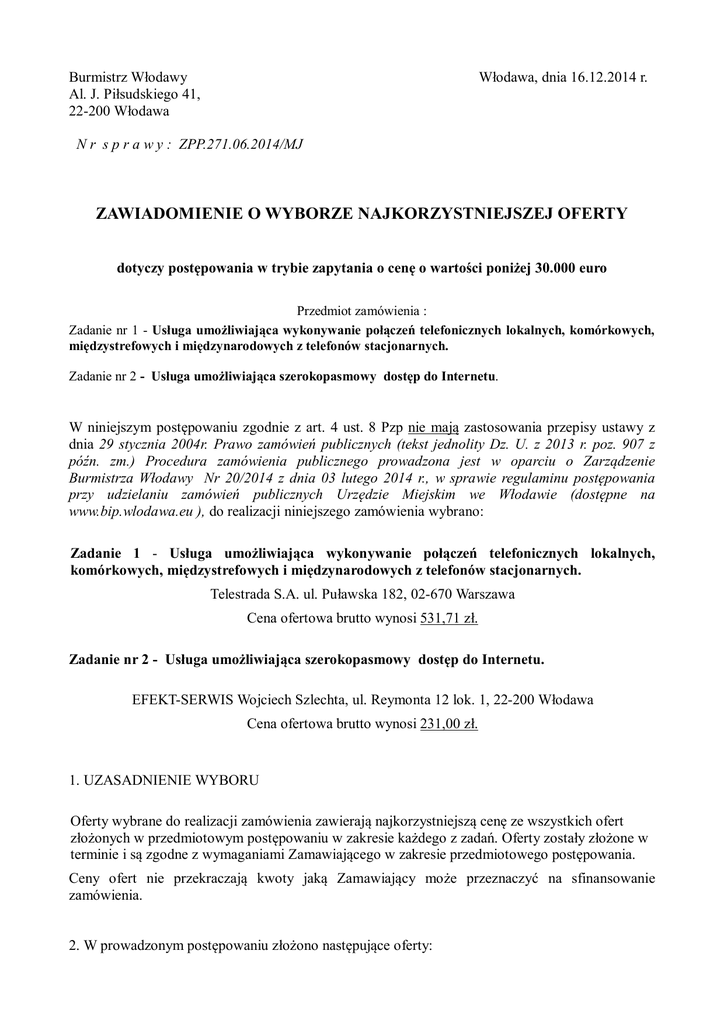 Burmistrz Włodawy Al. J. Piłsudskiego 41, 22-200 Włodawa Włodawa, dnia 16.12.2014 r. N r s p r a w y : ZPP.271.06.2014/MJ ZAWIADOMIENIE O WYBORZE NAJKORZYSTNIEJSZEJ OFERTY dotyczy postępowania w trybie zapytania o cenę o wartości poniżej 30.000 euro Przedmiot zamówienia : Zadanie nr 1 - Usługa umożliwiająca wykonywanie połączeń telefonicznych lokalnych, komórkowych, międzystrefowych i międzynarodowych z telefonów stacjonarnych. Zadanie nr 2 - Usługa umożliwiająca szerokopasmowy dostęp do Internetu. W niniejszym postępowaniu zgodnie z art. 4 ust. 8 Pzp nie mają zastosowania przepisy ustawy z dnia 29 stycznia 2004r. Prawo zamówień publicznych (tekst jednolity Dz. U. z 2013 r. poz. 907 z późn. zm.) Procedura zamówienia publicznego prowadzona jest w oparciu o Zarządzenie Burmistrza Włodawy Nr 20/2014 z dnia 03 lutego 2014 r., w sprawie regulaminu postępowania przy udzielaniu zamówień publicznych Urzędzie Miejskim we Włodawie (dostępne na www.bip.wlodawa.eu ), do realizacji niniejszego zamówienia wybrano: Zadanie 1 - Usługa umożliwiająca wykonywanie połączeń telefonicznych lokalnych, komórkowych, międzystrefowych i międzynarodowych z telefonów stacjonarnych. Telestrada S.A. ul. Puławska 182, 02-670 Warszawa Cena ofertowa brutto wynosi 531,71 zł. Zadanie nr 2 - Usługa umożliwiająca szerokopasmowy dostęp do Internetu. EFEKT-SERWIS Wojciech Szlechta, ul. Reymonta 12 lok. 1, 22-200 Włodawa Cena ofertowa brutto wynosi 231,00 zł. 1. UZASADNIENIE WYBORU Oferty wybrane do realizacji zamówienia zawierają najkorzystniejszą cenę ze wszystkich ofert złożonych w przedmiotowym postępowaniu w zakresie każdego z zadań. Oferty zostały złożone w terminie i są zgodne z wymaganiami Zamawiającego w zakresie przedmiotowego postępowania. Ceny ofert nie przekraczają kwoty jaką Zamawiający może przeznaczyć na sfinansowanie zamówienia. 2. W prowadzonym postępowaniu złożono następujące oferty: OFERTA NR 1 - złożona przez: Telestrada S.A. ul. Puławska 182, 02-670 Warszawa Dane o warunkach oferty: Oferta została złożona na zadanie nr 1. Cena ofertowa brutto wynosi 531,71 zł. OFERTA NR 2 - złożona przez: Telekomunikacja Wschód Spółka z o. o. ul. Żeromskiego 23, 22-200 Włodawa Dane o warunkach oferty: Oferta została złożona na zadanie nr 2. Cena ofertowa brutto wynosi 340,00 zł. OFERTA NR 3 - złożona przez: ELEKTORBIT Krzysztof Pałka, Al. Jana Pawła II5, 22-200 Włodawa Dane o warunkach oferty: Oferta została złożona na zadanie nr 1. Cena ofertowa brutto wynosi 541,49 zł. Oferta została złożona na zadanie nr 2. Cena ofertowa brutto wynosi 489,00 zł. OFERTA NR 4 - złożona przez: EFEKT-SERWIS Wojciech Szlechta, Ul. Reymonta 12 lok. 1, 22-200 Włodawa Dane o warunkach oferty: Oferta została złożona na zadanie nr 1. Cena ofertowa brutto wynosi 628,50 zł. Oferta została złożona na zadanie nr 2. Cena ofertowa brutto wynosi 231,00 zł. BURMISTRZ WŁODAWY Wiesław Muszyński